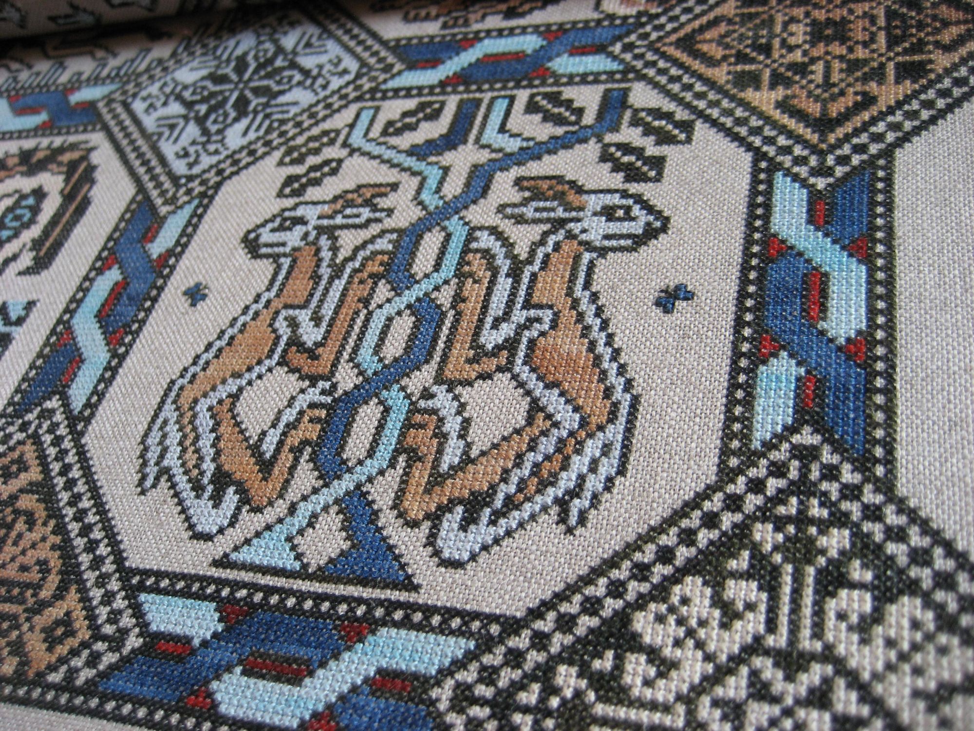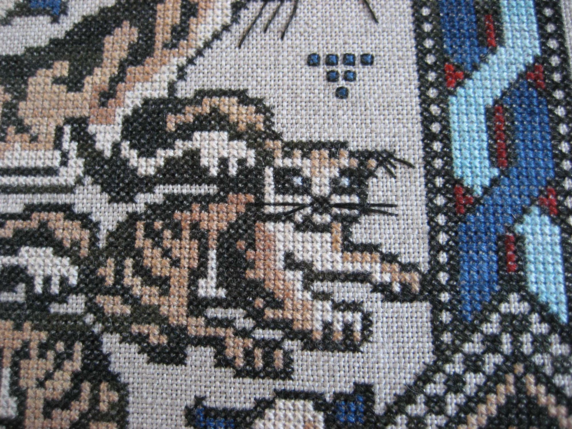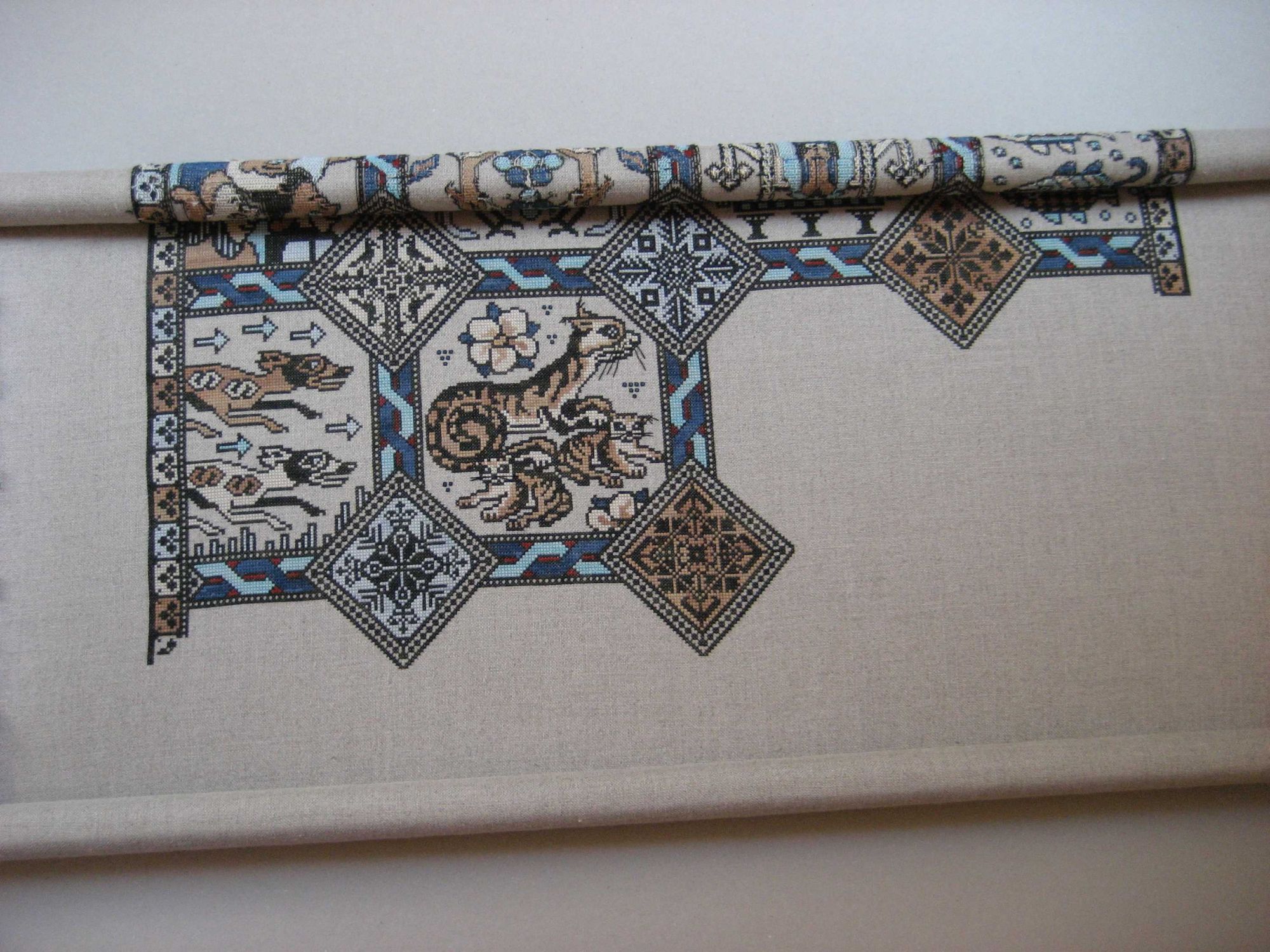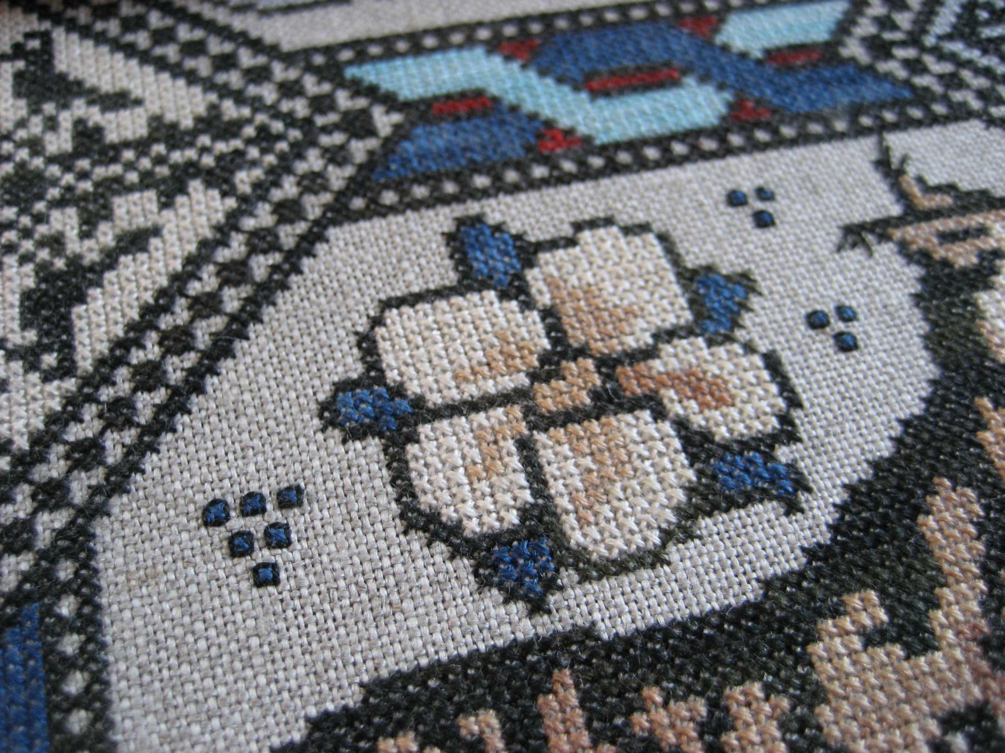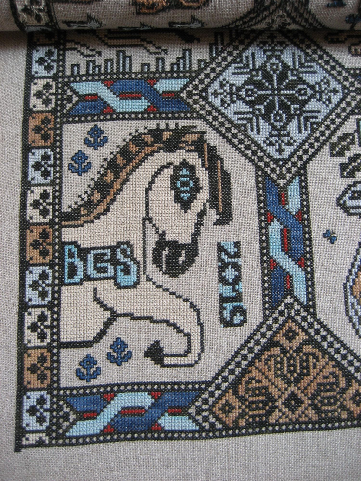 22 августа 2019 Всем доброго дня! Сделаю вид, что не пропадала надолго из своей темы и покажу свои продвижения в сэмплере Опус Магнуссона. Напомню, что вышиваю на льне 40 каунта в одну нить. Герои сегодняшнего дня - черепахоподобная птица, летающая собака, голубоглазая лошадка и зайцы во фраках. Итак, было: Стало: И продолжение: На лошадке мои инициалы, а рядышком - актуальная дата (год). С инициалами пришлось немного повозиться, чтобы нарисовать что-то более-менее похожее по стилю на исходник, с цифрам проще - всего лишь нарисовать единицу вместо нуля, ну и девятку чуть подправила. Проще всего вышивалась именно лошадка, хотя и медленнее, чем остальные картинки - это из-за большого пространства, зашиваемого одним цветом. Пришлось пыхтеть над каждым крестиком, тщательно регулируя натяжение нити, но как я не старалась, все равно явно просматриваются ряды туда-обратно из-за разного наклона крестиков. У меня такая же ерунда получается при вязании на спицах: если идет гладкая вязка, то явная полосатость наблюдается. Если честно, сэмплер мне уже поднадоел, хотя и очень к нему привязалась. Буду скучать, когда закончу. Больше всего надоедает вышивать повторяющийся орнамент - сетку. Картинки куда веселее движутся. Прямо праздник для меня каждый раз )) Небольшое количество цветов, как ни странно, не утомляет. Наверное потому, что цветовая гамма спокойная, да и интенсивность окраски нити все время меняется, не дает скучать. Напомню, нити - хлопок ручного крашения. Больше всего в деле переходы цвета заметны на карамельно-коричневых, меньше - на бирюзовых (хорошо видно на инициалах) и синих, почти не видны на бледно-голубых и совсем их нет на бежевых. Черные - совсем другая история. Они черные с зеленым отливом, недаром называются Raven (Ворон). Последняя пара мотков, что в работе, прямо совсем зеленые. Думала, что будут сильно выделяться на общем фоне, ан нет, также смотрятся черными в вышивке. Фото не передает эти зеленые переливы, но мне очень нравится. Обратите внимание, какие милипизерные бабочки рядом с зайцами, Прямо улыбнуло )) А зайцы непонятные какие-то. На дубе (!) То ли ноги у них вывернутые, то ли еще что. В общем для себя решила, что они во фраках )) А какие ягодки рядом с черепахоподобной птицей? Очень мне гжель напоминают. Работы впереди еще полно. Осталось вышить бородатую щуку и вторую толпу мужиков, а затем широкую полосу орнамента. И тогда будет усе )) Спасибо всем, кто зашел и прочитал мою писанину. Всем легких крестиков! Nat717, Irina 1, татьяна0674 и 32 других сказали спасибо Поделиться сообщением Ссылка на сообщение