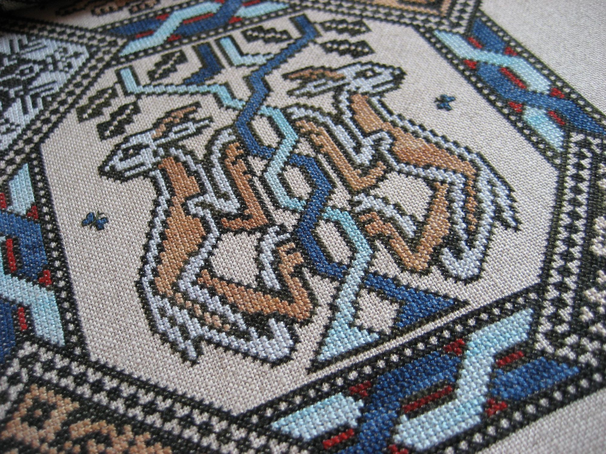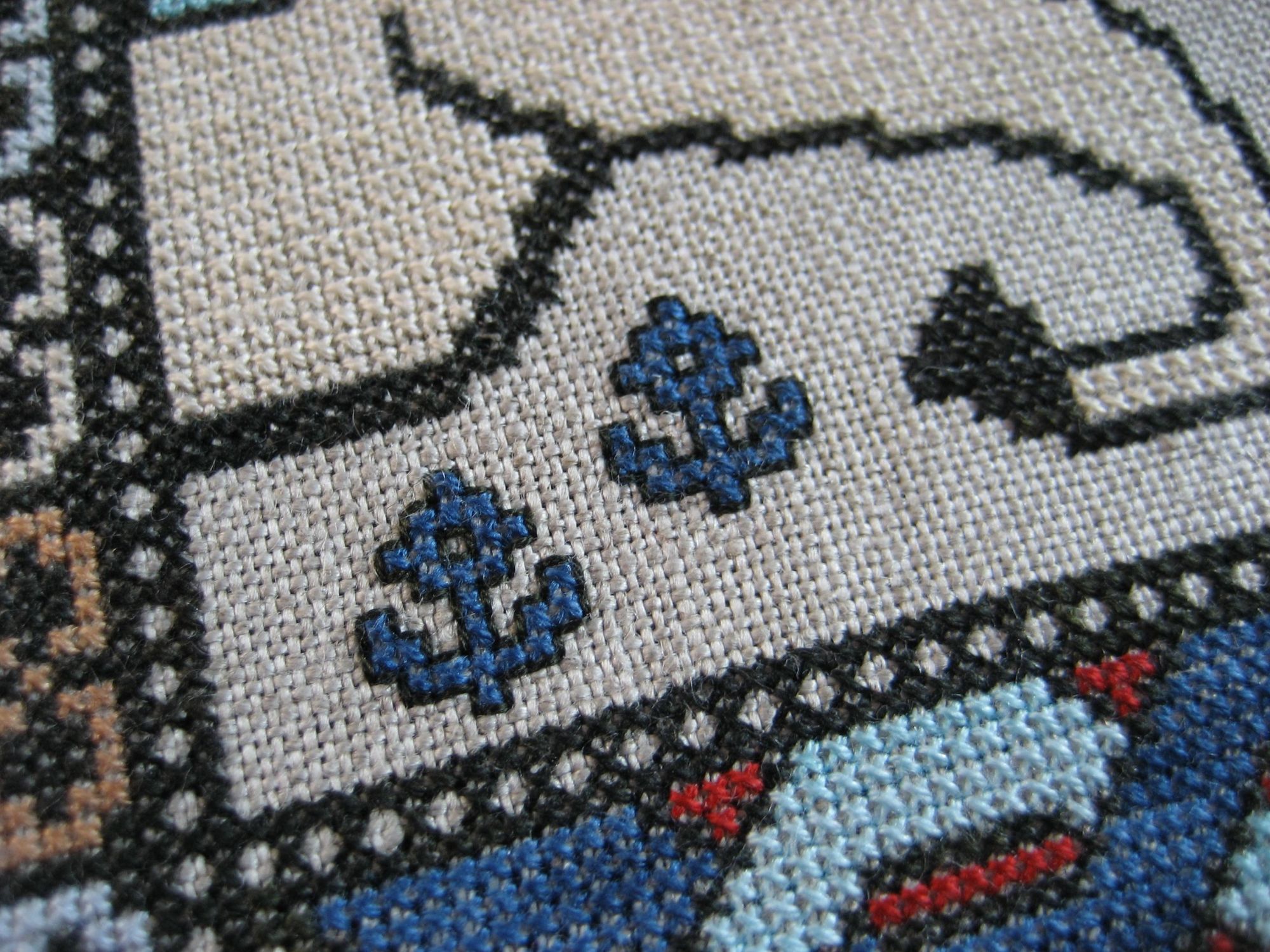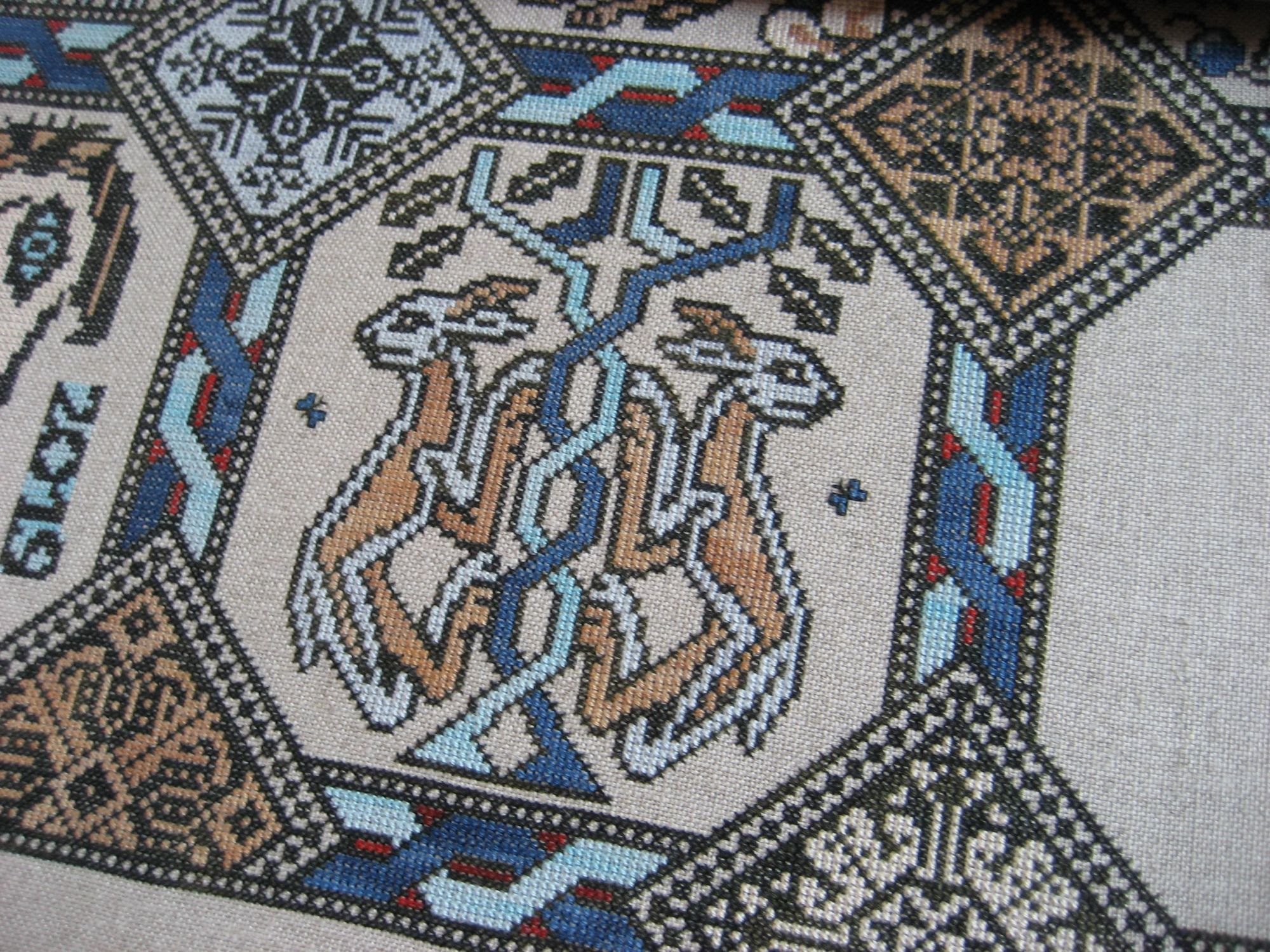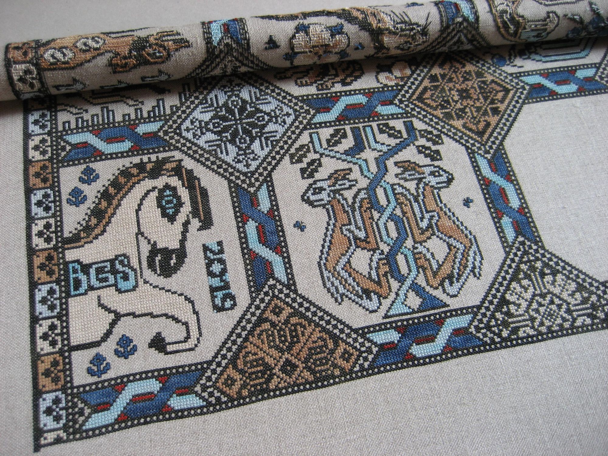 22 августа 2019 Всем доброго дня! Сделаю вид, что не пропадала надолго из своей темы и покажу свои продвижения в сэмплере Опус Магнуссона. Напомню, что вышиваю на льне 40 каунта в одну нить. Герои сегодняшнего дня - черепахоподобная птица, летающая собака, голубоглазая лошадка и зайцы во фраках. Итак, было: Стало: И продолжение: На лошадке мои инициалы, а рядышком - актуальная дата (год). С инициалами пришлось немного повозиться, чтобы нарисовать что-то более-менее похожее по стилю на исходник, с цифрам проще - всего лишь нарисовать единицу вместо нуля, ну и девятку чуть подправила. Проще всего вышивалась именно лошадка, хотя и медленнее, чем остальные картинки - это из-за большого пространства, зашиваемого одним цветом. Пришлось пыхтеть над каждым крестиком, тщательно регулируя натяжение нити, но как я не старалась, все равно явно просматриваются ряды туда-обратно из-за разного наклона крестиков. У меня такая же ерунда получается при вязании на спицах: если идет гладкая вязка, то явная полосатость наблюдается. Если честно, сэмплер мне уже поднадоел, хотя и очень к нему привязалась. Буду скучать, когда закончу. Больше всего надоедает вышивать повторяющийся орнамент - сетку. Картинки куда веселее движутся. Прямо праздник для меня каждый раз )) Небольшое количество цветов, как ни странно, не утомляет. Наверное потому, что цветовая гамма спокойная, да и интенсивность окраски нити все время меняется, не дает скучать. Напомню, нити - хлопок ручного крашения. Больше всего в деле переходы цвета заметны на карамельно-коричневых, меньше - на бирюзовых (хорошо видно на инициалах) и синих, почти не видны на бледно-голубых и совсем их нет на бежевых. Черные - совсем другая история. Они черные с зеленым отливом, недаром называются Raven (Ворон). Последняя пара мотков, что в работе, прямо совсем зеленые. Думала, что будут сильно выделяться на общем фоне, ан нет, также смотрятся черными в вышивке. Фото не передает эти зеленые переливы, но мне очень нравится. Обратите внимание, какие милипизерные бабочки рядом с зайцами, Прямо улыбнуло )) А зайцы непонятные какие-то. На дубе (!) То ли ноги у них вывернутые, то ли еще что. В общем для себя решила, что они во фраках )) А какие ягодки рядом с черепахоподобной птицей? Очень мне гжель напоминают. Работы впереди еще полно. Осталось вышить бородатую щуку и вторую толпу мужиков, а затем широкую полосу орнамента. И тогда будет усе )) Спасибо всем, кто зашел и прочитал мою писанину. Всем легких крестиков! Nat717, Irina 1, татьяна0674 и 32 других сказали спасибо Поделиться сообщением Ссылка на сообщение