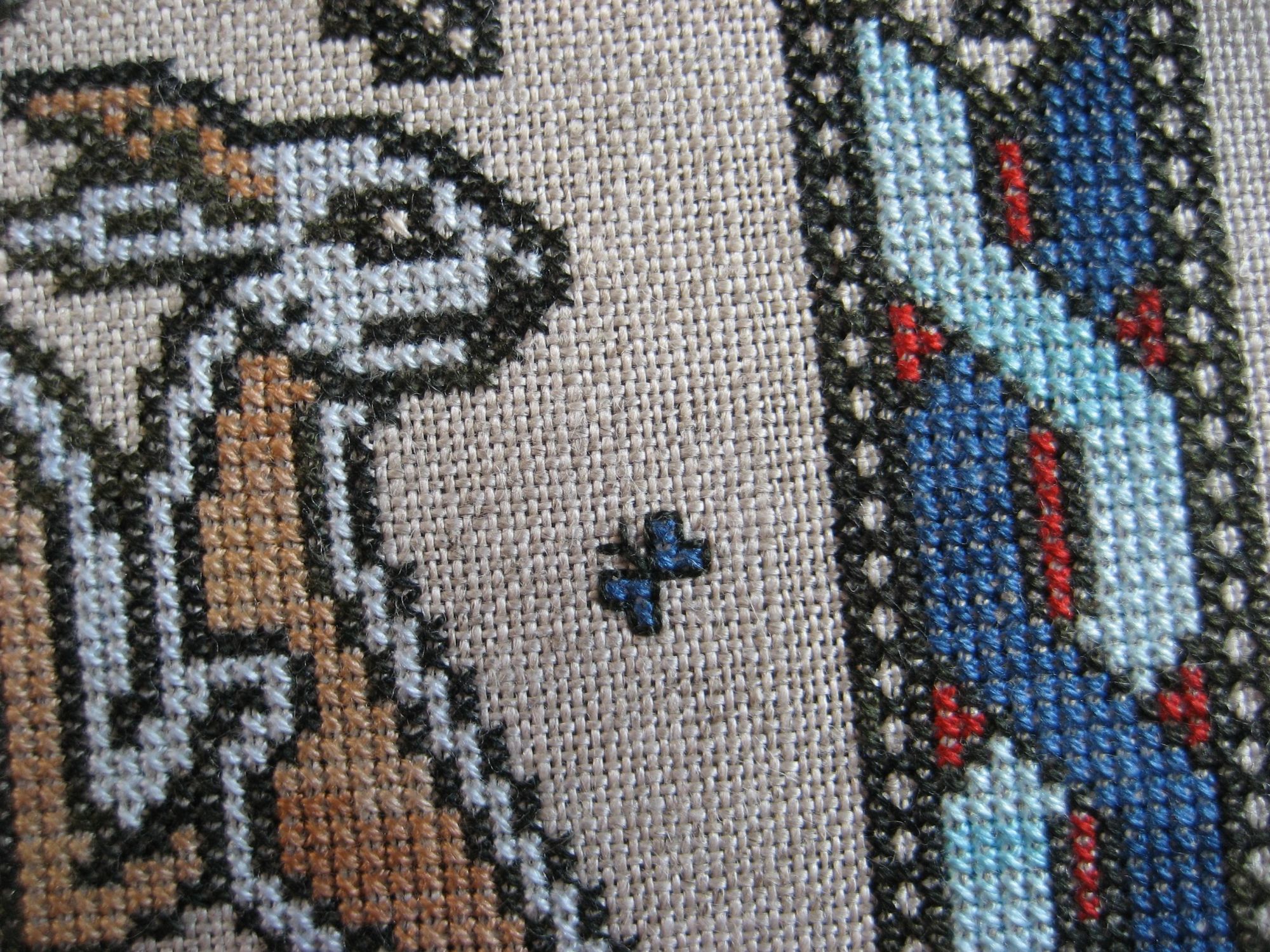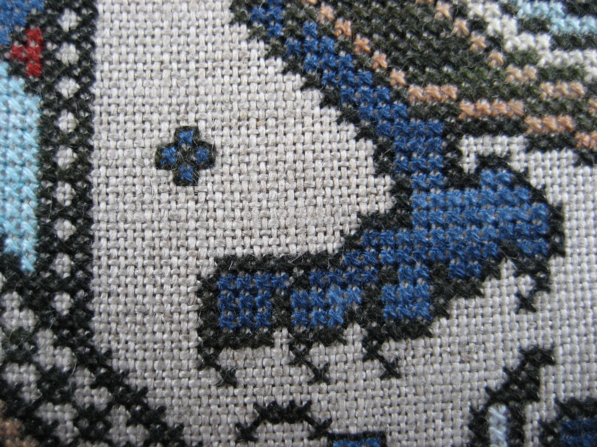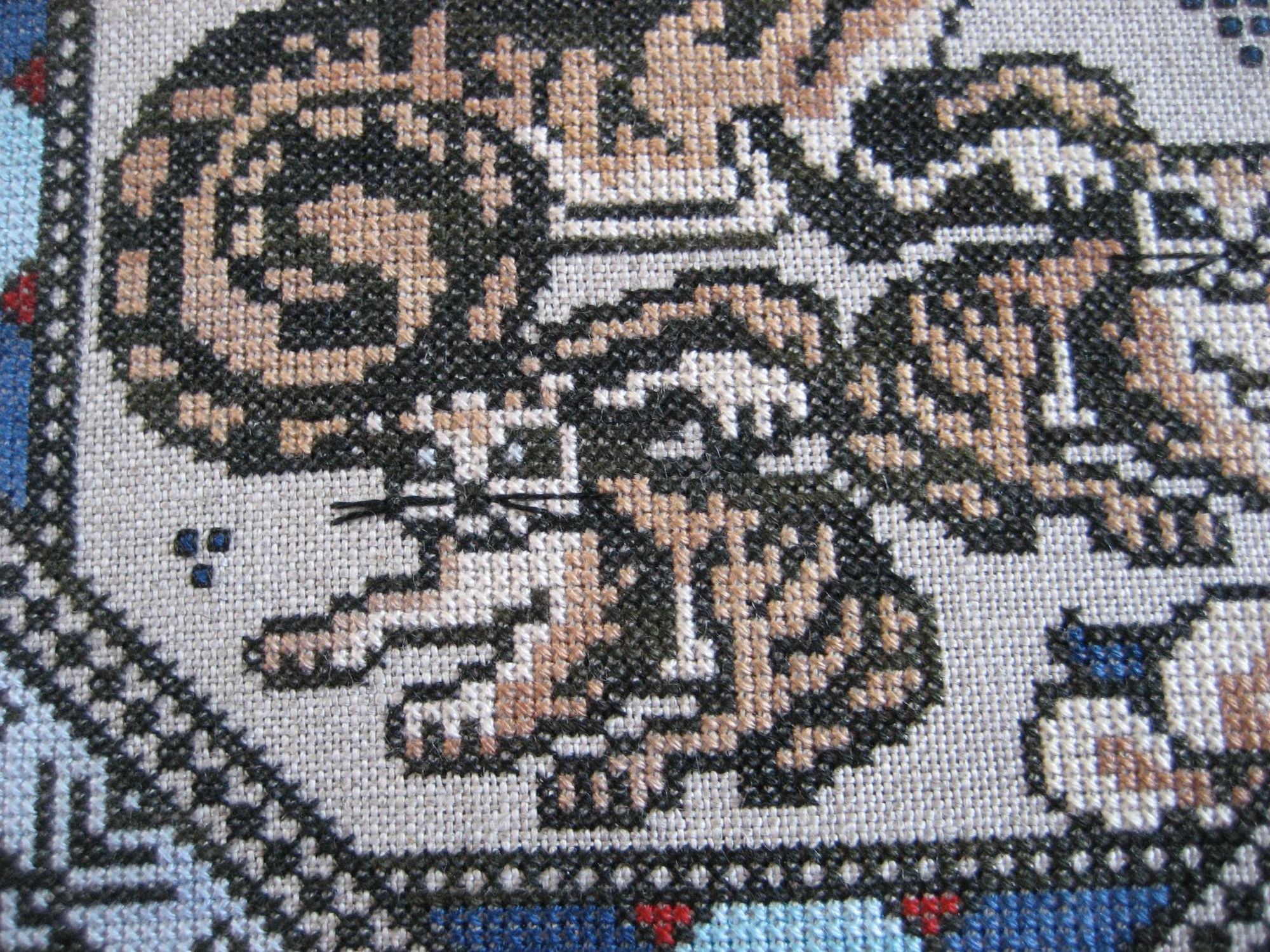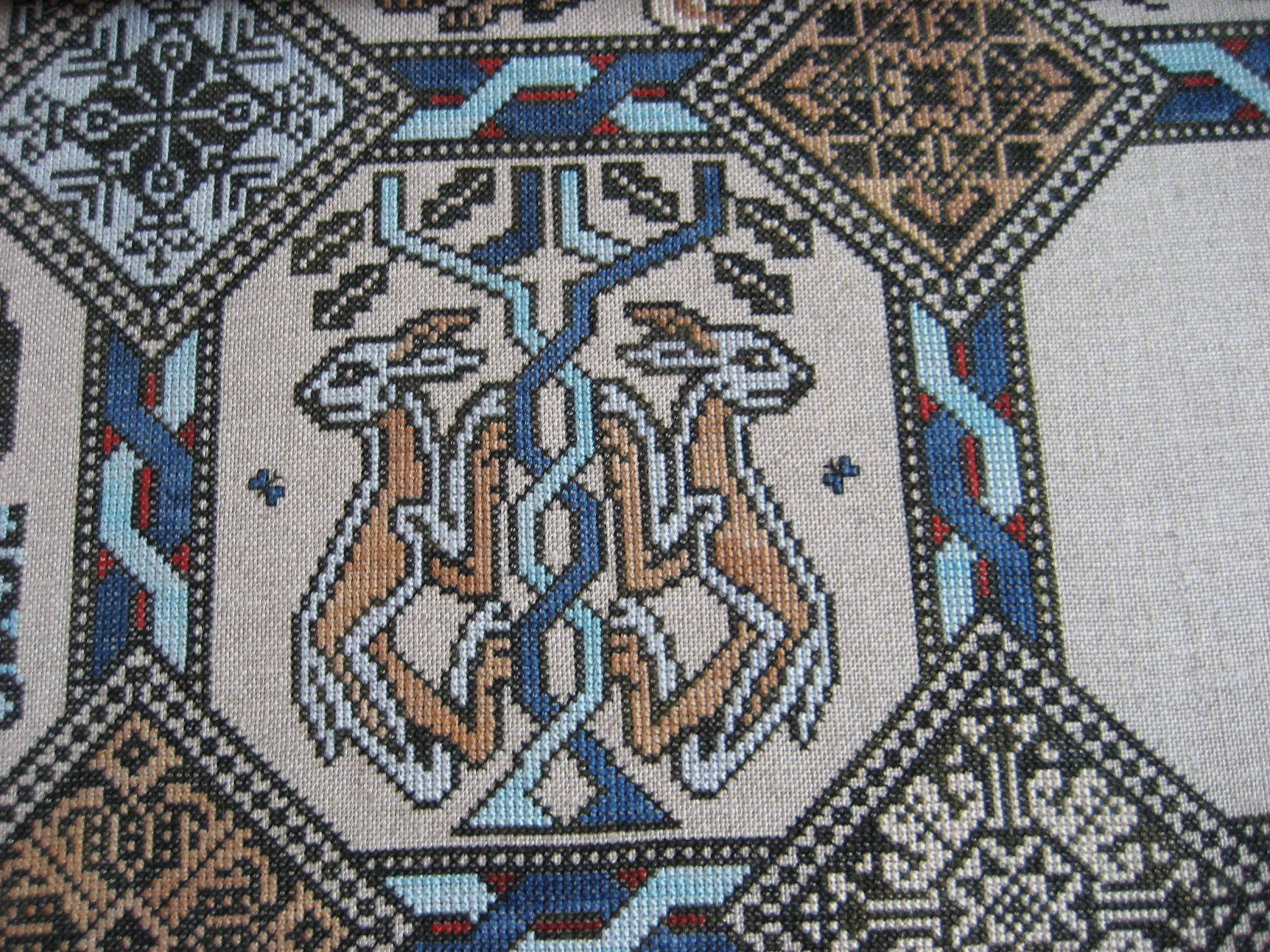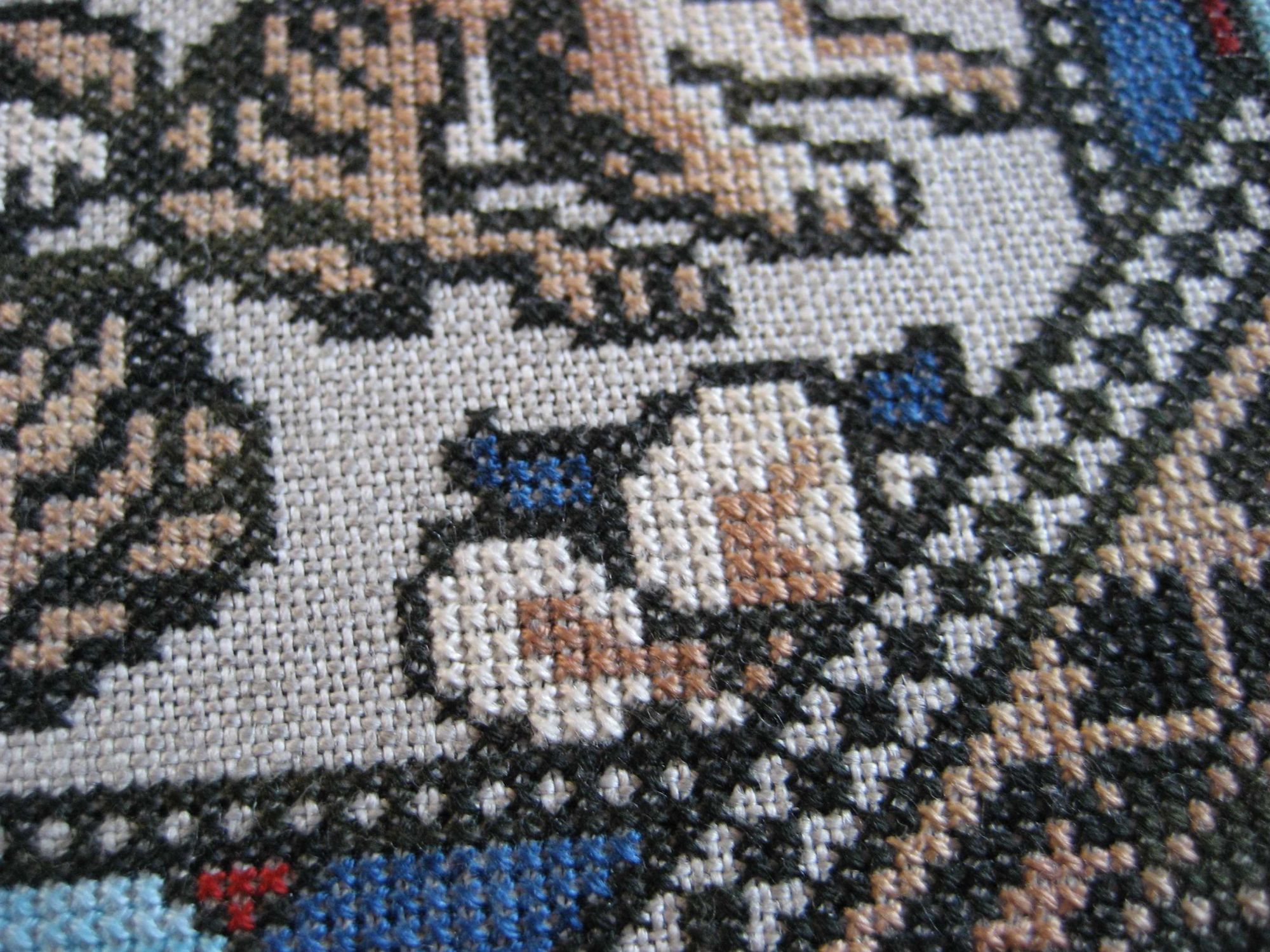 22 августа 2019 Всем доброго дня! Сделаю вид, что не пропадала надолго из своей темы и покажу свои продвижения в сэмплере Опус Магнуссона. Напомню, что вышиваю на льне 40 каунта в одну нить. Герои сегодняшнего дня - черепахоподобная птица, летающая собака, голубоглазая лошадка и зайцы во фраках. Итак, было: Стало: И продолжение: На лошадке мои инициалы, а рядышком - актуальная дата (год). С инициалами пришлось немного повозиться, чтобы нарисовать что-то более-менее похожее по стилю на исходник, с цифрам проще - всего лишь нарисовать единицу вместо нуля, ну и девятку чуть подправила. Проще всего вышивалась именно лошадка, хотя и медленнее, чем остальные картинки - это из-за большого пространства, зашиваемого одним цветом. Пришлось пыхтеть над каждым крестиком, тщательно регулируя натяжение нити, но как я не старалась, все равно явно просматриваются ряды туда-обратно из-за разного наклона крестиков. У меня такая же ерунда получается при вязании на спицах: если идет гладкая вязка, то явная полосатость наблюдается. Если честно, сэмплер мне уже поднадоел, хотя и очень к нему привязалась. Буду скучать, когда закончу. Больше всего надоедает вышивать повторяющийся орнамент - сетку. Картинки куда веселее движутся. Прямо праздник для меня каждый раз )) Небольшое количество цветов, как ни странно, не утомляет. Наверное потому, что цветовая гамма спокойная, да и интенсивность окраски нити все время меняется, не дает скучать. Напомню, нити - хлопок ручного крашения. Больше всего в деле переходы цвета заметны на карамельно-коричневых, меньше - на бирюзовых (хорошо видно на инициалах) и синих, почти не видны на бледно-голубых и совсем их нет на бежевых. Черные - совсем другая история. Они черные с зеленым отливом, недаром называются Raven (Ворон). Последняя пара мотков, что в работе, прямо совсем зеленые. Думала, что будут сильно выделяться на общем фоне, ан нет, также смотрятся черными в вышивке. Фото не передает эти зеленые переливы, но мне очень нравится. Обратите внимание, какие милипизерные бабочки рядом с зайцами, Прямо улыбнуло )) А зайцы непонятные какие-то. На дубе (!) То ли ноги у них вывернутые, то ли еще что. В общем для себя решила, что они во фраках )) А какие ягодки рядом с черепахоподобной птицей? Очень мне гжель напоминают. Работы впереди еще полно. Осталось вышить бородатую щуку и вторую толпу мужиков, а затем широкую полосу орнамента. И тогда будет усе )) Спасибо всем, кто зашел и прочитал мою писанину. Всем легких крестиков! Nat717, Irina 1, татьяна0674 и 32 других сказали спасибо Поделиться сообщением Ссылка на сообщение