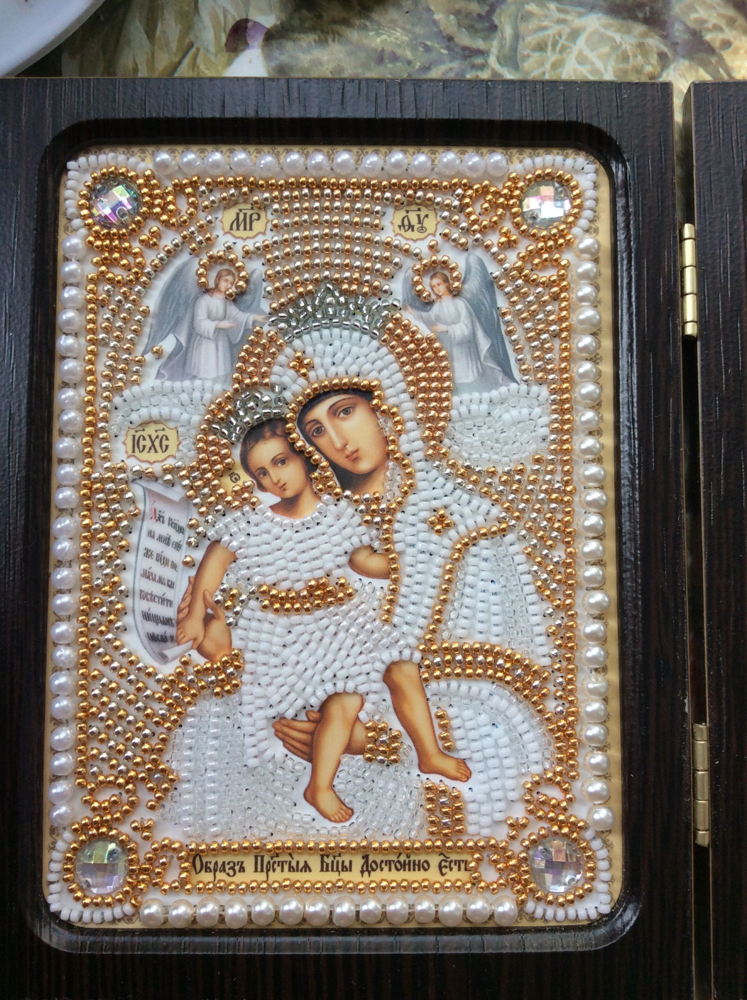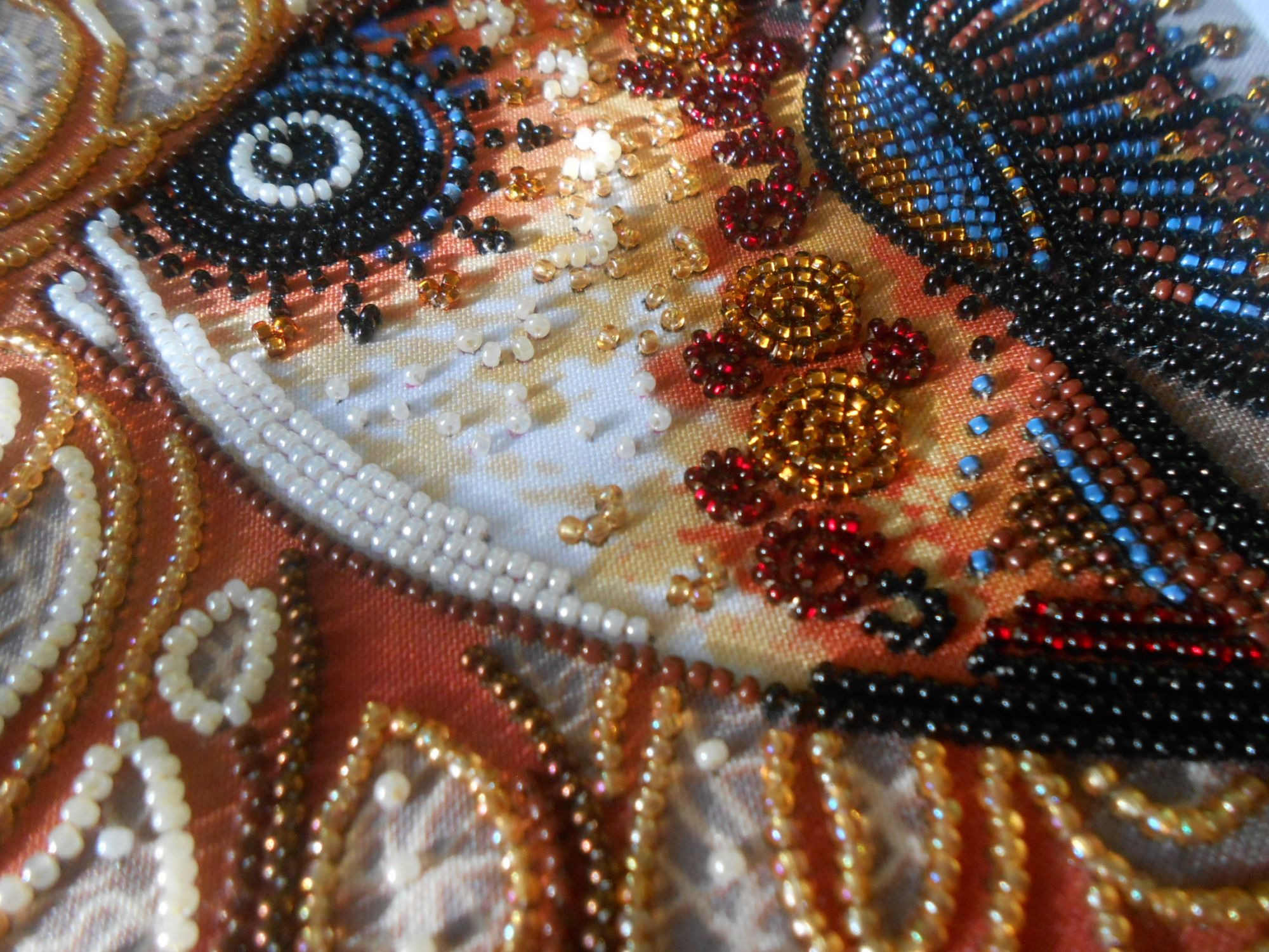 9 ноября 2016 4 минуты назад, Гало4ка сказал: не могу не поделиться своей неудачной историей отшивала сначала все было очень даже неплохо, да бисер кривой, но его с избытком, отсеивать сильно не старалась, поскольку ровных рядов нет, а при таком способе зашивки неровность не очень бросается в глаза, но когда выяснилось , что мелких бусин положили впритык, да причем добрая часть из них слеплены по 2 , по три, я начала психовать, пробовала пришивать блоками, но это некрасиво, короче, когда одиночные бусины кончились, я стала отделать друг от друга слипшиеся, естественно большое количество брака, поскольку некоторые бусины были так спаяны, что с легкостью ломались пополам, но не отделялись от друг от друга... короче... мне не хватило 4! бусины Оль, у меня было так же, но бусин с большим запасом положили. А вот в Галине одного камушка не хватило удлиненного. Хорошо, что у меня от Совы запас был или от другой иконы остался. Правда, другого цвета, но на общем фоне не заметно оказалось. Гало4ка сказал(а) спасибо Поделиться сообщением Ссылка на сообщение