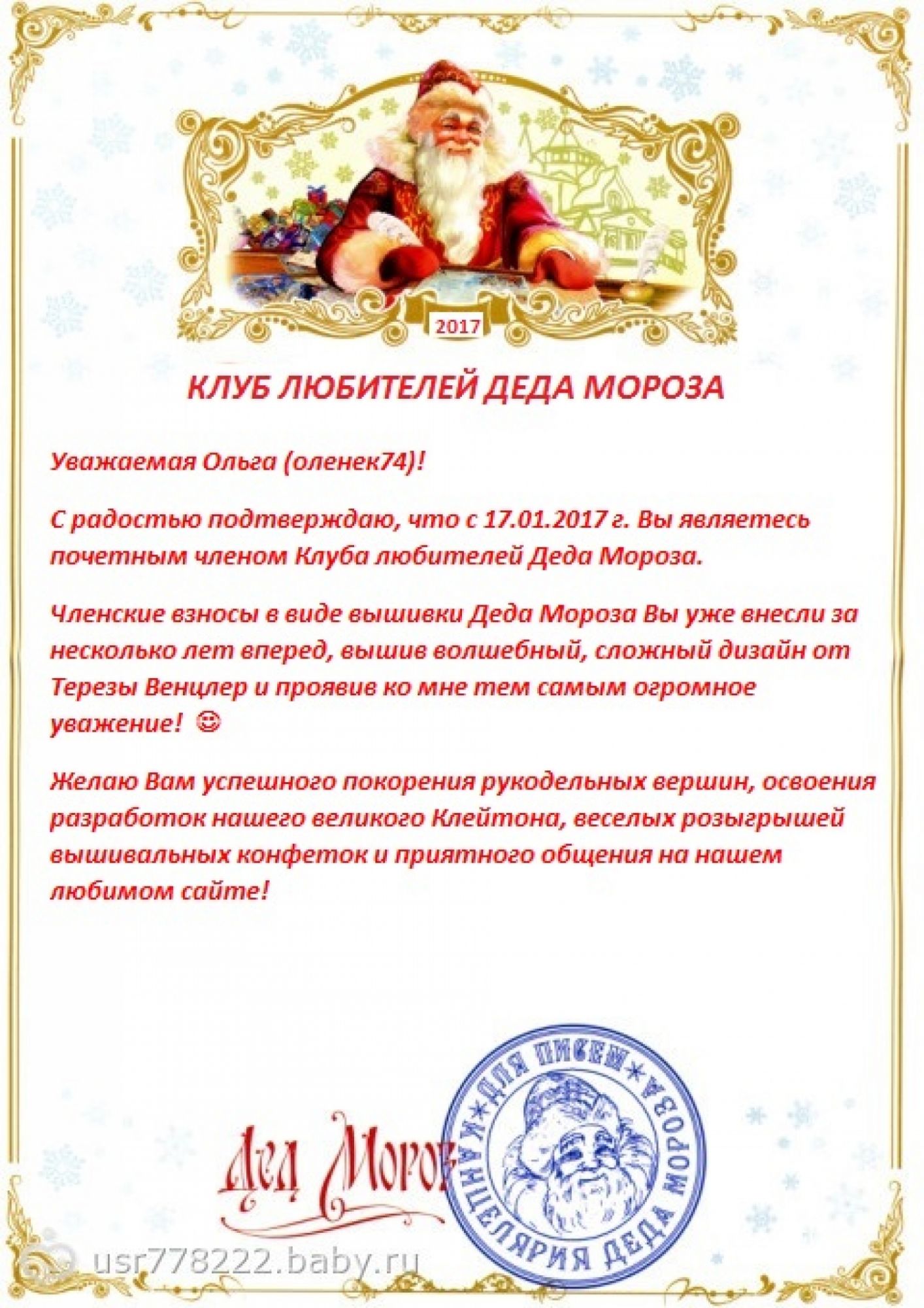 17 января 2017 2 hours ago, оленек74 said: Наташа, привет! Можно в гости, теперь уже официально? Правда, некоторые, тут с ружьями.... Но они добрые, я это знаю! Снежиночка прелестная получилось! Окантовочка бисерная очень здорово смотрится! А для кота хозяева пусть другие игрушки поищут, а эту красоту только на почетное место! Свет, количеством ваших игр, просто сражена наповал!!!!!! Оля, спасибо, что зашла!! Не можно, а нужно! Даааа .... некоторые тут с плетками и ружьями, но это так, для проформы (в душе мы их не боимся)! Спасибо за добрые слова о снежинке. Пустячок, а коту приятно... Светик нам про игры с зельем так и не рассказала, кстати... Оля, тебе Дедушка Мороз привез свидетельство о членстве в клубе его имени! Вот: Поздравляю! yuss и оленек сказали спасибо Поделиться сообщением Ссылка на сообщение