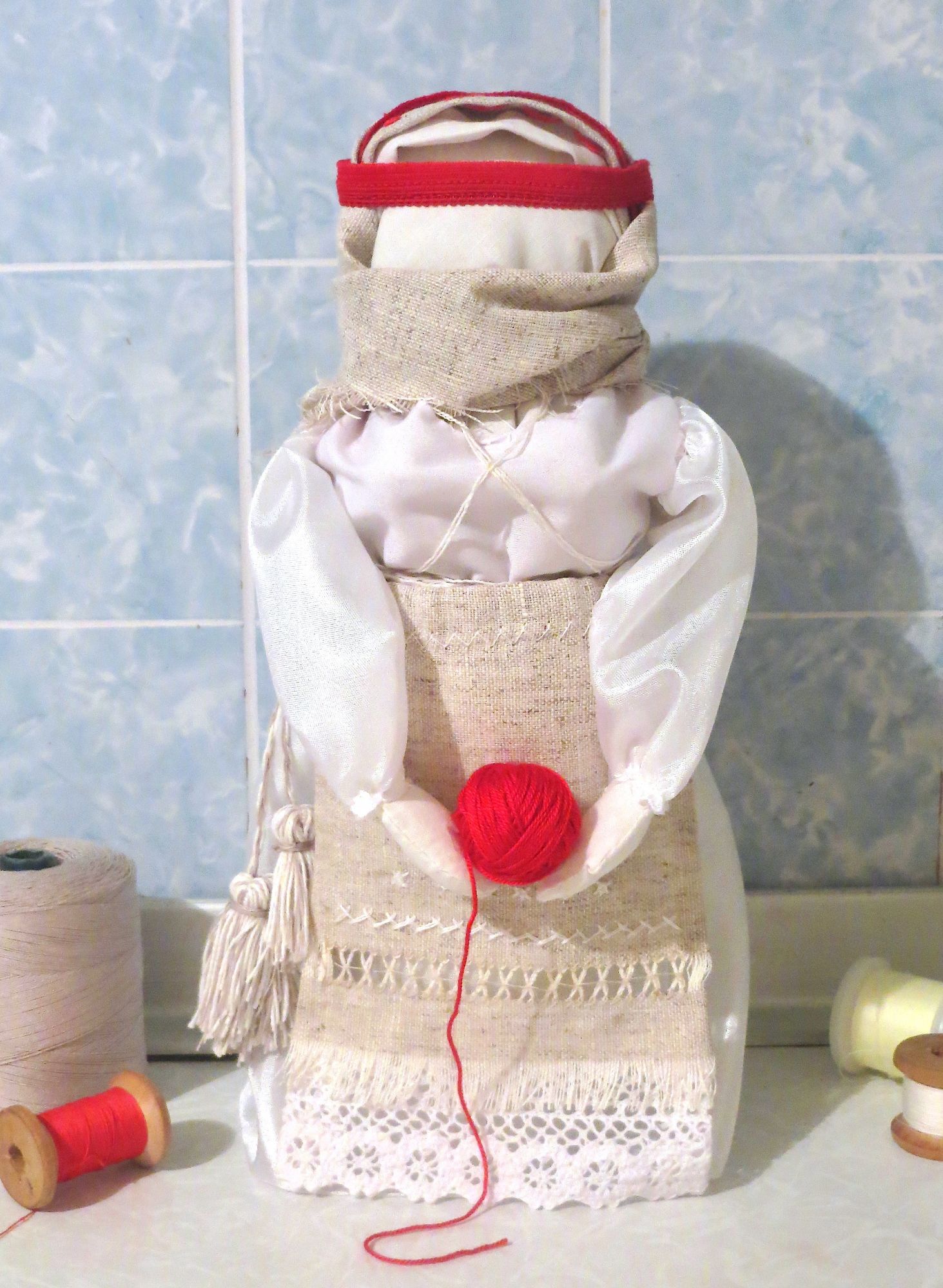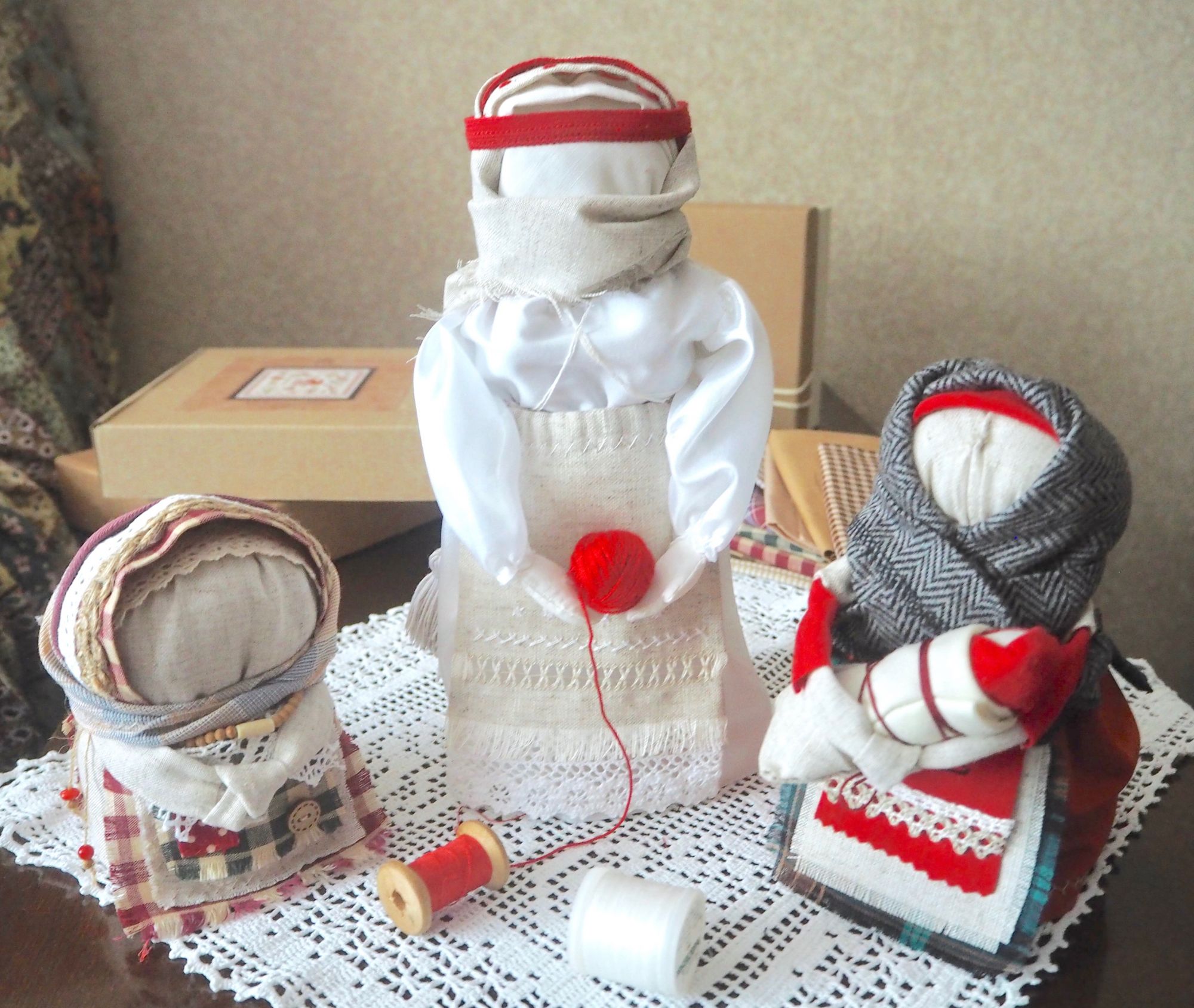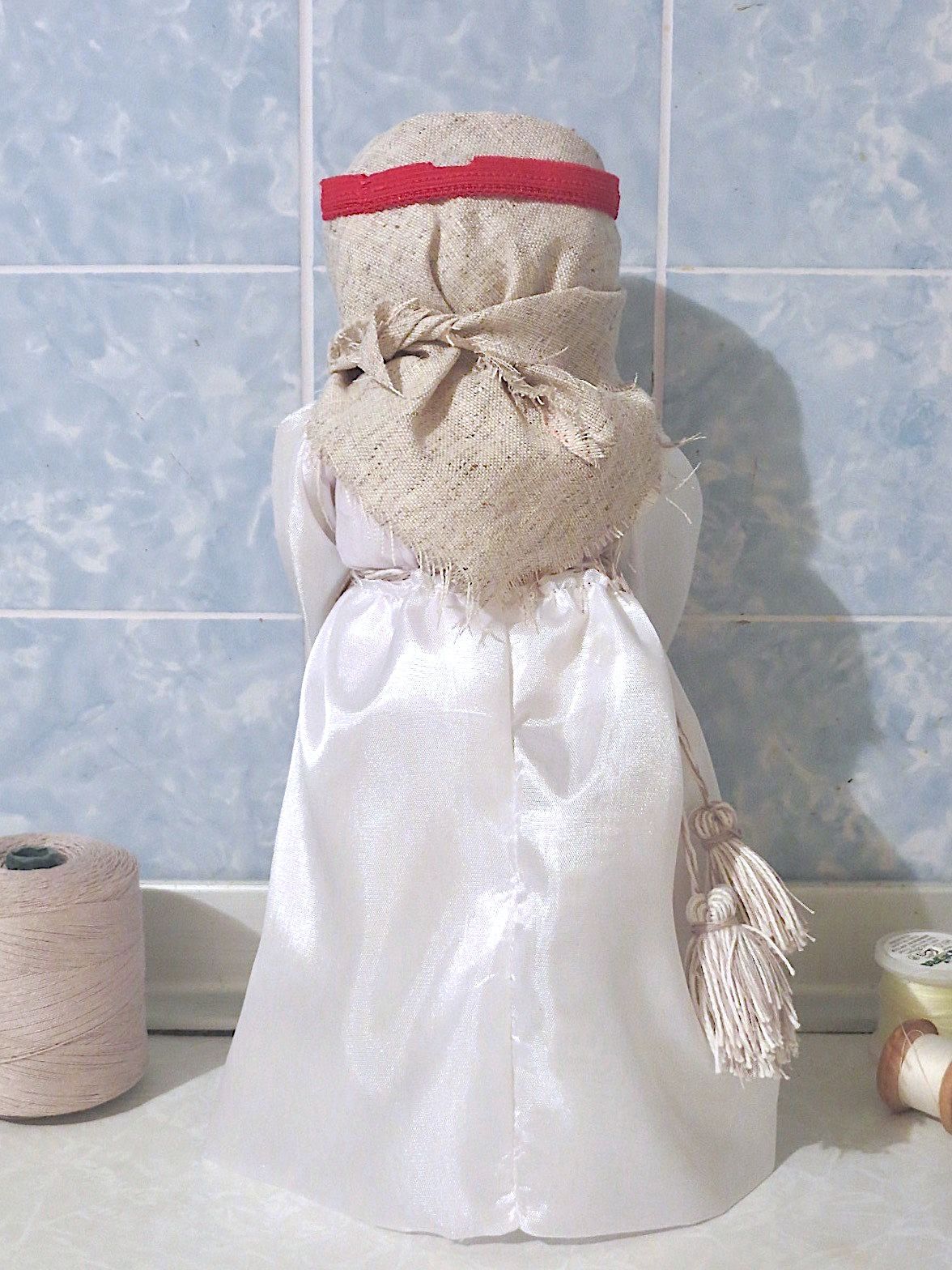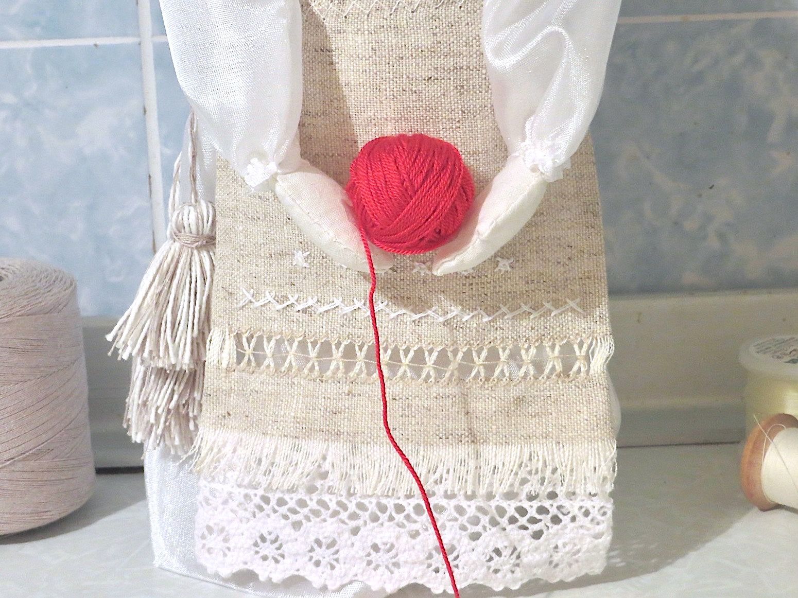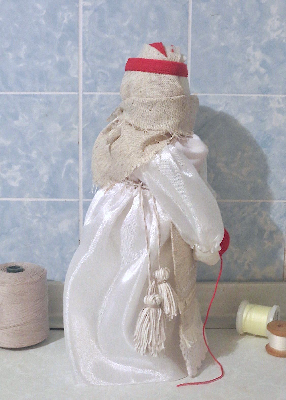 28 сентября 2019 14 часов назад, SvetlanaM сказал(а): Покажешь нам? Хорошо, Светик, покажу и немного расскажу. Недавно наткнулась в интернете на фотографии славянских куколок-оберегов, и сразу поняла, что мне срочно нужно что-то подобное, тем более что от одного проекта остался лен. Это куколки-мотанки, сделанные с наполнителем методом мотания (примерно так ), причем ниточки следует заматывать по направлению движения солнца. Красная нить символизирует женскую силу, синяя - мужскую. Издавна такие куколки считались мощным талисманом, и при их изготовлении можно читать специальные заговоры, например, на удачу, на счастье. Личико у таких куколок не рисуется и не вышивается во избежание проникновения чужой нехорошей энергии. Принято на хороший урожай мотать на растущую луну, на здоровье -- в полнолуние, а от болезней -- на луну убывающую. Интересно то, что уже по завершении всех трех куколок я прочитала, что их нужно заканчивать в тот же день, в который они начаты. У меня так и получилось. Куколок сделала просто по фотографиям, выкройки здесь не нужны. Украшаются по собственному желанию. У меня все три куколки создались на одном дыхании. Самая первая -- и самая маленькая, 14 см. Украсила ее кружевом, пуговичкой, деревянными бусиками. Внутри не только наполнитель, но и рис для устойчивости и благополучия. Еще монетку положила. Вторая куколка с лялькой -- это, в моем представлении, бабушка или же повитуха. Ее размер - 18 см. Самая высокая, ростом 27 см, у меня получилась третья куколка, олицетворяющая берегиню рукоделия (ну это я так для себя придумала ). В руки вложила ей клубочек ниток. Пусть забавляется! Для одежек использовала все, что было под рукой. Например, платок бабушки сделала из обрезков сарафана (ушивала его когда-то), а платье рукодельницы вообще стыдно признаться, сделано из очень блестящего и очень сыпучего кусочка ткани, в который сто лет назад была завернута посылка из какого-то рукодельного магазина. Она была грязная и измазана клеем, я ее постирала и сшила что-то типа сарафана. Смастерила вышитый фартучек и кисточки на пояс. Кстати, именно эта куколка никак не хотела фотографироваться. Сделала несколько фотографий на разных фонах, но все равно что-то не то... Процесс безумно увлекательный, есть где разгуляться фантазии. Советую всем не выбрасывать обрезки тряпочек, они еще могут пригодиться. Девочки, не судите строго, это моя первая проба пера. Уже знаю, что в будущем сделаю еще подобных куколок, надеюсь, лучшего качества. Уважаемые модераторы, все фотографии не для гаечки! Lenyska153521, nogres, Iharu и 24 других сказали спасибо Поделиться сообщением Ссылка на сообщение