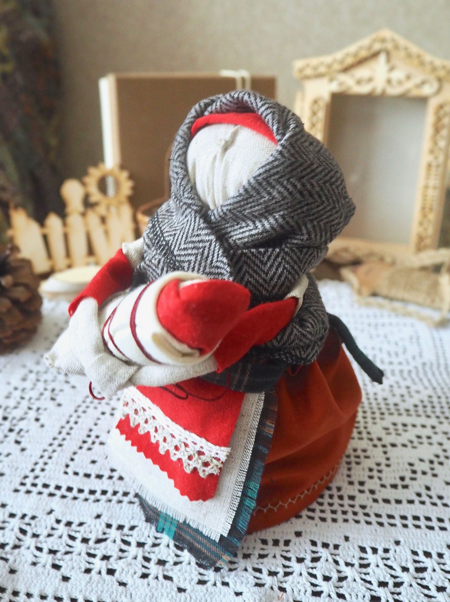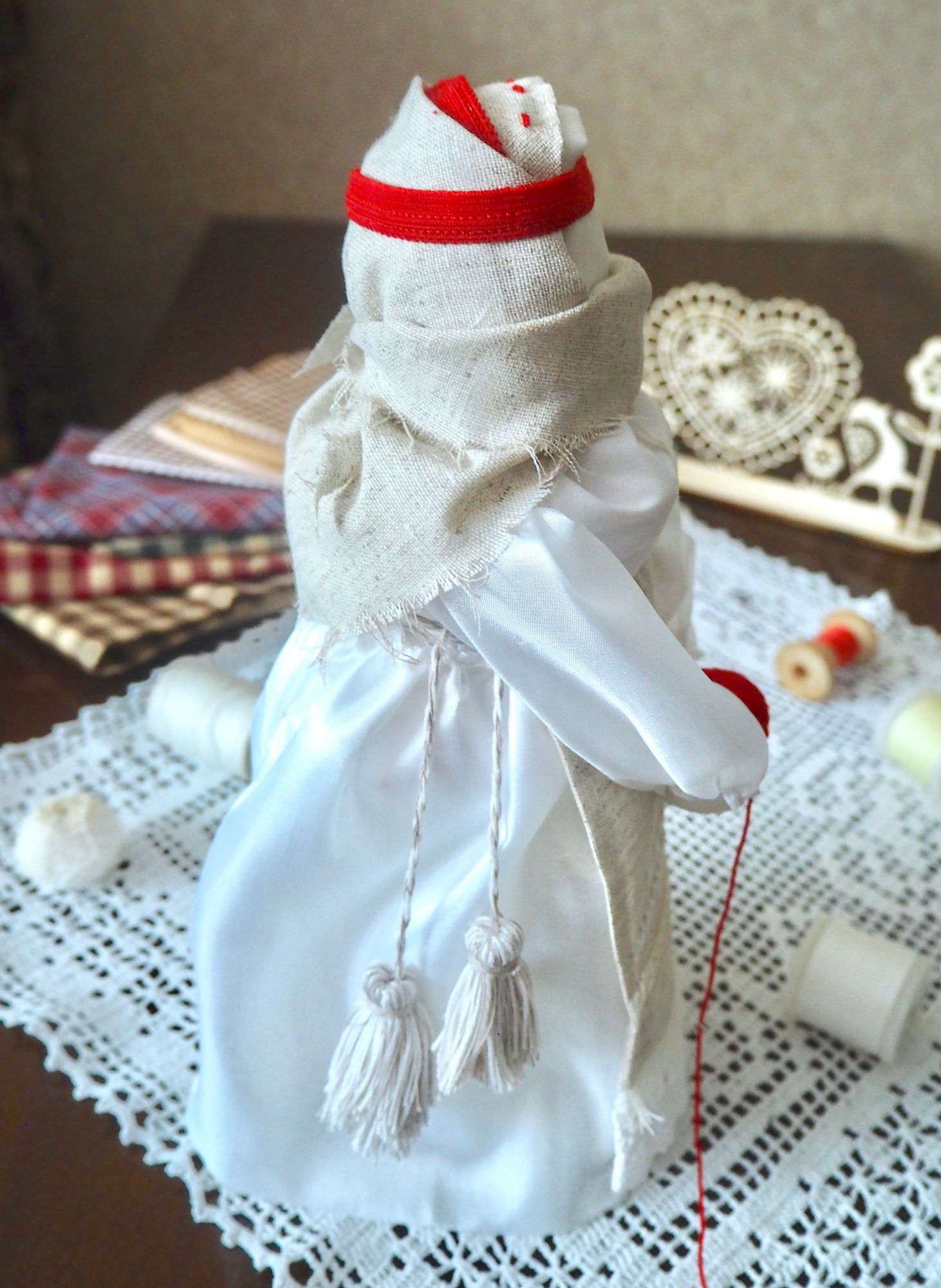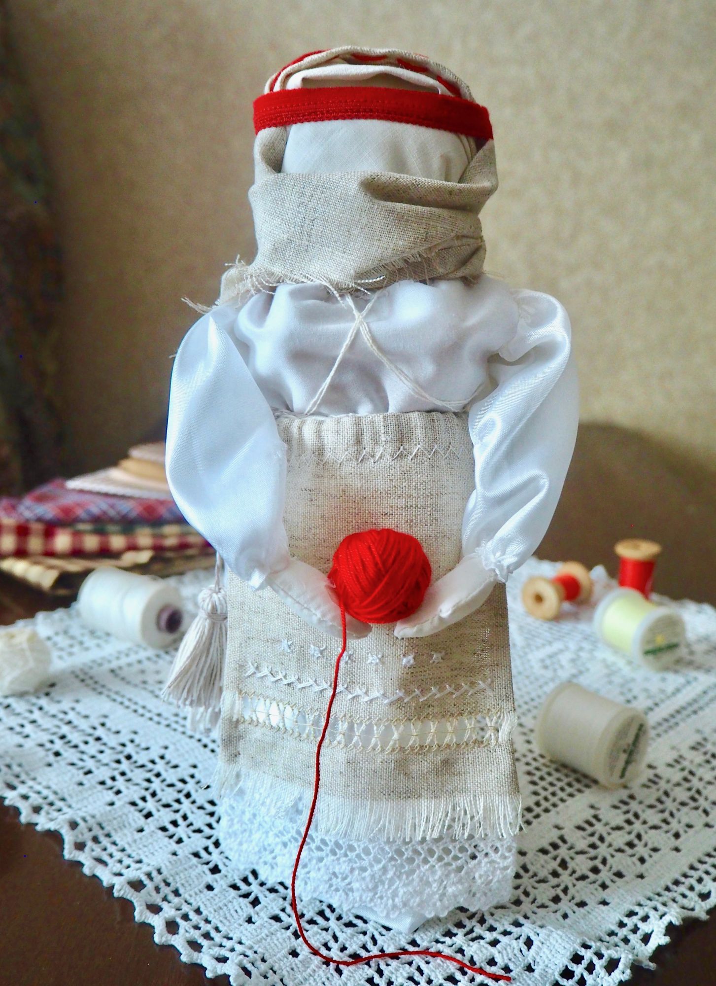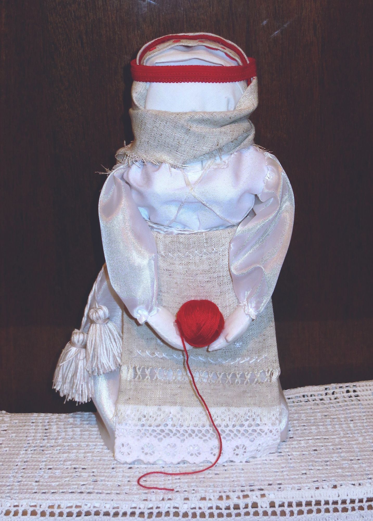 28 сентября 2019 14 часов назад, SvetlanaM сказал(а): Покажешь нам? Хорошо, Светик, покажу и немного расскажу. Недавно наткнулась в интернете на фотографии славянских куколок-оберегов, и сразу поняла, что мне срочно нужно что-то подобное, тем более что от одного проекта остался лен. Это куколки-мотанки, сделанные с наполнителем методом мотания (примерно так ), причем ниточки следует заматывать по направлению движения солнца. Красная нить символизирует женскую силу, синяя - мужскую. Издавна такие куколки считались мощным талисманом, и при их изготовлении можно читать специальные заговоры, например, на удачу, на счастье. Личико у таких куколок не рисуется и не вышивается во избежание проникновения чужой нехорошей энергии. Принято на хороший урожай мотать на растущую луну, на здоровье -- в полнолуние, а от болезней -- на луну убывающую. Интересно то, что уже по завершении всех трех куколок я прочитала, что их нужно заканчивать в тот же день, в который они начаты. У меня так и получилось. Куколок сделала просто по фотографиям, выкройки здесь не нужны. Украшаются по собственному желанию. У меня все три куколки создались на одном дыхании. Самая первая -- и самая маленькая, 14 см. Украсила ее кружевом, пуговичкой, деревянными бусиками. Внутри не только наполнитель, но и рис для устойчивости и благополучия. Еще монетку положила. Вторая куколка с лялькой -- это, в моем представлении, бабушка или же повитуха. Ее размер - 18 см. Самая высокая, ростом 27 см, у меня получилась третья куколка, олицетворяющая берегиню рукоделия (ну это я так для себя придумала ). В руки вложила ей клубочек ниток. Пусть забавляется! Для одежек использовала все, что было под рукой. Например, платок бабушки сделала из обрезков сарафана (ушивала его когда-то), а платье рукодельницы вообще стыдно признаться, сделано из очень блестящего и очень сыпучего кусочка ткани, в который сто лет назад была завернута посылка из какого-то рукодельного магазина. Она была грязная и измазана клеем, я ее постирала и сшила что-то типа сарафана. Смастерила вышитый фартучек и кисточки на пояс. Кстати, именно эта куколка никак не хотела фотографироваться. Сделала несколько фотографий на разных фонах, но все равно что-то не то... Процесс безумно увлекательный, есть где разгуляться фантазии. Советую всем не выбрасывать обрезки тряпочек, они еще могут пригодиться. Девочки, не судите строго, это моя первая проба пера. Уже знаю, что в будущем сделаю еще подобных куколок, надеюсь, лучшего качества. Уважаемые модераторы, все фотографии не для гаечки! Lenyska153521, nogres, Iharu и 24 других сказали спасибо Поделиться сообщением Ссылка на сообщение