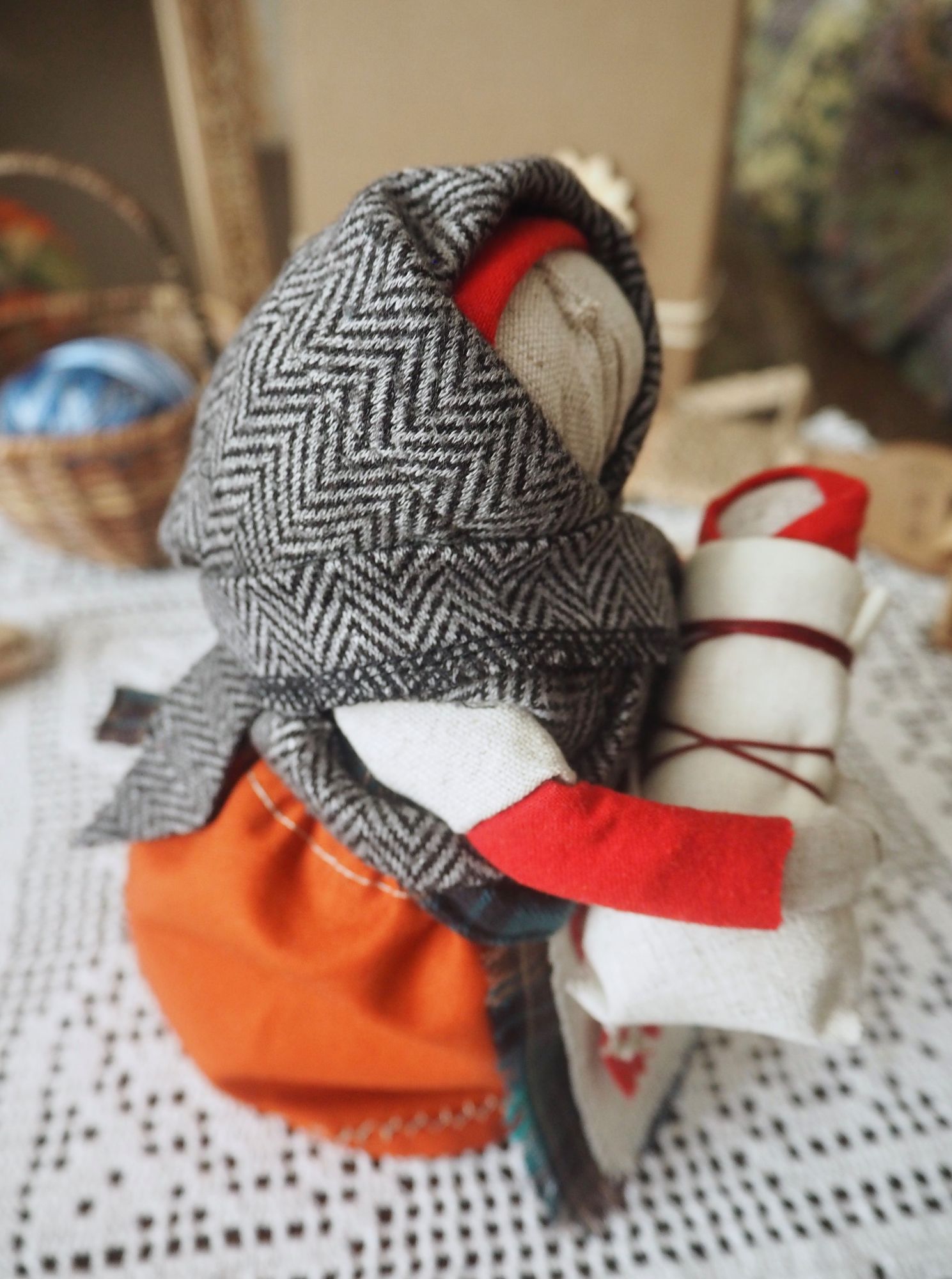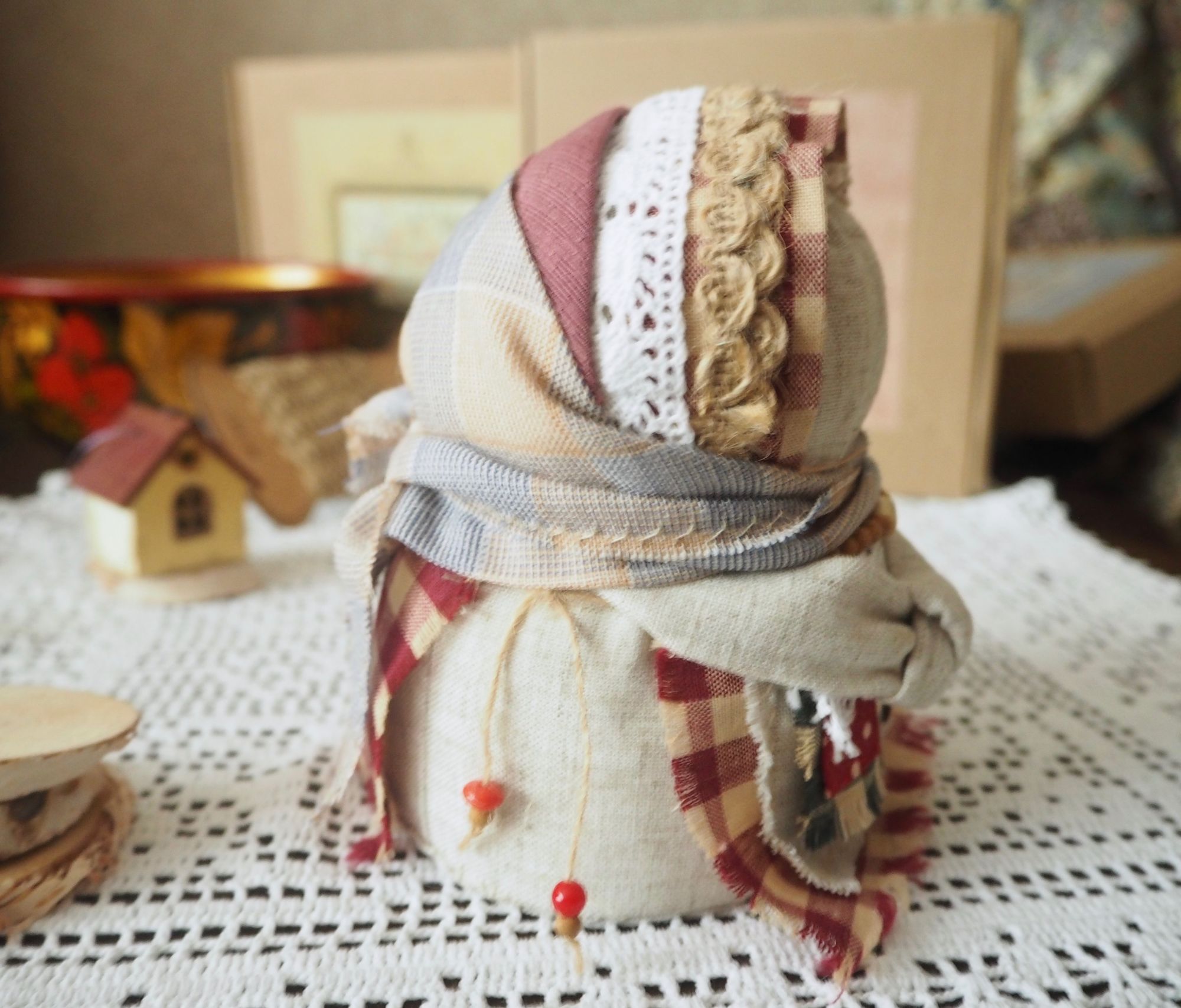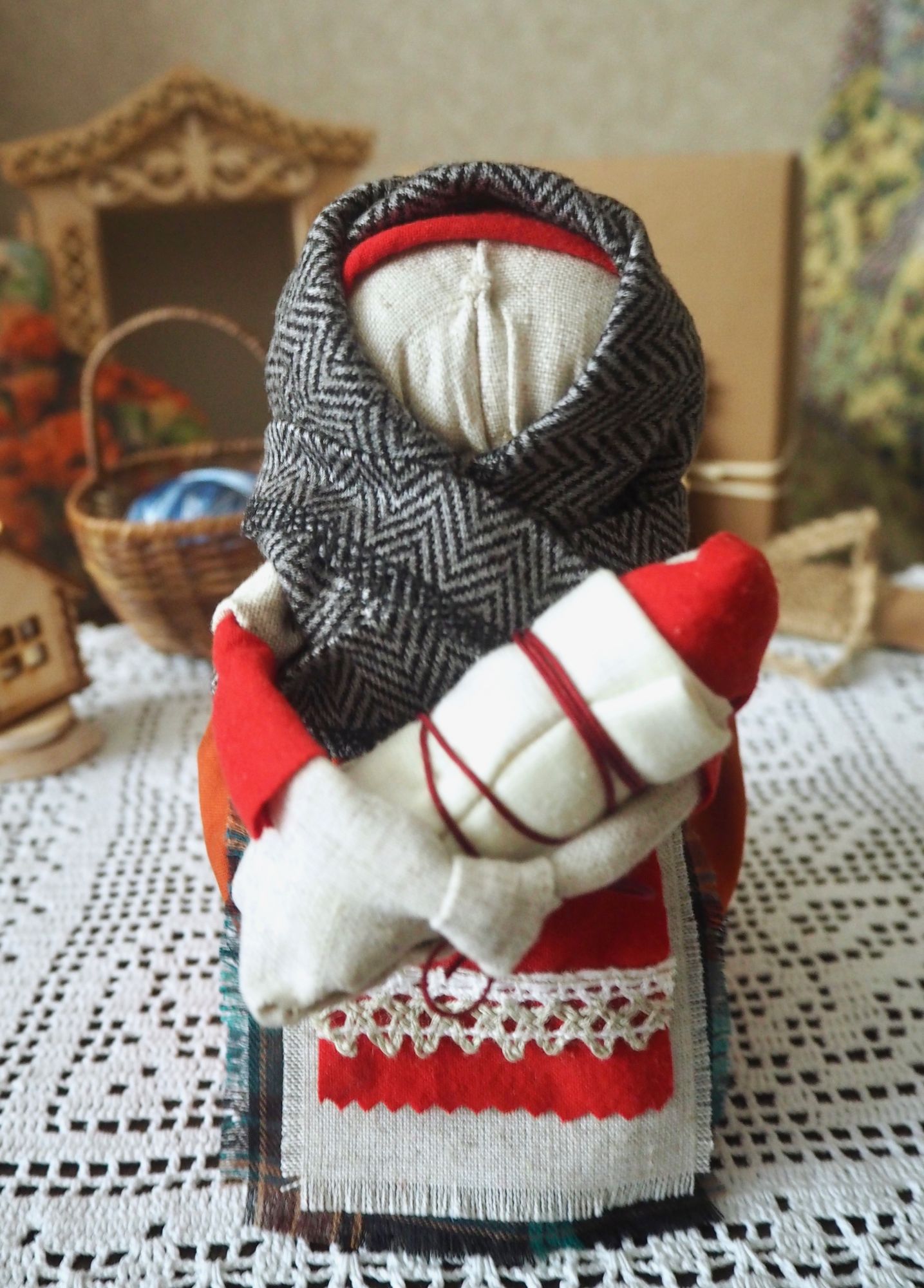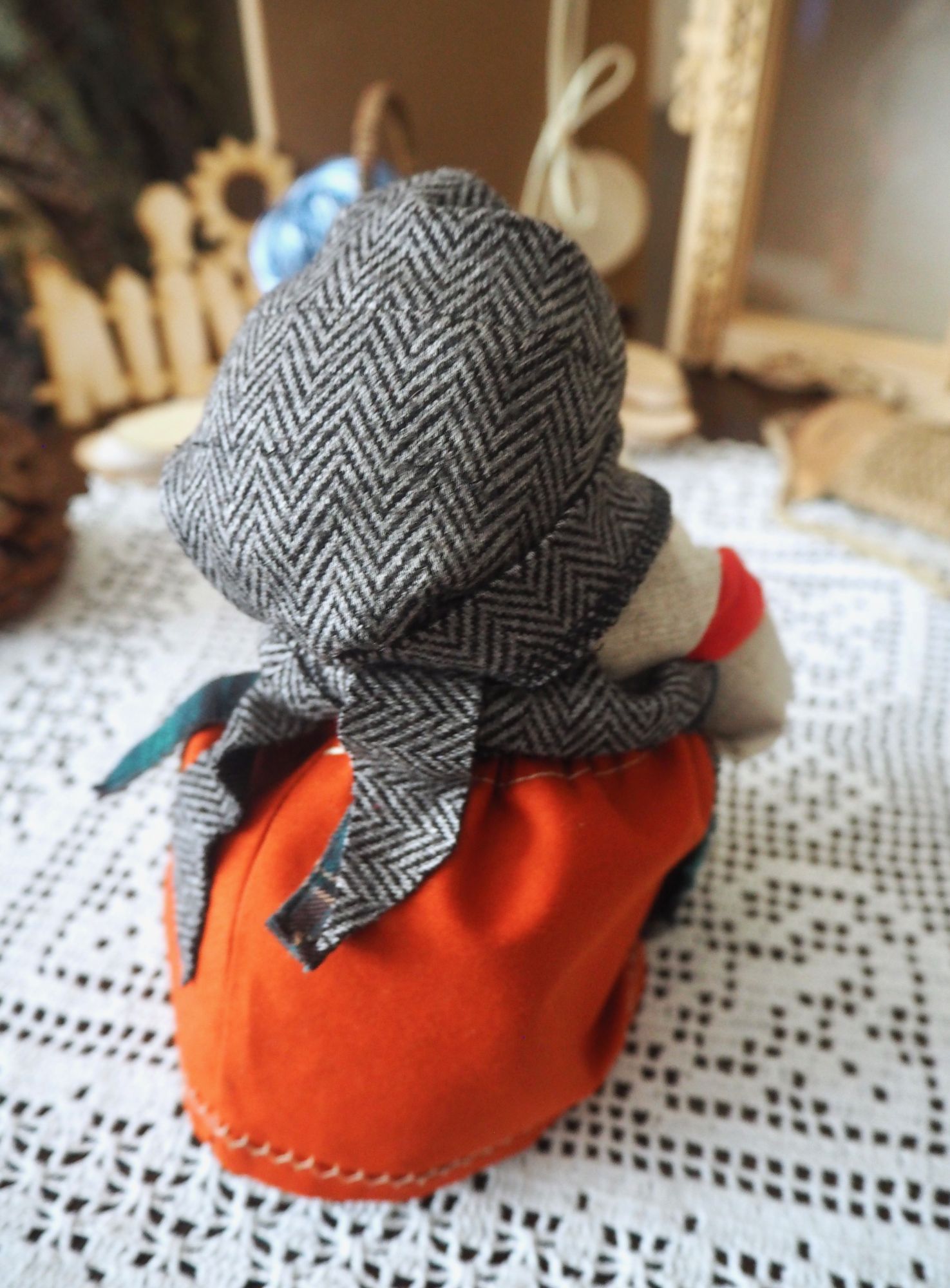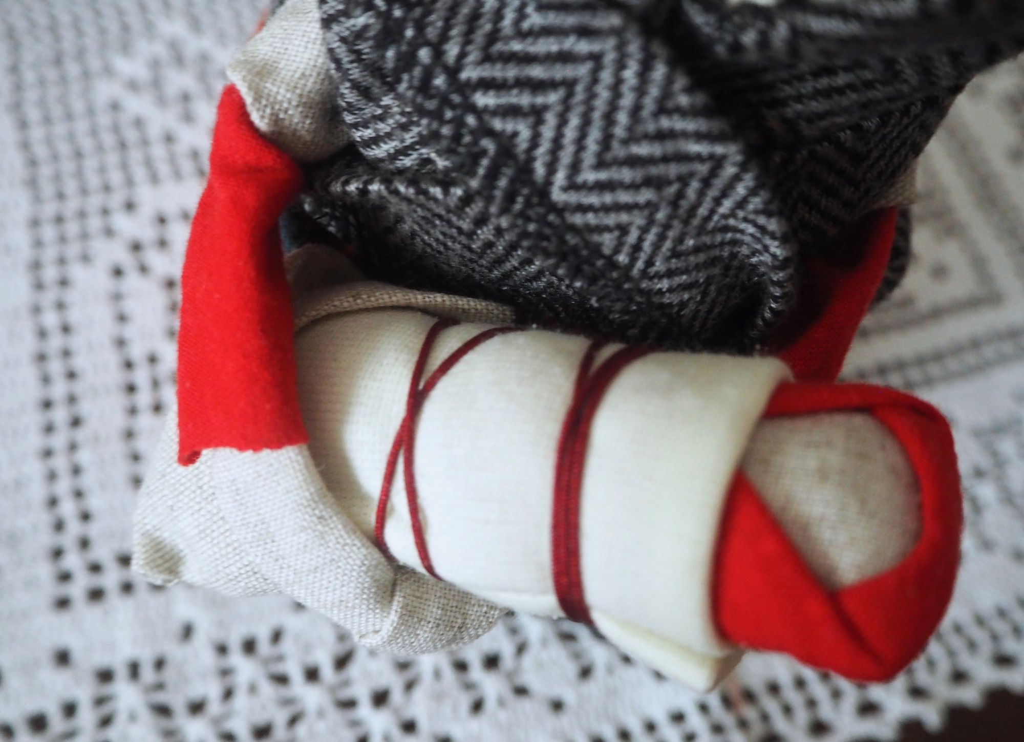 28 сентября 2019 14 часов назад, SvetlanaM сказал(а): Покажешь нам? Хорошо, Светик, покажу и немного расскажу. Недавно наткнулась в интернете на фотографии славянских куколок-оберегов, и сразу поняла, что мне срочно нужно что-то подобное, тем более что от одного проекта остался лен. Это куколки-мотанки, сделанные с наполнителем методом мотания (примерно так ), причем ниточки следует заматывать по направлению движения солнца. Красная нить символизирует женскую силу, синяя - мужскую. Издавна такие куколки считались мощным талисманом, и при их изготовлении можно читать специальные заговоры, например, на удачу, на счастье. Личико у таких куколок не рисуется и не вышивается во избежание проникновения чужой нехорошей энергии. Принято на хороший урожай мотать на растущую луну, на здоровье -- в полнолуние, а от болезней -- на луну убывающую. Интересно то, что уже по завершении всех трех куколок я прочитала, что их нужно заканчивать в тот же день, в который они начаты. У меня так и получилось. Куколок сделала просто по фотографиям, выкройки здесь не нужны. Украшаются по собственному желанию. У меня все три куколки создались на одном дыхании. Самая первая -- и самая маленькая, 14 см. Украсила ее кружевом, пуговичкой, деревянными бусиками. Внутри не только наполнитель, но и рис для устойчивости и благополучия. Еще монетку положила. Вторая куколка с лялькой -- это, в моем представлении, бабушка или же повитуха. Ее размер - 18 см. Самая высокая, ростом 27 см, у меня получилась третья куколка, олицетворяющая берегиню рукоделия (ну это я так для себя придумала ). В руки вложила ей клубочек ниток. Пусть забавляется! Для одежек использовала все, что было под рукой. Например, платок бабушки сделала из обрезков сарафана (ушивала его когда-то), а платье рукодельницы вообще стыдно признаться, сделано из очень блестящего и очень сыпучего кусочка ткани, в который сто лет назад была завернута посылка из какого-то рукодельного магазина. Она была грязная и измазана клеем, я ее постирала и сшила что-то типа сарафана. Смастерила вышитый фартучек и кисточки на пояс. Кстати, именно эта куколка никак не хотела фотографироваться. Сделала несколько фотографий на разных фонах, но все равно что-то не то... Процесс безумно увлекательный, есть где разгуляться фантазии. Советую всем не выбрасывать обрезки тряпочек, они еще могут пригодиться. Девочки, не судите строго, это моя первая проба пера. Уже знаю, что в будущем сделаю еще подобных куколок, надеюсь, лучшего качества. Уважаемые модераторы, все фотографии не для гаечки! Lenyska153521, nogres, Iharu и 24 других сказали спасибо Поделиться сообщением Ссылка на сообщение