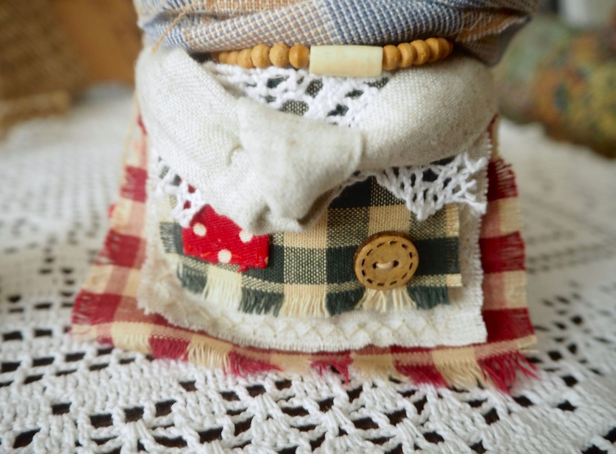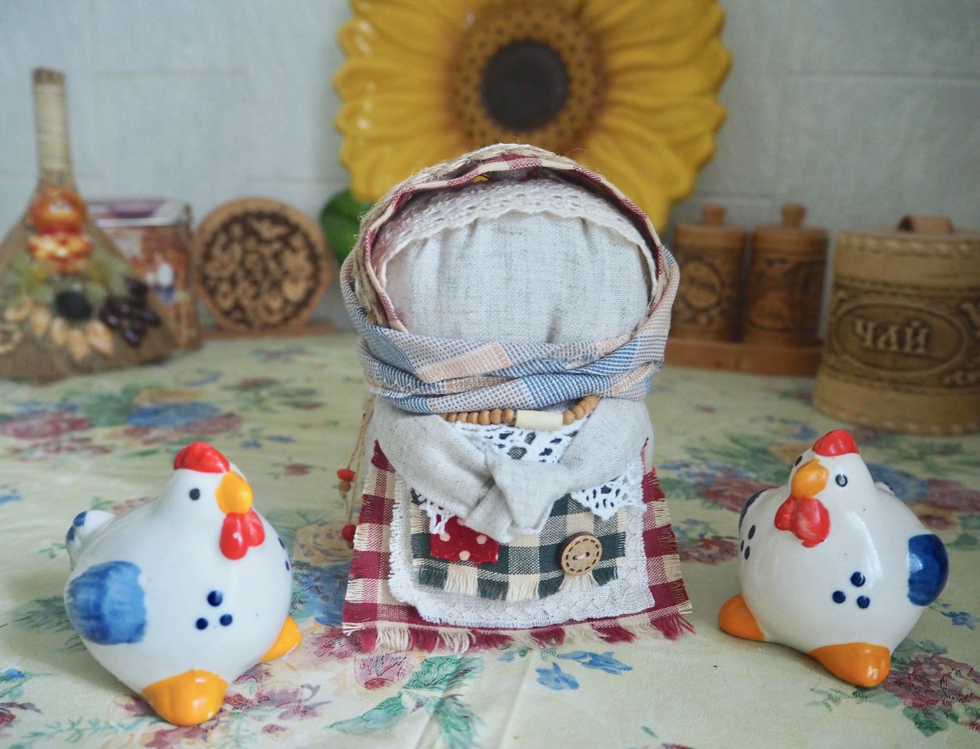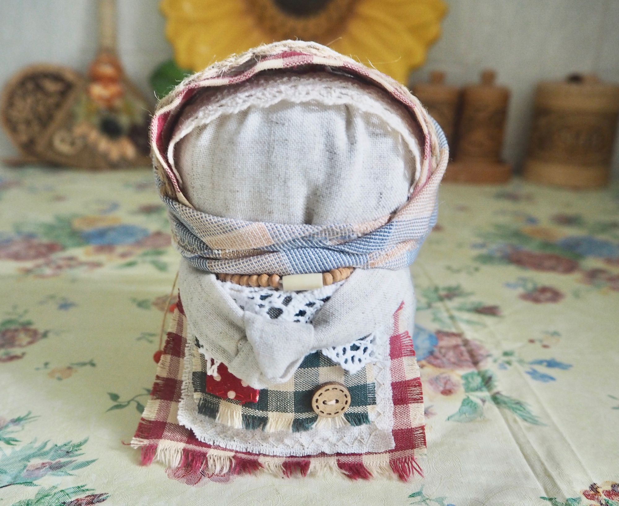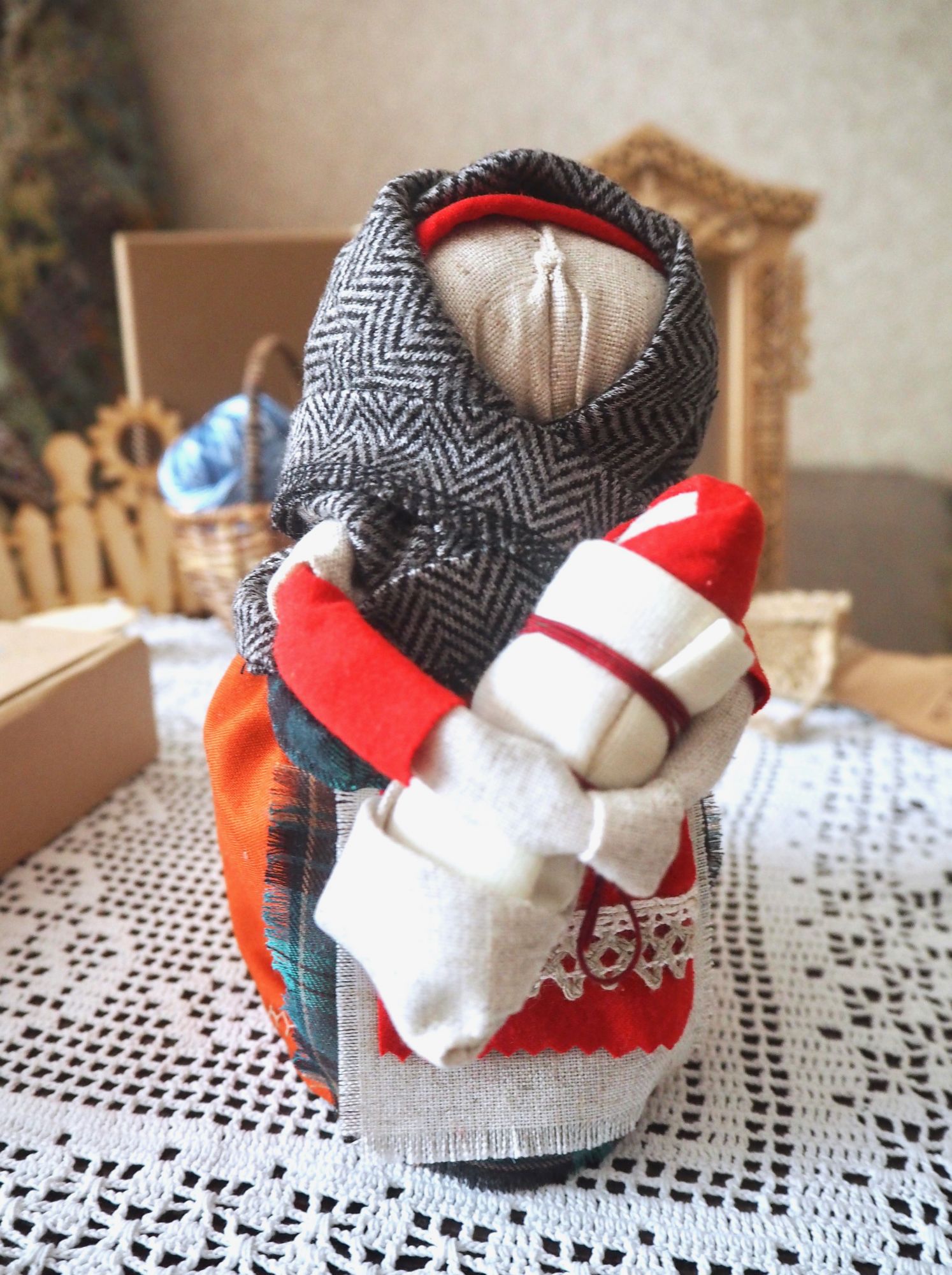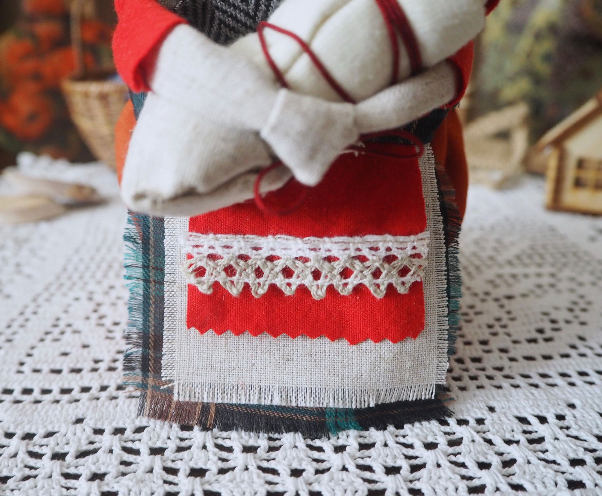 28 сентября 2019 14 часов назад, SvetlanaM сказал(а): Покажешь нам? Хорошо, Светик, покажу и немного расскажу. Недавно наткнулась в интернете на фотографии славянских куколок-оберегов, и сразу поняла, что мне срочно нужно что-то подобное, тем более что от одного проекта остался лен. Это куколки-мотанки, сделанные с наполнителем методом мотания (примерно так ), причем ниточки следует заматывать по направлению движения солнца. Красная нить символизирует женскую силу, синяя - мужскую. Издавна такие куколки считались мощным талисманом, и при их изготовлении можно читать специальные заговоры, например, на удачу, на счастье. Личико у таких куколок не рисуется и не вышивается во избежание проникновения чужой нехорошей энергии. Принято на хороший урожай мотать на растущую луну, на здоровье -- в полнолуние, а от болезней -- на луну убывающую. Интересно то, что уже по завершении всех трех куколок я прочитала, что их нужно заканчивать в тот же день, в который они начаты. У меня так и получилось. Куколок сделала просто по фотографиям, выкройки здесь не нужны. Украшаются по собственному желанию. У меня все три куколки создались на одном дыхании. Самая первая -- и самая маленькая, 14 см. Украсила ее кружевом, пуговичкой, деревянными бусиками. Внутри не только наполнитель, но и рис для устойчивости и благополучия. Еще монетку положила. Вторая куколка с лялькой -- это, в моем представлении, бабушка или же повитуха. Ее размер - 18 см. Самая высокая, ростом 27 см, у меня получилась третья куколка, олицетворяющая берегиню рукоделия (ну это я так для себя придумала ). В руки вложила ей клубочек ниток. Пусть забавляется! Для одежек использовала все, что было под рукой. Например, платок бабушки сделала из обрезков сарафана (ушивала его когда-то), а платье рукодельницы вообще стыдно признаться, сделано из очень блестящего и очень сыпучего кусочка ткани, в который сто лет назад была завернута посылка из какого-то рукодельного магазина. Она была грязная и измазана клеем, я ее постирала и сшила что-то типа сарафана. Смастерила вышитый фартучек и кисточки на пояс. Кстати, именно эта куколка никак не хотела фотографироваться. Сделала несколько фотографий на разных фонах, но все равно что-то не то... Процесс безумно увлекательный, есть где разгуляться фантазии. Советую всем не выбрасывать обрезки тряпочек, они еще могут пригодиться. Девочки, не судите строго, это моя первая проба пера. Уже знаю, что в будущем сделаю еще подобных куколок, надеюсь, лучшего качества. Уважаемые модераторы, все фотографии не для гаечки! Lenyska153521, nogres, Iharu и 24 других сказали спасибо Поделиться сообщением Ссылка на сообщение