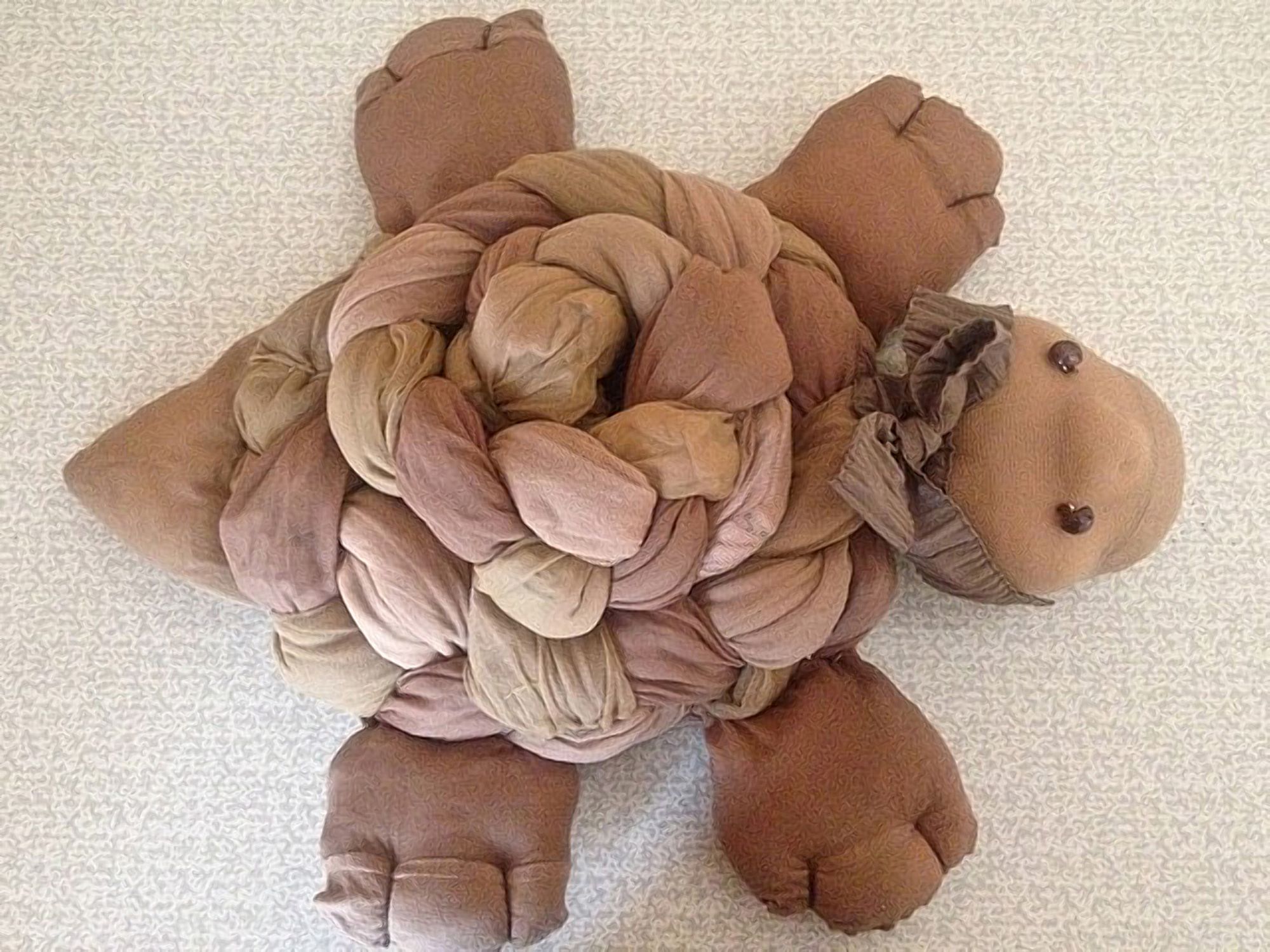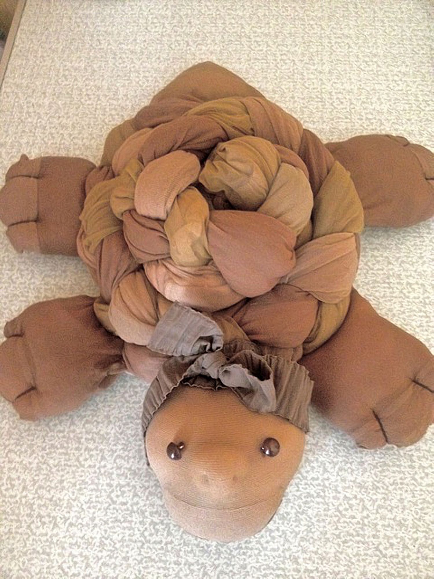 8 февраля 2017 Девочки, у меня дома поселилась черепашка! Правда, не живая, но все равно веселая и оптимистичная! Сделана на скорую руку из старых, порванных колготок. Мы их выбрасываем иногда почти новыми после малейшей затяжки, а из них можно сделать забавные игрушки! Нужно взять две пары колготок, отрезать верхнюю часть (штанишки) и следочки (использовала их для лапок), а из длинных частей сплести косу, которую сшить по спирали и закрепить с изнанки. Это у нас будет панцирь: Для фактурности я взяла колготки, заметно отличающиеся по оттенку. Из обрезков скроить лапки, хвостик и мордочку, набить синтепухом или даже обрезками от колготок (тогда будет безотходное производство) и пришить к панцирю. Идея не моя, а подсмотрена в интернете. Я внесла свои изменения: на лапках проложила строчки, чтобы получились "пальчики", а на мордочку пришила глазки-бусинки и постаралась сделать носик так, как обычно это делают у кукол, сшитых из чулок. Получился вполне себе человеческий взгляд! К шейке привязала ленточку, чтобы черепашка у меня была модница! Аналогичным образом можно из колготок сделать гусеницу, которая изготавливается еще проще - просто чулок набивается чем-нибудь мягким, затем полученная "колбаска" перевязывается в нескольких местах, и таким образом убиваем сразу двух зайцев - получаем и головку гусеницы (вышиваем глазки, носик, ротик), и туловище. Правда, гусеницы в творческих планах нет, так как открывать зоопарк пока не собираюсь вишенка аллая, natalya.petkaleva, yuss и 8 других сказали спасибо Поделиться сообщением Ссылка на сообщение