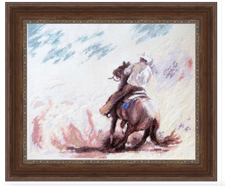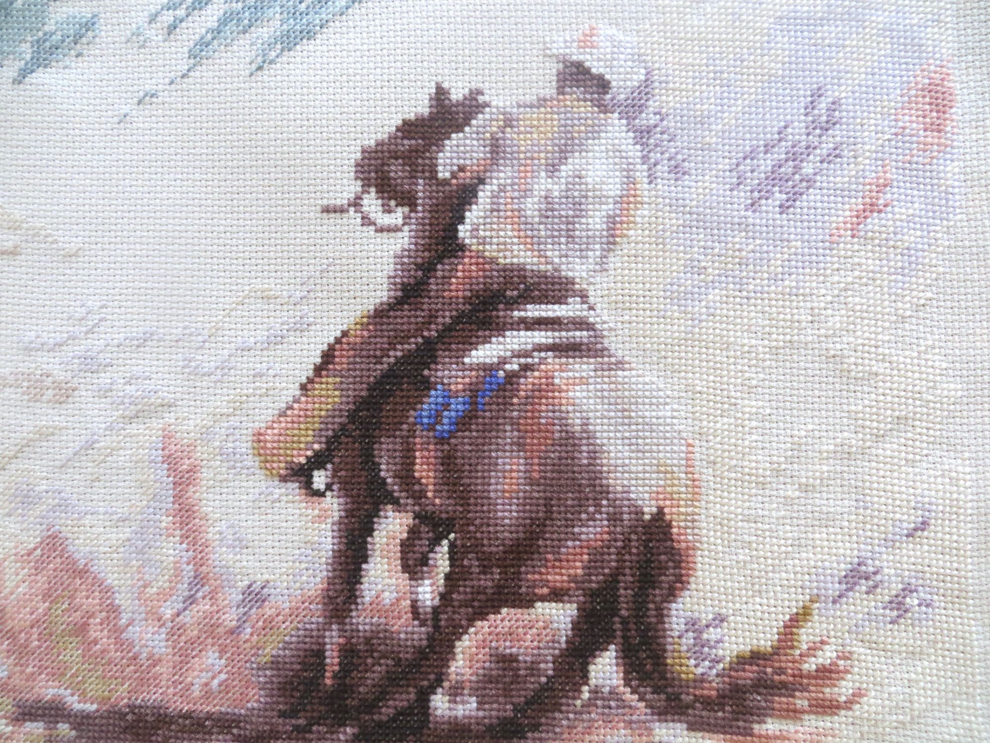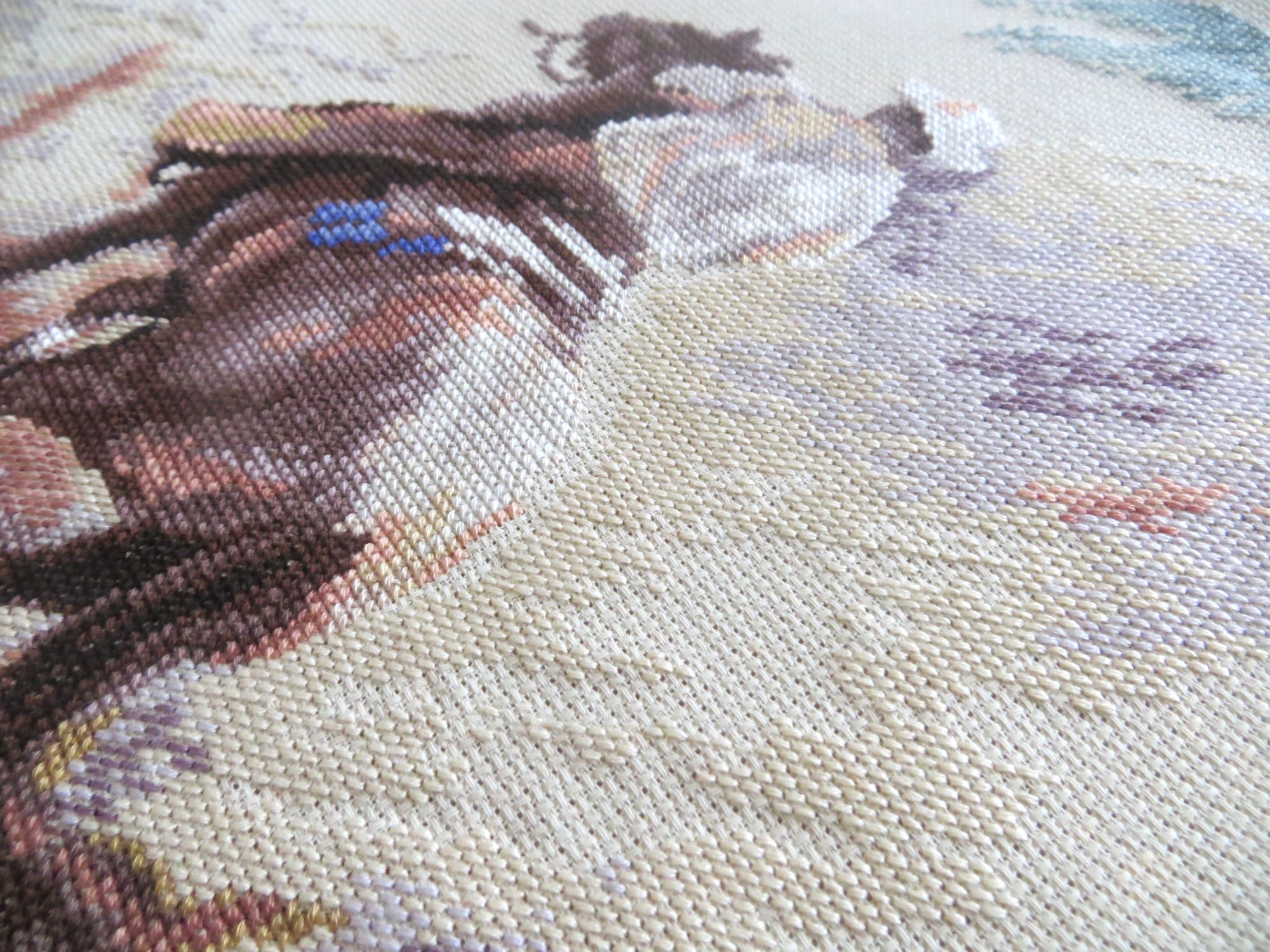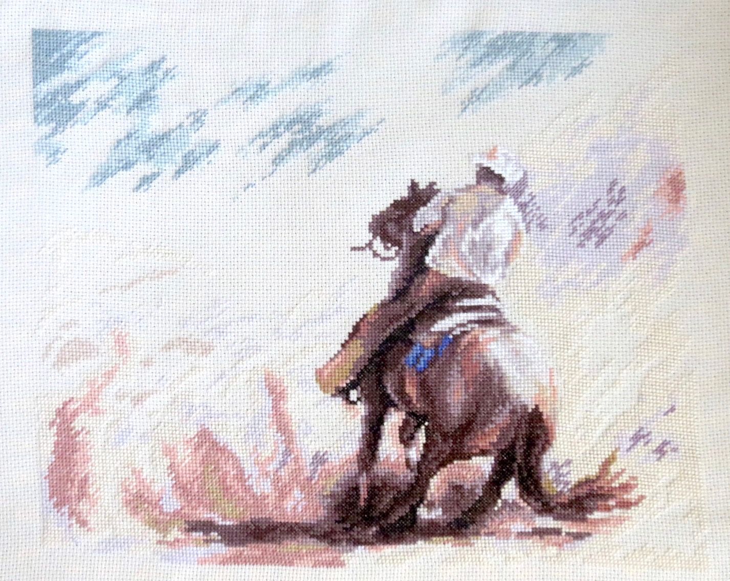 9 октября 2021 Всем добрый субботний день! Хочу показать вышивку, завершенную еще в прошлом месяце и ставшую для меня значимой в плане исполнения загаданного на нее желания. Начну с того, что более года я усиленно искала работу. Ежедневно рассылала пачками резюме, звонила, писала работодателям напрямую, но все безрезультатно. Проверяла, читают ли вообще работодатели отклики на сайте. Оказалось, что прочитанными оказались не более 30%. Откликались же вообще, наверное, в одном случае из 50, и то первым вопросом был вопрос не об опыте работы и квалификации, а, разумеется, о возрасте. После такого "оптимистичного" начала наш разговор быстренько сворачивался по инициативе другой стороны, иногда совсем неделикатным манером. Убедить руководителя о приеме на работу можно лишь в случае личной встречи, а как ее добиться, если на подступах к его телу сидят бездушные работницы сторонних агентств, которые просто тупо следуют вбитым в их бараньи головы стереотипам? От некоторых компаний отказалась сама в результате проведенных собеседований. В вакансии заявлено одно, а на деле оказывается совершенно другое, например, заявляют, что ищут переводчика, а на собеседовании оказывается, что это вакансия букировщика судов (то есть надо быть специалистом в области логистики и перевозок и быть на связи и на привязи к компьютеру 24/7/365, причем они работают даже в такие священные для россиян дни, как Новый год и 8 Марта). Сторонилась также организаций, где существует система штрафов, например, за опоздания на 15 минут или ранний уход с работы на столько же времени, и после трех таких нарушений следует увольнение (а мне к врачам надо часто ходить). Некоторые организации расположены в помещениях-бункерах без окон, где даже в осеннее время душно и темно. Страшно представить, как они там сидят летом («Без окон, без дверей полна горница людей»). Спасибо, в таком бункере я уже насиделась в свое время, чуть не задыхались там. Где-то сразу было видно, что это компания-однодневка, которая в ближайшем будущем прикажет долго жить. Мысль о вышивке на примету в виде лошадки витала давно, и я честно планировала ее воплотить в жизнь, но дальше планов как-то не шло… Была на примете пара лошадок. Они какие-то миленькие, но не более того, сердце не екало, поэтому вышивка все оттягивалась. Мне надо было, чтобы сюжет так торкнул, чтобы искры из глаз, огонь из ушей, пыль из-под копыт! И вот чудо свершилось! Лошадь мечты, видимо, у каждого своя. Свою я увидела здесь, на сайте, и моментально влюбилась – столько в этом дизайне силы, мощи, энергии, которая так и брызжет в каждом крестике! Набор купила в одночасье, потом выжидала несколько дней до нужного лунного дня. Еле дождалась, так хотелось поскорее начать! Между тем развесила ниточки на органайзер и даже заправила все иголочки. Долго и мучительно подыскивала нужную равномерку. Вначале планировала шить на ней, так как зашивка неполная, и даже после долгих сомнений и терзаний (долго пыталась попасть в цвет родной канвы. Заодно поблагодарю Светика СветланаМ за советы ) попробовала вышить кусочек, но что-то пошло не так… Незашитое пространство, конечно, смотрится на равномерке более выигрышно, чем на канве, но вот полукрест на ней совершенно потерялся. Исчезло ощущение вьющейся клубом пыли и движения, которое удачно передавалось на канве, лучше держа
