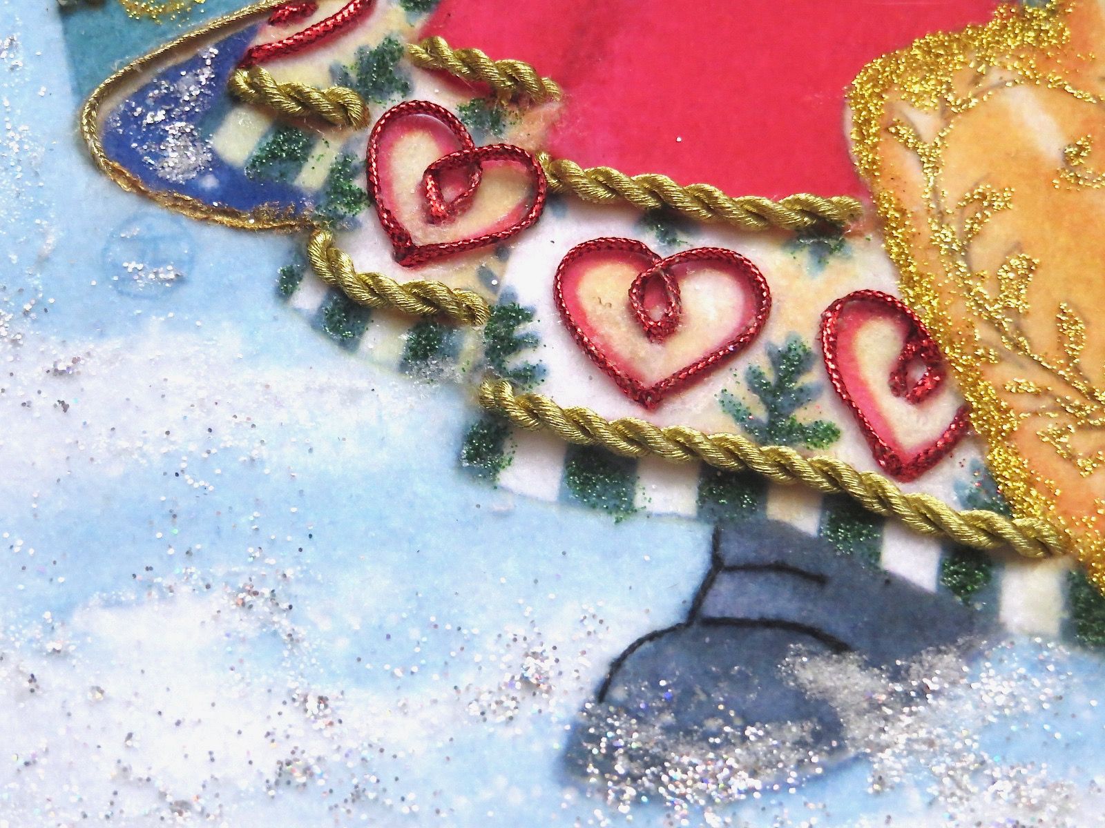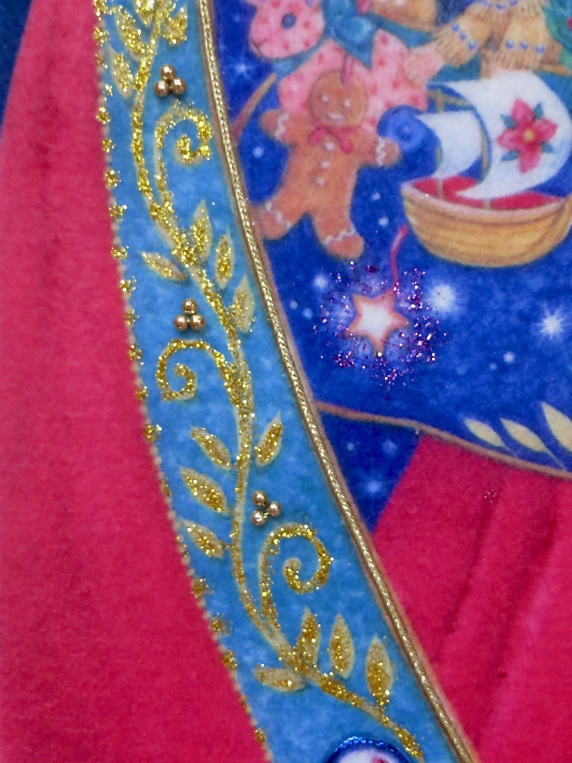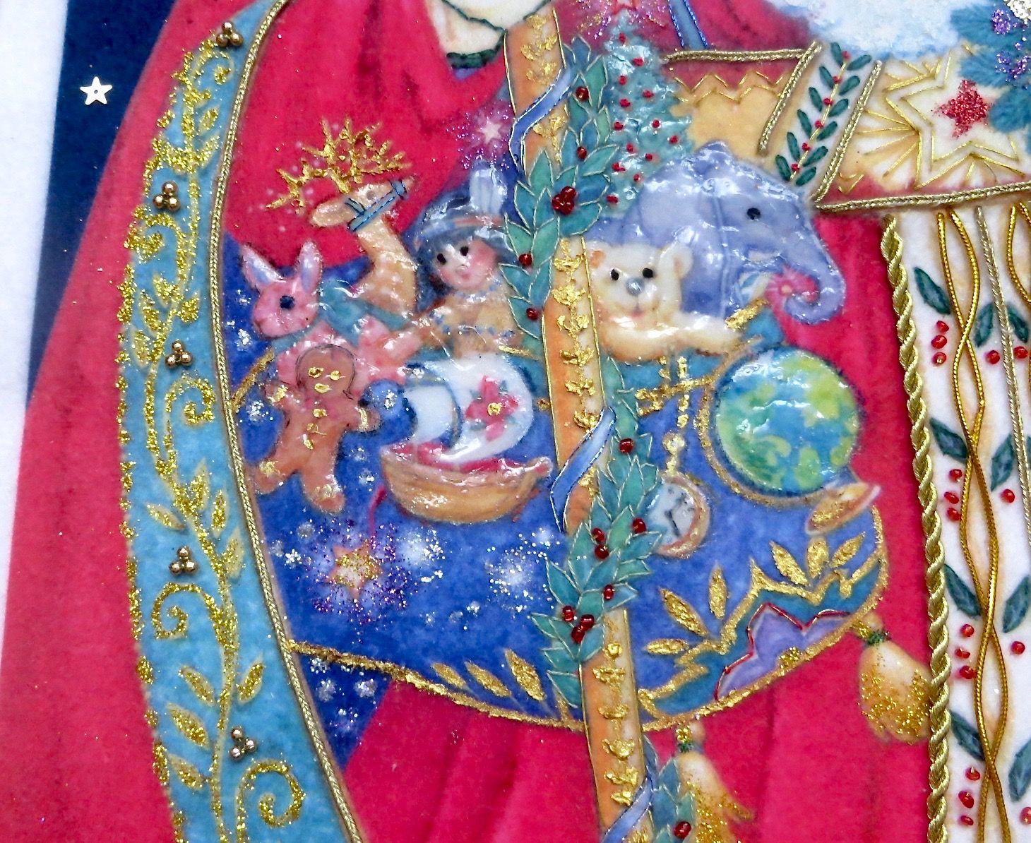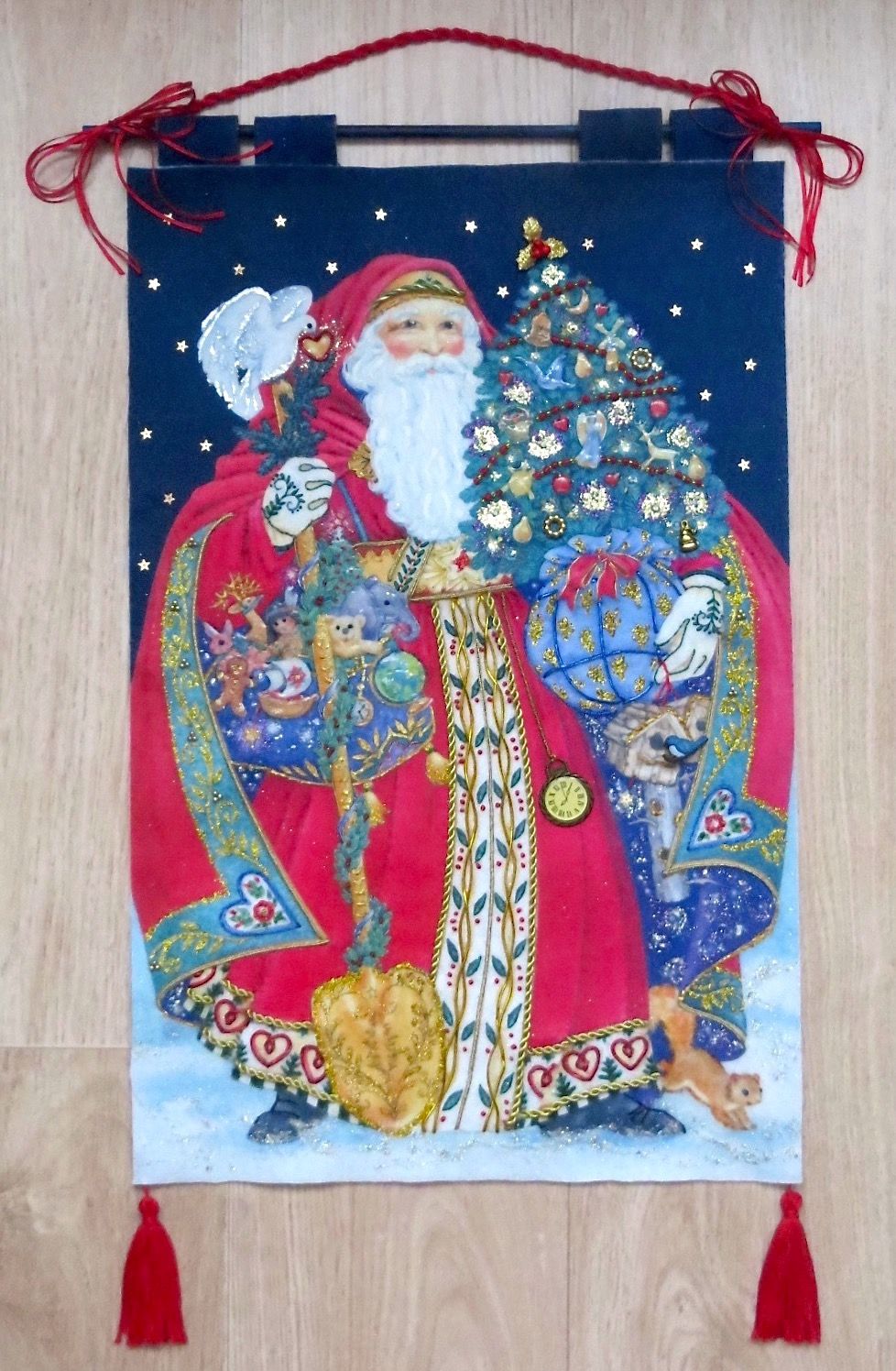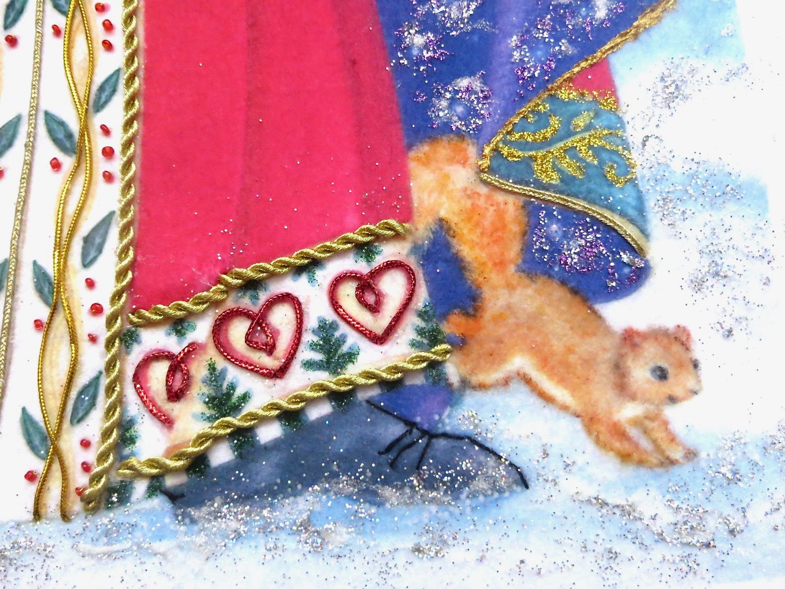 21 ноября 2021 А я принесла Дедушку Мороза! Немного не подгадала с рождением к официальному Дню рождения 18 ноября , ну да ничего, у меня будет 21 ноября . При декорировании использовала 5 видов шнуров, блестки разных мастей и видов, шармики, пастель, цветные карандаши, мулине, глиттер, бисер, бусины, пайетки, цепочки, краски акриловые и для ткани. На накидку пришила бусины, расписала глиттером, пришила шнурок в виде сердечка. На полы шубы пришила декоративные шнуры, вышила зеленые листочки по контуру, пришила бисер, немного прошлась бэком по верху ботинок. Лежал у меня много лет китайский некалиброванный бисер, и здесь его это отрицательное качество, разные размер, очень пригодилось (наконец-то!). У игрушек сделала повыразительнее глазки с помощью фрузелков, покрыла их 3D гелем для объема. Подправила елочку, добавив глиттера и шармиков, расшила мешок На скворечник посадила птичку, и картинка сразу ожила. И какой же Дед без часов, ведь надо вовремя успеть поздравить всех с праздником и раздать подарки! Расписала лопату глиттером и блестками (боже, как бедный дед умудряется все это удерживать в руках! ), на черенке вышила контуры листочков и пришила бисер-ягодки. Белочку сначала была мысль вышить, но потом передумала и просто подкрасила акварельными карандашами. Снежок украсила блестками. Надо видеть как он просто сумасшедше блестит и переливается, особенно вечером при искусственном освещении! Жаль, что фотографии это в полной мере не передают. Верх и низ и целиком Дальше была сборка, на которую потратила очень много времени, и все из-за того, что для того, чтобы подвесить панно на палочку, производитель предлагал с верха картинки для подвесов откромсать ножницами синий фетр Обрезанная картинка мне нравилась меньше, тем более что отрезать нужно было не меньше 5 см. Тогда я решила покрасить белый фетр, и начались эксперименты с краской, длившиеся почти целый день, настолько сложно было угадать с цветом. Красила на 3 раза., чтобы добиться более или менее совпадающего оттенка. Еще и палочку надо было покрасить. Затем сделала из мулине с помощью кординга шнурок-подвес, бантики и кисточки. Итог перед вами. Было Стало Я очень довольна результатом Панно внушительного размера получилось ярким, радующим взрывом красок, как и положено праздничному новогоднему дизайну. Спасибо Dimensions за восхитительный принт, действительно потребовавший применения фантазии и хомячьих запасов, конечно! ОльгаТольна, Гало4ка, irisheckin и 15 других сказали спасибо Поделиться сообщением Ссылка на сообщение