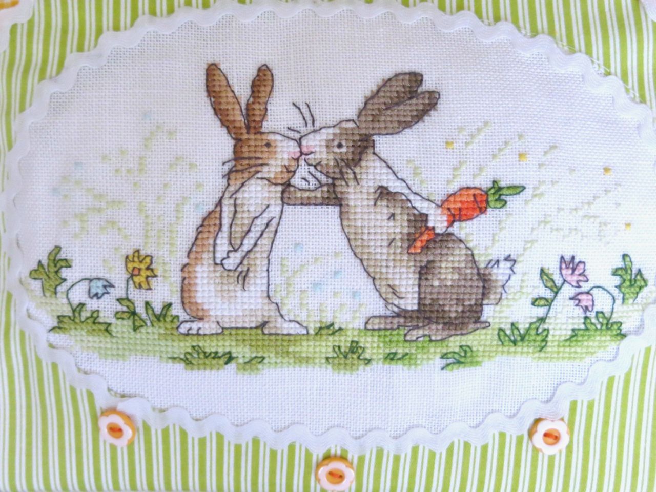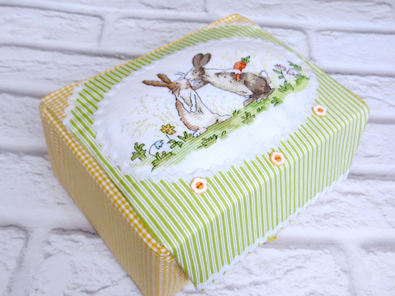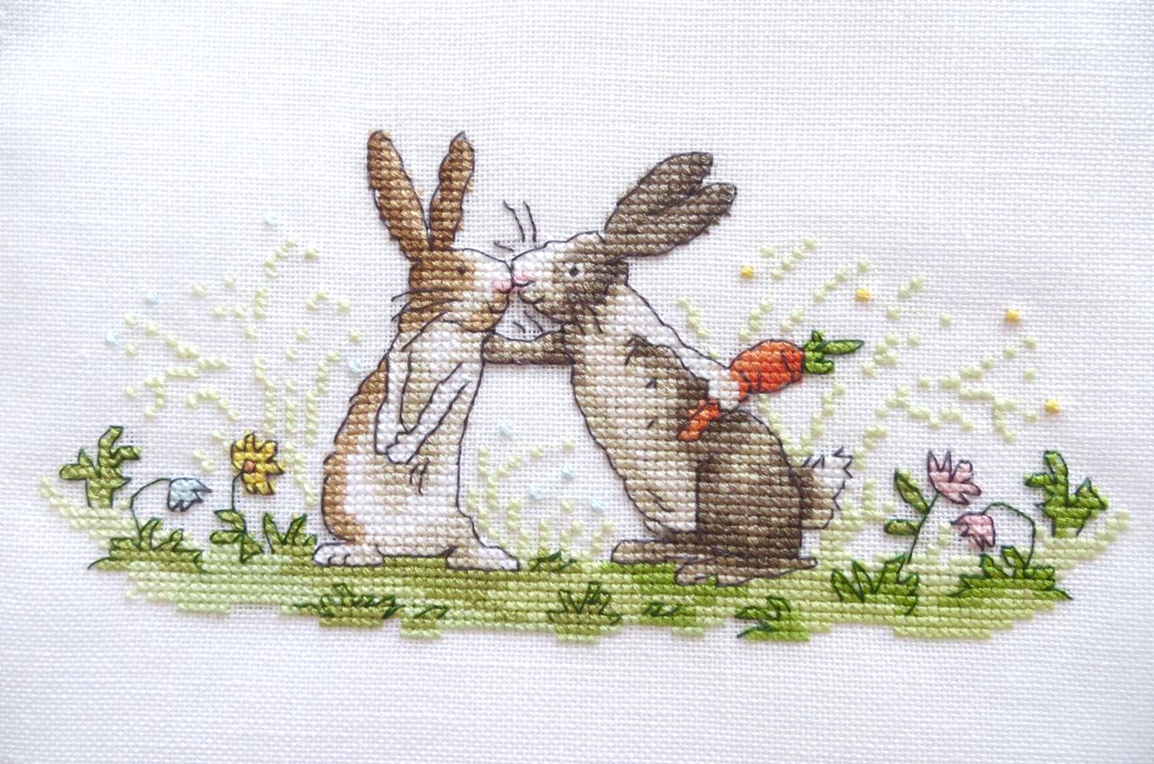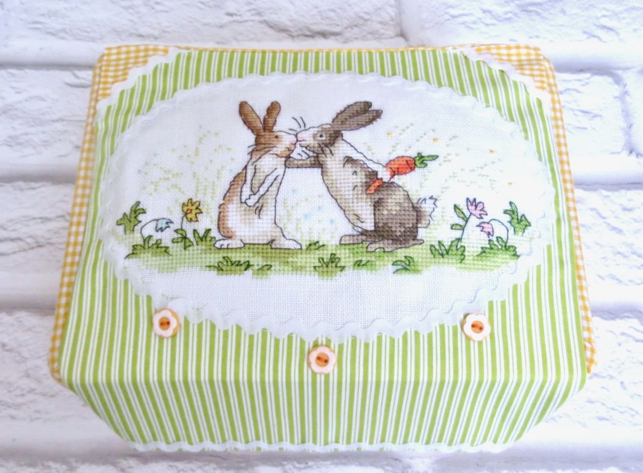 13 июня 2022 Доброго июньского дня всем! Все фото, кроме тех, что с оформлением, — для нового процесса Bothy Threads XAJ3, Some Bunny to Love. Им я открываю у себя сезон зайцев, о котором давно мечтала, а тут как нельзя кстати подвернулась возможность вышить этих чудесных ушастиков. Картинка очень трогательная, славная, милая! Глядя на нее, вспоминаешь детство и уютные, добрые сказки. Зайчики эти запечатлены в период ухаживания. Потом у них будет свадьба и куча деток (у Bothy Threads есть еще сюжеты родителей-зайцев с маленькими зайчатами). Примечательно, что на обложке набора превью дано на равномерке, а в набор вложена Аида. Половина цветов мулине — из новой палитры, их даже идентифицировать затруднительно. Цвета очень летние, сочные и в то же время нежные. Особенно порадовали зеленые оттенки сочной весенней травки. Для вышивки взяла равномерку Lugana 25 каунта, поэтому по размеру мои зайчики чуть больше заявленных 8х12 см. У Светика подсмотрела идею отзеркаливания правой части схемы. Мне понравилось, что зайчики будут находиться в центре лужайки, а не смещены влево, как на обложке. Кроме того, без увеличения размера дизайн был бы слишком мелким для оформления, согласно своей задумке, на крышку от использованной почтовой коробки Сразу оговорюсь, что задумка получилась не вполне удачной, так как коробка уже давно подверглась обряду обрезания, и края крышки оказались неровные. Вышила за 5 вечеров по будням, а оформляла больше недели. Шить не люблю, поэтому каждый раз собиралась с мыслями. Усугубляло положение и то, что чехол на коробку хотела съемный, чтобы можно было стирать. Нигде таких выкроек не видела (да и не искала), придумывала по ходу дела сама. Вот так выглядит часть чехла. Конечно, кое-где пришлось воспользоваться специальной хемлайновской двусторонней липкой лентой для тканей, иначе закрепить чехол сзади коробки было бы невозможно, но вся конструкция легко разбирается, стирается и собирается снова. При сборке внутри коробки неожиданно, в качестве приятного дополнения, образовался кармашек. Ткань специально не покупала, взяла ту, что была в запасе. Под овал с зайчиками подложила наполнитель, и вышивка получилась объемной. Фотографировать коробку оказалось крайне неблагодарным делом. Косяки вылезают мгновенно тут и там, вышивка кажется до безобразия мятой, а сам коробка — кривой и косой. Выражаю огромную благодарность за советы и поддержку Светику @SvetlanaM и Насте @Ivi Спасибо огромное, девочки!! Если кому-то интересно имя художника этих чудесных зайчат, — это Анита Джерам. Она родилась в английском г. Портсмут. После школы работала на фабрике по производству хрустящего картофеля, а также помощником в приюте для собак. Затем переехала в Манчестер, где выучилась на иллюстратора, и сейчас известна благодаря иллюстрациям к популярным детским книжкам. В настоящее время проживает на морском побережье в Северной Ирландии вместе со своим мужем, детьми и домашними животными. (Имя дизайнера, как и в случае с Heritage Crafts, остается неизвестным. Это кто-то из команды Bothy Threads, но точного имени я не нашла). На сайте Bothy Threads можно посмотреть фотографию Аниты и остальные дизайны зайками (и не только) по ее рисункам. https://www.bothythreads.com/shop/kits/artists/anita-jeram Судя по всему, двое зайцев, которых я вышила, успешно поженились и родили кучу детишек в количестве шести штук! Ivi, PrimaN, оленек и 17 других