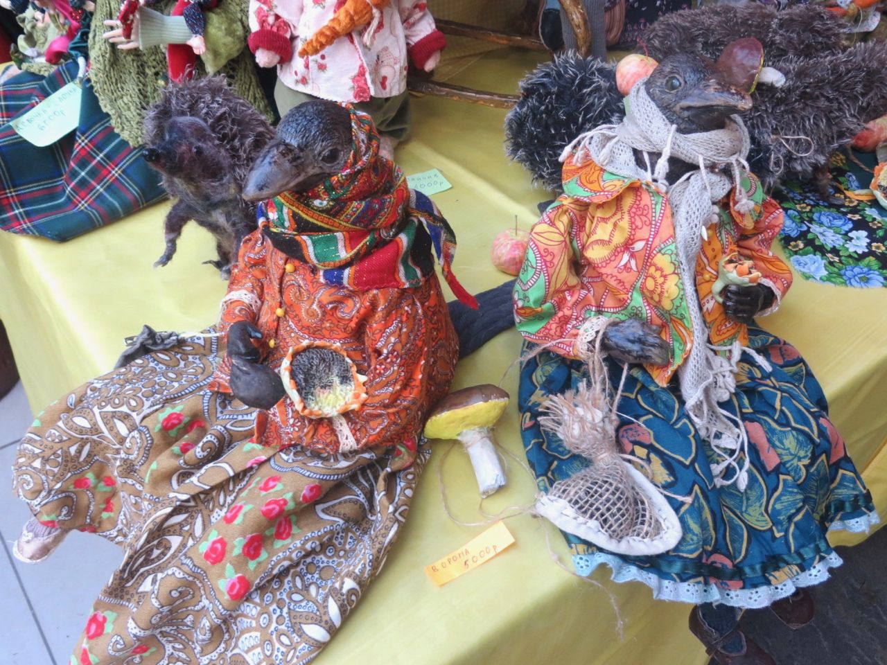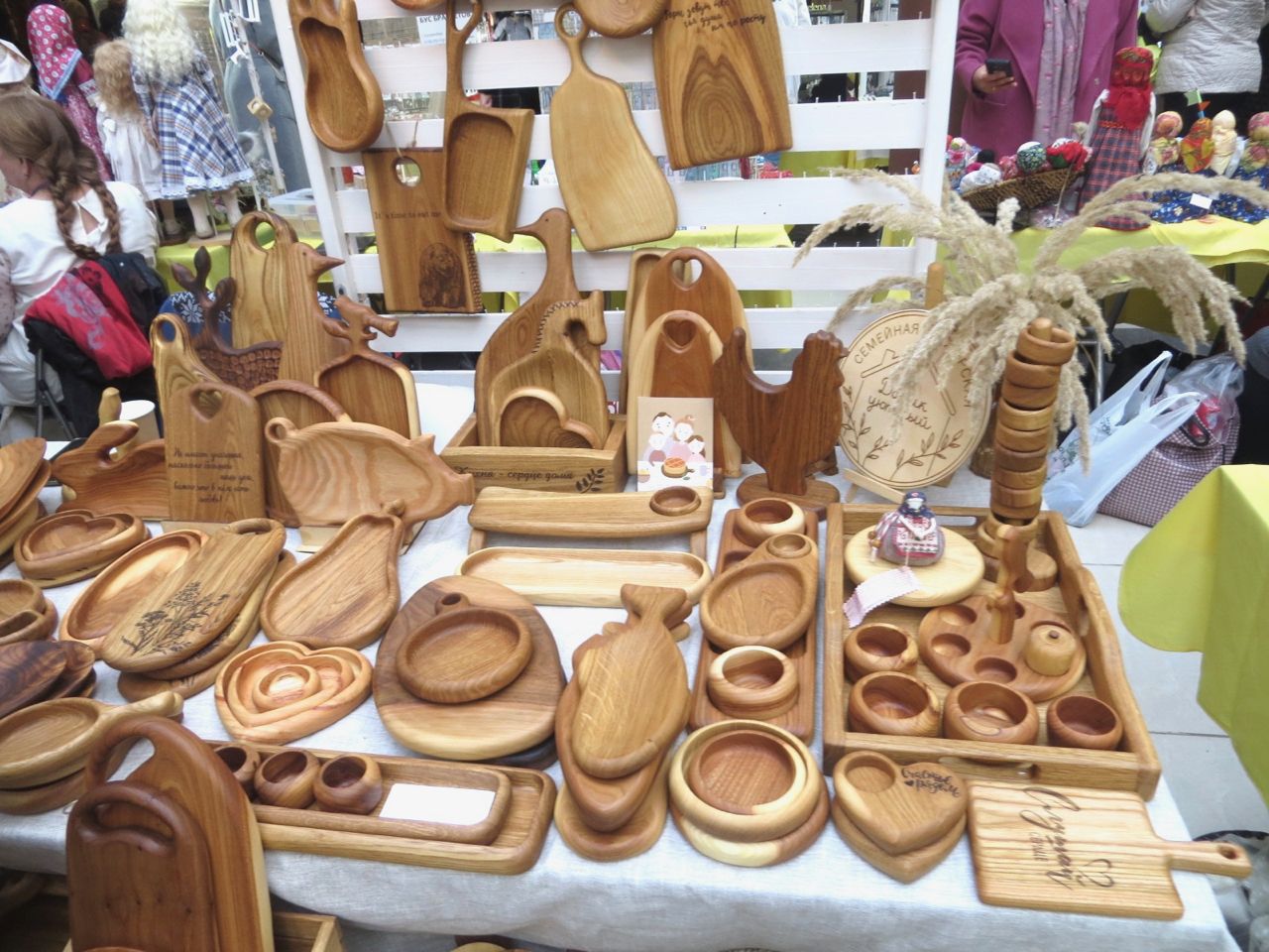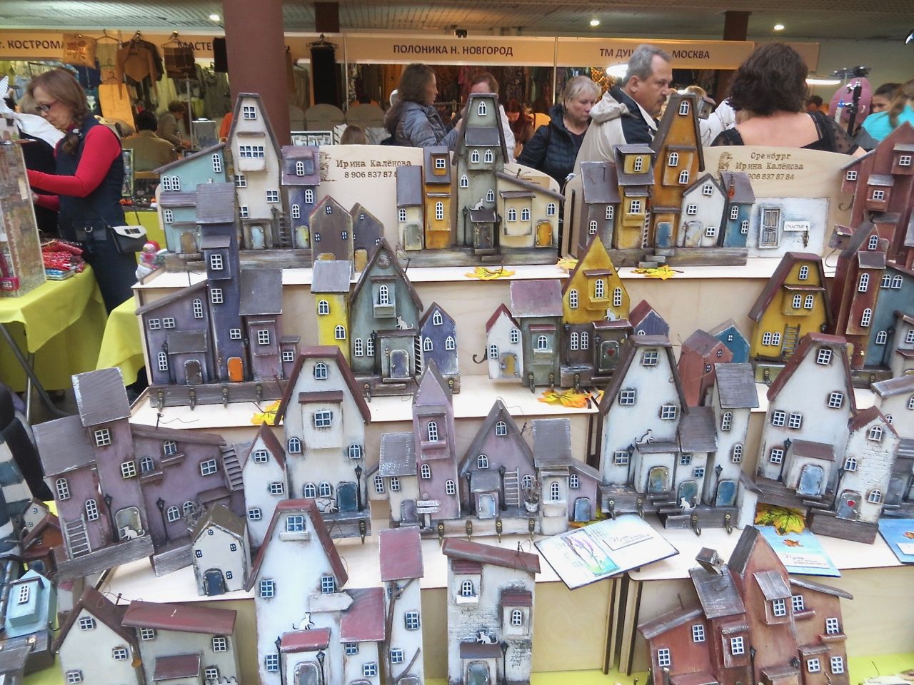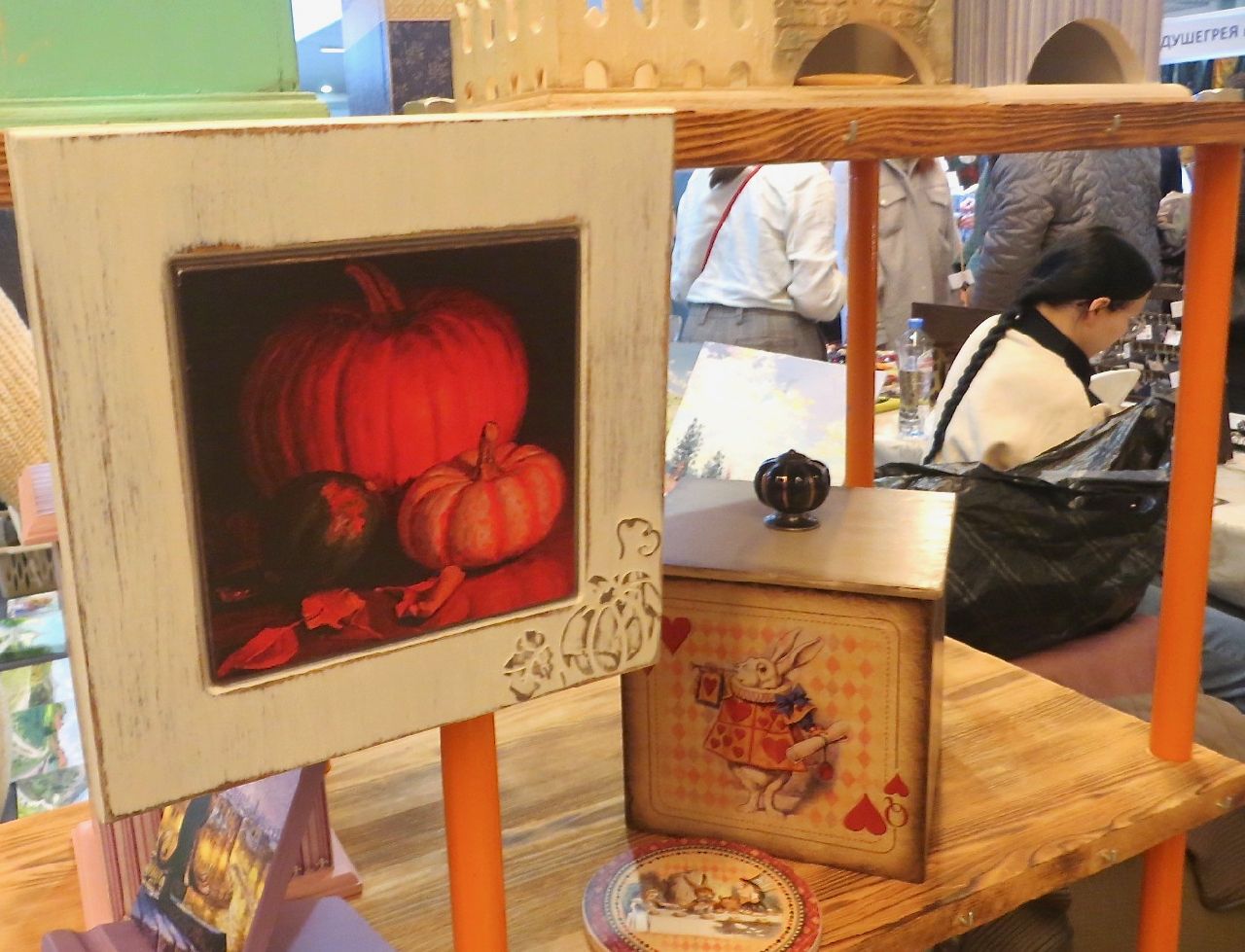 8 октября 2022 Сегодня у меня репортаж с выставки ремесел «Иван-да-Марья», которая проходит на этой неделе в Екатеринбурге. Из рекламы: «Проект направлен на возрождение традиционного народного искусства и поддержку мастеров, а также демонстрирует удивительные по красоте и технике работы и способствует популяризации ремесленного творчества среди молодежи, возрождает духовность и культурные традиции народного искусства». Выставка, как и ФР, длится 4 дня. Сразу замечу, что вышивки на ней почти нет. Была только одна участница с прикладной вышивкой. Работы оригинальные, изысканные, прекрасно и со вкусом оформлены. Выставка занимает 1 этаж. На 2-м этаже — разнообразные мастер-классы. Очень хотела попасть на мастер-класс по изготовлению гончарных изделий, но … не так я себе это представляла. Поняла, что за подобным мастер-классом лучше всего идти в гончарную мастерскую, а не усаживаться на чистенький пластиковый стульчик за стерильный гончарный кружочек и лепить что-то из заранее прилизанного глиняного шарика . К тому же за готовой работой нужно через неделю куда-то ехать, но в рабочее время для меня это нереально. Интересным показался мастер-класс по прядению, но отдавать 400 руб. просто за то, чтобы подержаться за веретено и куделю, я финансово не готова. Порадовало, что можно спокойно фотографировать (лично мне подтвердили организаторы), и никто тебе за это в пятак не даст . Народа было много, особенно во второй половине дня, но к стендам можно спокойно подойти и все рассмотреть, а не так, как, бывало, на ФР, когда стоишь к стенду, казалось бы, уже вечность, а не двигаешься ни на миллиметр, и у прилавка топчутся все те же покупатели, которые там были полчаса назад. Много изделий из дерева, кожи, огромное количество разнообразных куколок и игрушек. Во всей красе представлена бижутерия и керамика. Поразили гигантские валенки 65 размера! Все рядом с ними останавливаются и охают от изумления. В конце фоторепортажа есть фотографии цветов и ягод. Вначале хотела пройти мимо, подумав, что они искусственные, однако это тоже изысканная керамика! Все тычинки и пестики вырисованы настолько отчетливо, что цветы, малина, земляника и грибочки кажутся живыми. От одуванчиков долго не могла отойти. Понравилось много чего, но цены…они явно не для Уральского региона. Восхитилась талантом и умениями мастеров из Свердловской области и гостей из Пермского края, Башкирии... Примерно четверть павильона занимали продукты — мед, разные чаи, натуральные масла, сыр, сладости и еще много чего. Я купила копченый лучок и чеснок (запах умопомрачительный!) для добавления в блюда, копченые сушеные томаты с морской солью, соль с белыми грибами, чипсы с бананом и корицей, грушей, персиком и клубникой. И о покупках: они скромны и проходили под знаком осени, листопада и, разумеется, тыкв! Купила крошечные тыковки-свечки, а на другом стенде — деревянные подсвечники, и так совпало, что они идеально состыковались друг с другом, хотя при покупке я об этом не задумывалась. Не удержалась, приобрела керамическую тыковку со съемной крышкой. Цвет у нее такой аппетитный, что так и хочется отломить кусочек! У одной мастерицы приглянулись сырные доски. Изготавливает она их с помощью декупажа, но не обычного, а со вживлением лазерной распечатки. В описании могу ошибаться. Продавец мне рассказала те