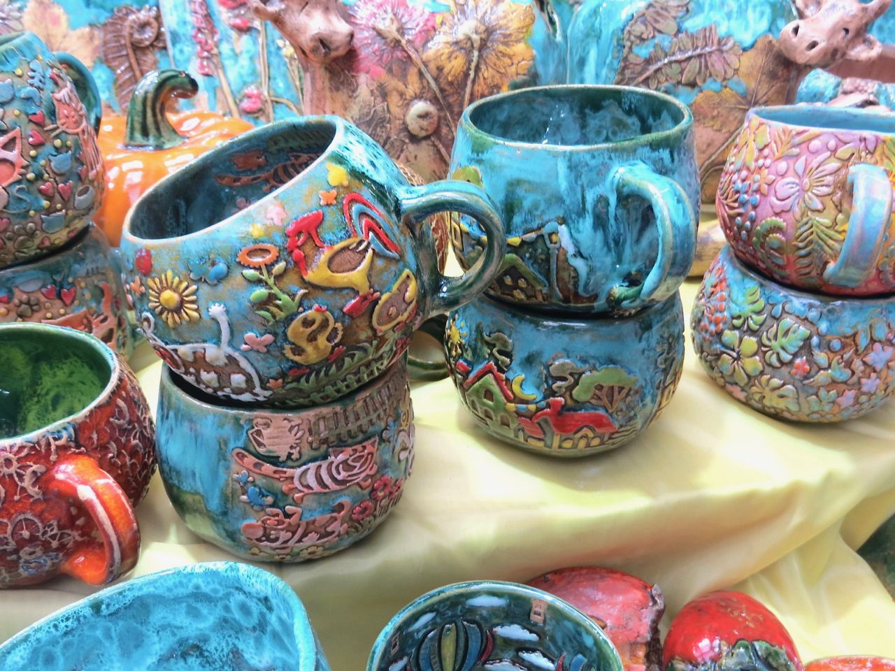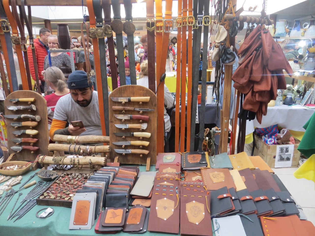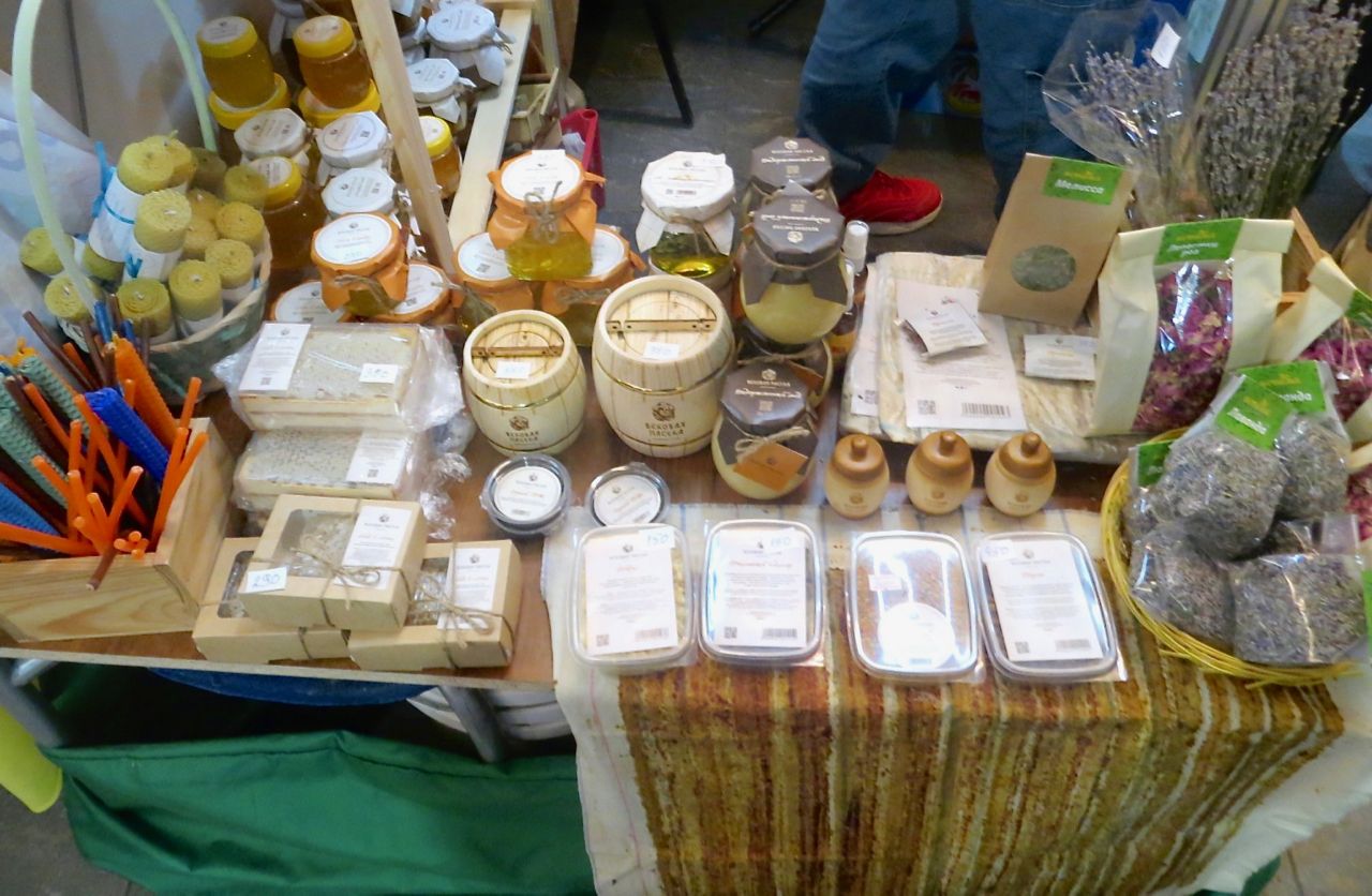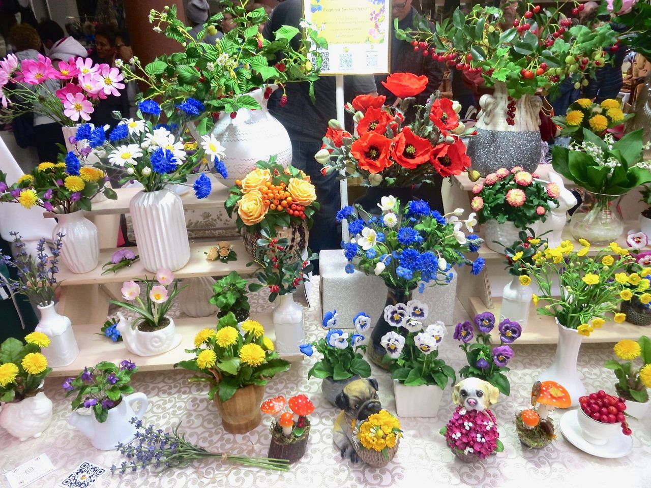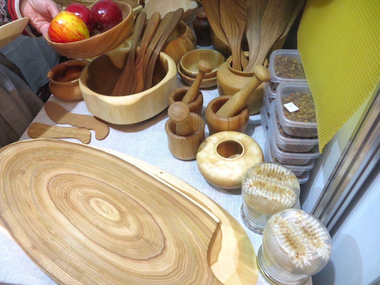 8 октября 2022 Сегодня у меня репортаж с выставки ремесел «Иван-да-Марья», которая проходит на этой неделе в Екатеринбурге. Из рекламы: «Проект направлен на возрождение традиционного народного искусства и поддержку мастеров, а также демонстрирует удивительные по красоте и технике работы и способствует популяризации ремесленного творчества среди молодежи, возрождает духовность и культурные традиции народного искусства». Выставка, как и ФР, длится 4 дня. Сразу замечу, что вышивки на ней почти нет. Была только одна участница с прикладной вышивкой. Работы оригинальные, изысканные, прекрасно и со вкусом оформлены. Выставка занимает 1 этаж. На 2-м этаже — разнообразные мастер-классы. Очень хотела попасть на мастер-класс по изготовлению гончарных изделий, но … не так я себе это представляла. Поняла, что за подобным мастер-классом лучше всего идти в гончарную мастерскую, а не усаживаться на чистенький пластиковый стульчик за стерильный гончарный кружочек и лепить что-то из заранее прилизанного глиняного шарика . К тому же за готовой работой нужно через неделю куда-то ехать, но в рабочее время для меня это нереально. Интересным показался мастер-класс по прядению, но отдавать 400 руб. просто за то, чтобы подержаться за веретено и куделю, я финансово не готова. Порадовало, что можно спокойно фотографировать (лично мне подтвердили организаторы), и никто тебе за это в пятак не даст . Народа было много, особенно во второй половине дня, но к стендам можно спокойно подойти и все рассмотреть, а не так, как, бывало, на ФР, когда стоишь к стенду, казалось бы, уже вечность, а не двигаешься ни на миллиметр, и у прилавка топчутся все те же покупатели, которые там были полчаса назад. Много изделий из дерева, кожи, огромное количество разнообразных куколок и игрушек. Во всей красе представлена бижутерия и керамика. Поразили гигантские валенки 65 размера! Все рядом с ними останавливаются и охают от изумления. В конце фоторепортажа есть фотографии цветов и ягод. Вначале хотела пройти мимо, подумав, что они искусственные, однако это тоже изысканная керамика! Все тычинки и пестики вырисованы настолько отчетливо, что цветы, малина, земляника и грибочки кажутся живыми. От одуванчиков долго не могла отойти. Понравилось много чего, но цены…они явно не для Уральского региона. Восхитилась талантом и умениями мастеров из Свердловской области и гостей из Пермского края, Башкирии... Примерно четверть павильона занимали продукты — мед, разные чаи, натуральные масла, сыр, сладости и еще много чего. Я купила копченый лучок и чеснок (запах умопомрачительный!) для добавления в блюда, копченые сушеные томаты с морской солью, соль с белыми грибами, чипсы с бананом и корицей, грушей, персиком и клубникой. И о покупках: они скромны и проходили под знаком осени, листопада и, разумеется, тыкв! Купила крошечные тыковки-свечки, а на другом стенде — деревянные подсвечники, и так совпало, что они идеально состыковались друг с другом, хотя при покупке я об этом не задумывалась. Не удержалась, приобрела керамическую тыковку со съемной крышкой. Цвет у нее такой аппетитный, что так и хочется отломить кусочек! У одной мастерицы приглянулись сырные доски. Изготавливает она их с помощью декупажа, но не обычного, а со вживлением лазерной распечатки. В описании могу ошибаться. Продавец мне рассказала те