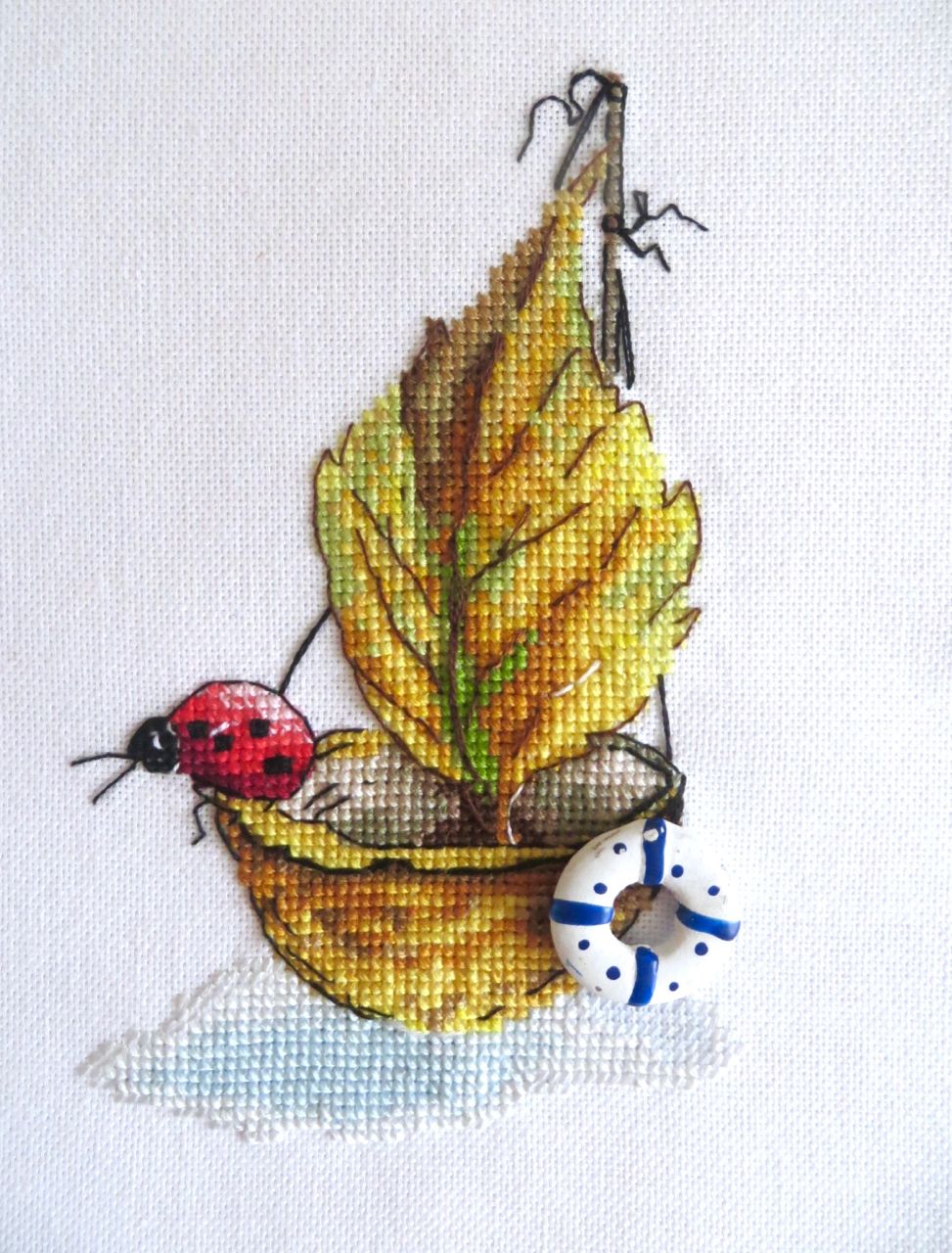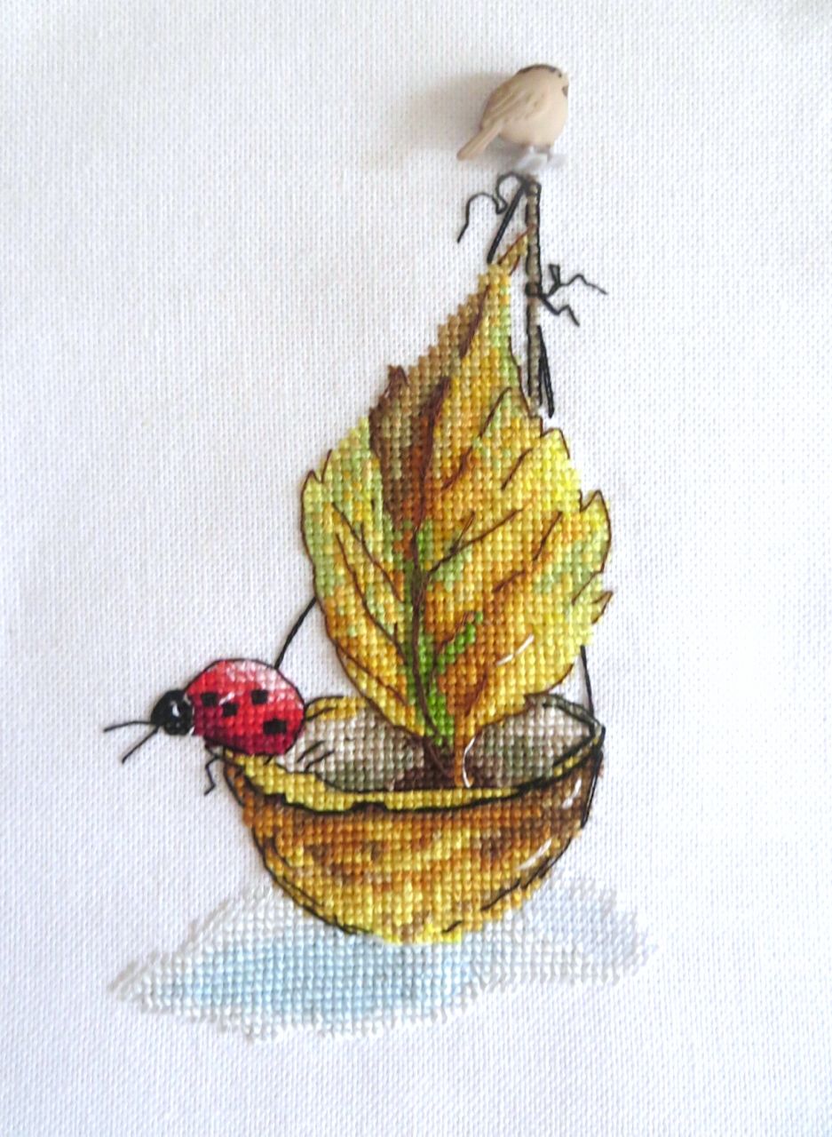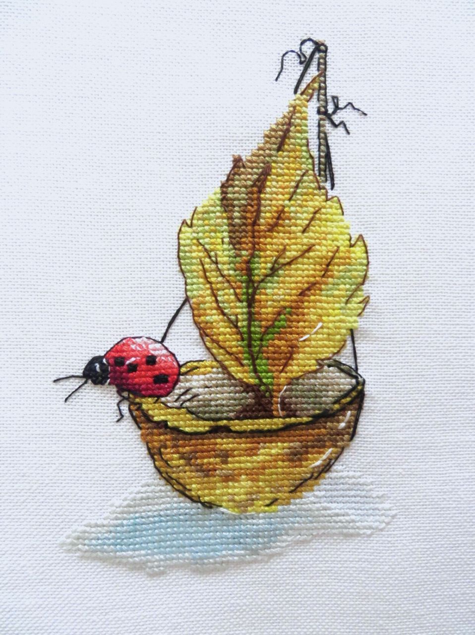 30 октября 2022 Всем доброго воскресного вечера! Как жаль, что выходные опять подходят к концу! Сегодня оформила спонтанно вышитый за неделю милый и добрый сюжет, неожиданно и очень удачно вклинившийся в мои вышивальные планы. Недавно, как всегда, в обеденный перерыв листала ленту в ВК с вышивальными новостями и увидела объявление о конкурсе в группе Ирины Листьевой «Руки Рады» на лучшее название ее нового дизайна, причем на эту группу я раньше подписана не была. Настолько была очарована милейшим созданием, отважно плывущим к дальним берегам в хрупкой скорлупке , что сразу написала несколько вариантов и — надо же! — победила. Счастлива, что Ирина выбрала мой вариант "Крылатый капитан"! И уж совсем неожиданным стала схема от дизайнера в подарок, которую я, конечно же, сразу, залпом, вышила. Как можно было откладывать в долгий ящик это чудесное создание, пробуждающее самые теплые чувства! К тому же цветовая палитра оказалась полностью созвучна моему настроению на данный момент, перекликающимся с цветами яркой осени. Для вышивки взяла белорусскую равномерку. Всего используется 31 цвет DMC (к счастью, все цвета оказались у меня в закромах, это судьба! ), 4 бленда. В итоге размер вышивки получился 14 х 9 см. Вышивалось очень легко, на одном дыхании, благо что схема очень удобная, грамотная, продуманная. Одно удовольствие! Естественно, вышивку надо было сразу же оформить. Опять же по чудесному стечению обстоятельств в закромах нашлась купленная как-то на "Озоне" овальная рамочка. Захотелось чуть-чуть заполнить пространство в левом верхнем углу . Хотелось что-то незаметное, не бросающееся в глаза и не отвлекающее взгляд от главного героя, поэтому шармики отмела сразу, хотя варианты примерки могу вам показать: В голову пришел вариант оформления по принципу «теневого паспарту». Из синей папки, в которой с работы принесла распечатку схемы, буквально за несколько секунд вырезала птичку. Мне нравится, что получилось, как я и задумывала -- неброско и неприметно, но в гармонии с сюжетом. Уже и на стеночке над письменным столом разместила. Мама давно мне говорила, что слева надо пустое пространство чем-то заполнить, какой-нибудь вышитой животинкой. И вот свершилось! Фото делала вечером, поэтому не совсем удачное. Очень благодарна дизайнеру за возможность вышить этот чудо! Фотографии для процесса. Ирина Листьева, "Крылатый капитан", счетный крест Превью: kreolka, Звезда в шоке, Гало4ка и 16 других сказали спасибо Поделиться сообщением Ссылка на сообщение