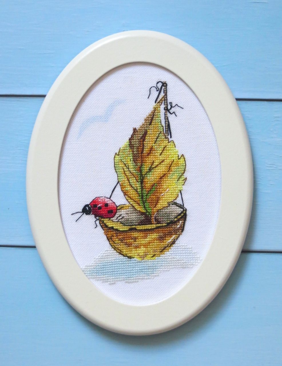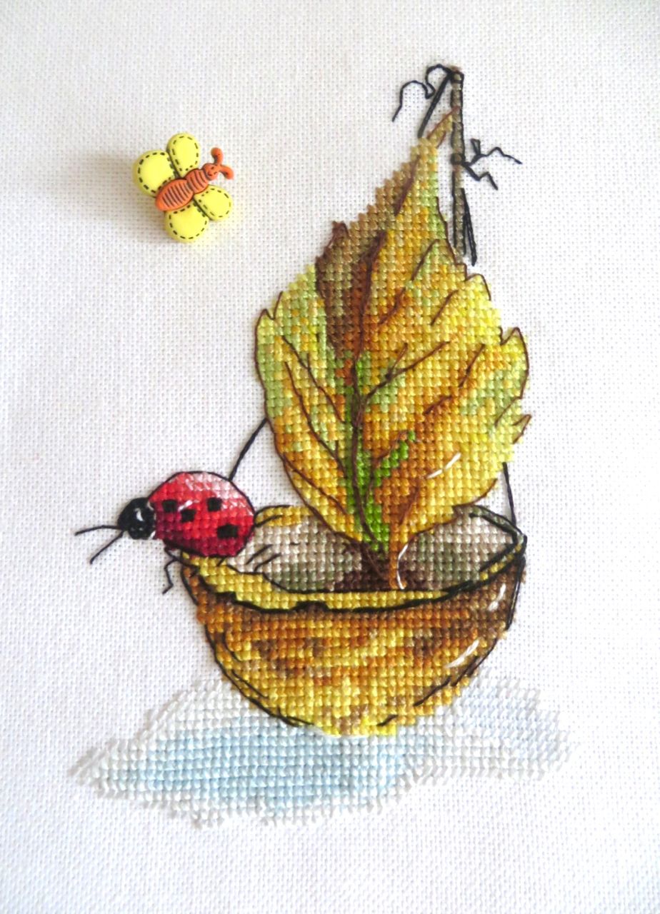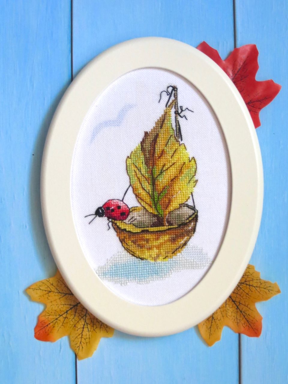 30 октября 2022 Всем доброго воскресного вечера! Как жаль, что выходные опять подходят к концу! Сегодня оформила спонтанно вышитый за неделю милый и добрый сюжет, неожиданно и очень удачно вклинившийся в мои вышивальные планы. Недавно, как всегда, в обеденный перерыв листала ленту в ВК с вышивальными новостями и увидела объявление о конкурсе в группе Ирины Листьевой «Руки Рады» на лучшее название ее нового дизайна, причем на эту группу я раньше подписана не была. Настолько была очарована милейшим созданием, отважно плывущим к дальним берегам в хрупкой скорлупке , что сразу написала несколько вариантов и — надо же! — победила. Счастлива, что Ирина выбрала мой вариант "Крылатый капитан"! И уж совсем неожиданным стала схема от дизайнера в подарок, которую я, конечно же, сразу, залпом, вышила. Как можно было откладывать в долгий ящик это чудесное создание, пробуждающее самые теплые чувства! К тому же цветовая палитра оказалась полностью созвучна моему настроению на данный момент, перекликающимся с цветами яркой осени. Для вышивки взяла белорусскую равномерку. Всего используется 31 цвет DMC (к счастью, все цвета оказались у меня в закромах, это судьба! ), 4 бленда. В итоге размер вышивки получился 14 х 9 см. Вышивалось очень легко, на одном дыхании, благо что схема очень удобная, грамотная, продуманная. Одно удовольствие! Естественно, вышивку надо было сразу же оформить. Опять же по чудесному стечению обстоятельств в закромах нашлась купленная как-то на "Озоне" овальная рамочка. Захотелось чуть-чуть заполнить пространство в левом верхнем углу . Хотелось что-то незаметное, не бросающееся в глаза и не отвлекающее взгляд от главного героя, поэтому шармики отмела сразу, хотя варианты примерки могу вам показать: В голову пришел вариант оформления по принципу «теневого паспарту». Из синей папки, в которой с работы принесла распечатку схемы, буквально за несколько секунд вырезала птичку. Мне нравится, что получилось, как я и задумывала -- неброско и неприметно, но в гармонии с сюжетом. Уже и на стеночке над письменным столом разместила. Мама давно мне говорила, что слева надо пустое пространство чем-то заполнить, какой-нибудь вышитой животинкой. И вот свершилось! Фото делала вечером, поэтому не совсем удачное. Очень благодарна дизайнеру за возможность вышить этот чудо! Фотографии для процесса. Ирина Листьева, "Крылатый капитан", счетный крест Превью: kreolka, Звезда в шоке, Гало4ка и 16 других сказали спасибо Поделиться сообщением Ссылка на сообщение