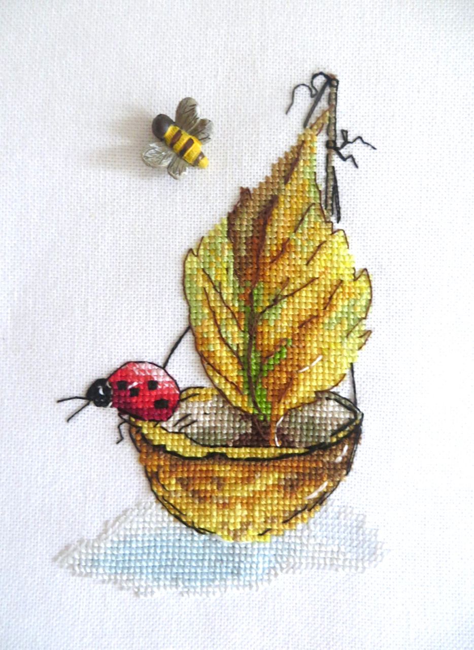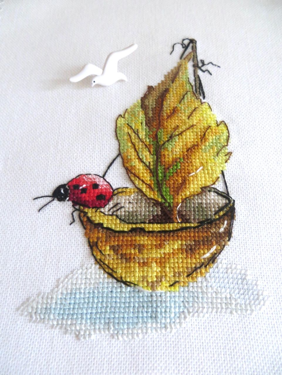 31 октября 2022 12 часов назад, Raduga777 сказал(а): Всем доброго воскресного вечера! Как жаль, что выходные опять подходят к концу! Сегодня оформила спонтанно вышитый за неделю милый и добрый сюжет, неожиданно и очень удачно вклинившийся в мои вышивальные планы. Недавно, как всегда, в обеденный перерыв листала ленту в ВК с вышивальными новостями и увидела объявление о конкурсе в группе Ирины Листьевой «Руки Рады» на лучшее название ее нового дизайна, причем на эту группу я раньше подписана не была. Настолько была очарована милейшим созданием, отважно плывущим к дальним берегам в хрупкой скорлупке , что сразу написала несколько вариантов и — надо же! — победила. Счастлива, что Ирина выбрала мой вариант "Крылатый капитан"! И уж совсем неожиданным стала схема от дизайнера в подарок, которую я, конечно же, сразу, залпом, вышила. Как можно было откладывать в долгий ящик это чудесное создание, пробуждающее самые теплые чувства! К тому же цветовая палитра оказалась полностью созвучна моему настроению на данный момент, перекликающимся с цветами яркой осени. Для вышивки взяла белорусскую равномерку. Всего используется 31 цвет DMC (к счастью, все цвета оказались у меня в закромах, это судьба! ), 4 бленда. В итоге размер вышивки получился 14 х 9 см. Вышивалось очень легко, на одном дыхании, благо что схема очень удобная, грамотная, продуманная. Одно удовольствие! Естественно, вышивку надо было сразу же оформить. Опять же по чудесному стечению обстоятельств в закромах нашлась купленная как-то на "Озоне" овальная рамочка. Захотелось чуть-чуть заполнить пространство в левом верхнем углу . Хотелось что-то незаметное, не бросающееся в глаза и не отвлекающее взгляд от главного героя, поэтому шармики отмела сразу, хотя варианты примерки могу вам показать: В голову пришел вариант оформления по принципу «теневого паспарту». Из синей папки, в которой с работы принесла распечатку схемы, буквально за несколько секунд вырезала птичку. Мне нравится, что получилось, как я и задумывала -- неброско и неприметно, но в гармонии с сюжетом. Уже и на стеночке над письменным столом разместила. Мама давно мне говорила, что слева надо пустое пространство чем-то заполнить, какой-нибудь вышитой животинкой. И вот свершилось! Фото делала вечером, поэтому не совсем удачное. Очень благодарна дизайнеру за возможность вышить этот чудо! Фотографии для процесса. Ирина Листьева, "Крылатый капитан", счетный крест Превью: Наташа,чудесный дизайн миниатюрки! Очень понравилось! И теневая птичка хорошо дополнила сюжет,как тут и была. феня777, СветланаМ, Raduga777 и 1 другой сказали спасибо Поделиться сообщением Ссылка на сообщение