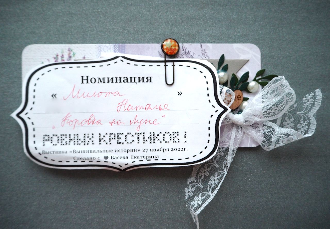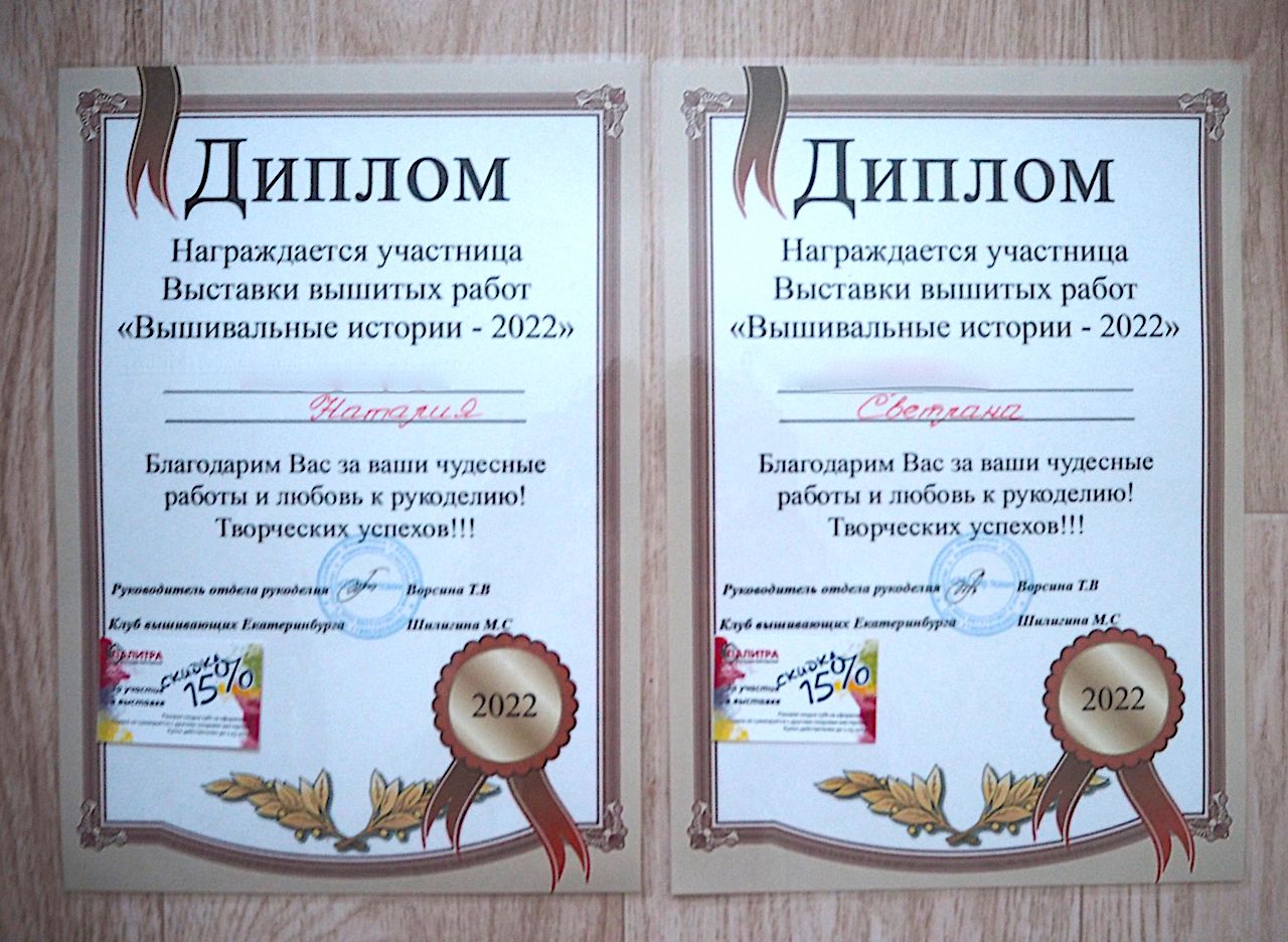 27 ноября 2022 Съездила на торжественное закрытие выставки вышитых работ в ЦУМе. К сожалению, без Светы (Светик, выздоравливай! ). Участницы приехали не все. В минус 20 как-то не хочется в выходной лишний раз куда-то выползать из дома. Тем не менее, было довольно людно. Нас даже профессионально фотографировали А это -- организатор выставки Алена Праздник состоялся благодаря ее усилиям, за что ей огромное спасибо! Атмосфера была приподнятая, было полное ощущение, что 10 ноября продолжается И организатором, и участницами было сказано много теплых и добрых слов в адрес друг друга. Все выступления сопровождались аплодисментами, иногда переходящими в овации Победителем стала вышивка с зеленым драконом, завоевавшая 1 место (Мне больше всего понравились две работы: и И если первую как-то все же вскользь отметили, то "Яблоки на снегу" с вороном остались незамеченными. Жаль. Очень достойная картина, на мой взгляд). Если ничего не путаю (приношу извинения, если что), то 2-е место досталось вышивке лентами , 3-е -- HAED Приз зрительских симпатий завоевала, как я и предполагала, "Шоколадная ночь" . Были и другие номинации. Все их запомнить было просто невозможно, поэтому лишь приведу работы, которые были так или иначе отмечены: домики -- за кропотливость сборки , гобелен тоже был принят с восторгом многими , балерина от Dimensions , два ботанических этюда от V.Enginger (на фото -- справа) , а также , (как вышивка к Дню матери ) и наши со Светой вышивки Мне дали приз "За милоту": магнитик-календарь ручной работы от спонсоров выставки , Свете -- как "повелительнице фрузелков" (открывать не стала). Еще заметила одну вышивку, которой в тот день, когда я ее посещала, не было. Мне очень понравилось оформление, тем более что у меня на одной из "Формул рукоделия" была куплена схема с автографом автора Кроме того, все участницы, представившие свои работы для выставки, получили дипломы и скидку 15% на оформление от багетной мастерской "Палитра" (наши фамилии убрала , а Свете "Палитра" дала еще один сертификат на оформление) . Мой Котофей, которого я наконец-то сфотографировала, неожиданно для меня завоевал приз от дизайнера Александры Кулаковой, вот такую схему В общем, праздник удался, желание творить увеличилось многократно, и это главное! PrimaN, Surik, Zanfiska и 17 других сказали спасибо Поделиться сообщением Ссылка на сообщение
