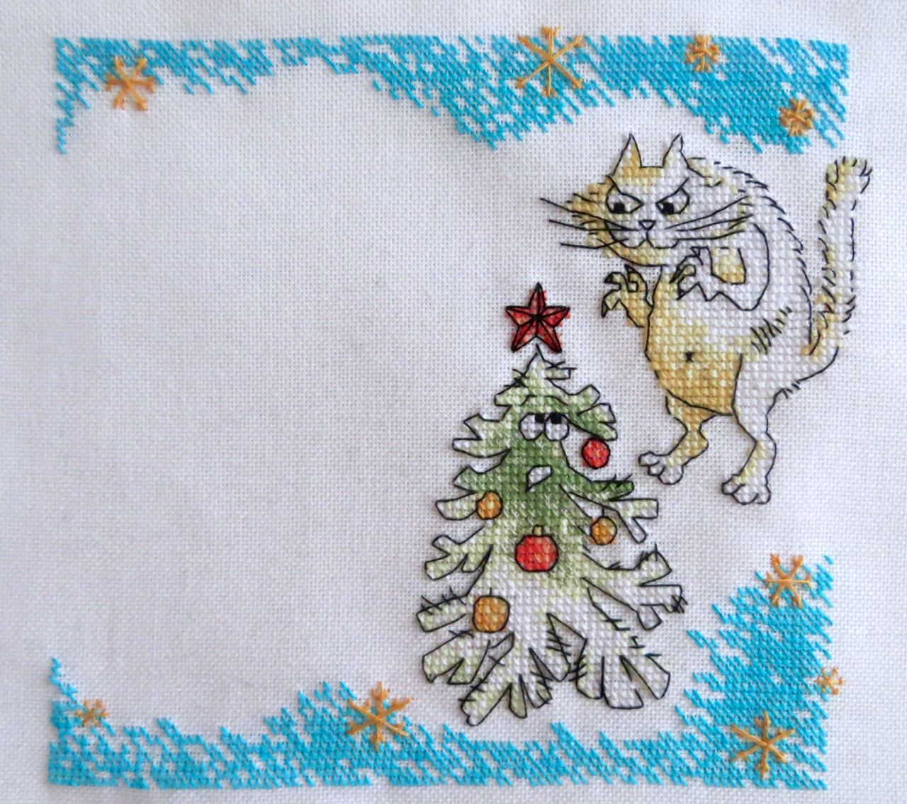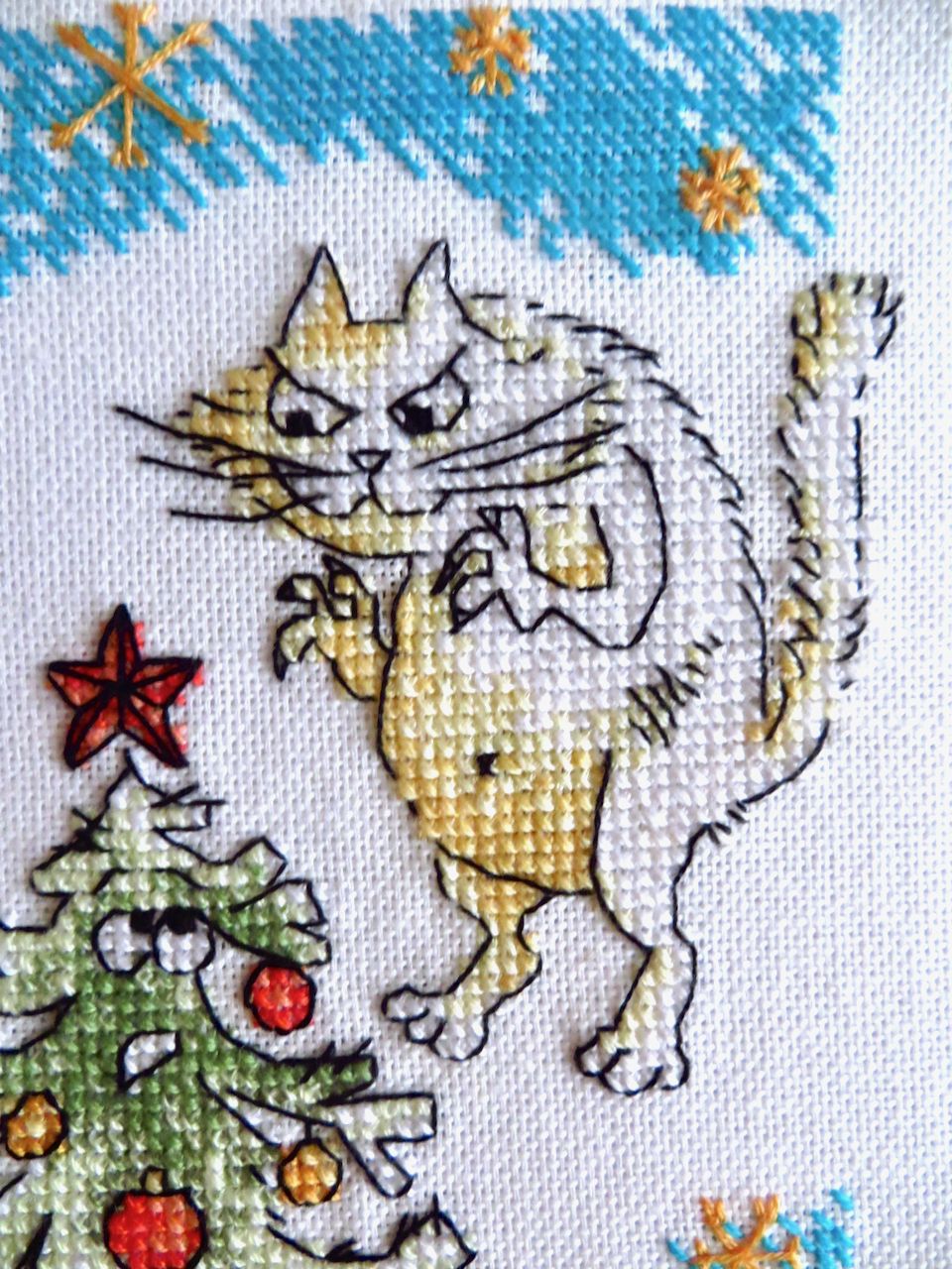 15 января 2023 7 часов назад, Raduga777 сказал(а): Не терпиться показать свой первый финиш в новом году, получившийся довольно символичным. Вышивка спонтанная, весёлая и желанная. История её такова: в одной из групп в ВК в конце декабря подводились итоги конкурса схем для вышивания «Как кошка с собакой», главными героями которого, как видно из названия, были коты и собаки. На этапе голосования моё внимание привлекла забавная схема Елены Кокориной «Мечта и цель» с целеустремлённым котом, новогодней мечтой которого стало завалить ненавистную ёлку. Дизайн — просто огонь! Изображена зловещая сцена: кот (вполне возможно, что в состоянии аффекта), выпустив когти, пошел в наступление на наряженную ёлку, которая смотрит на животное ошалевшим от ужаса взглядом. Своим мощным психологическим воздействием, накалом страстей, переживаниями и выразительными эмоциями отчаяния и страха дизайн перекликается с картиной Эдварда Мунка «Крик». Настал час расплаты. У кота стоит дыбом шерсть, у ёлки от страха дыбом встали иголки. Прочитав стишок, долго смеялась. Сразу вспомнила Светиных кошек (справедливости ради замечу, что по отношению к установленной дома зелёной красавице они ведут себя более или менее корректно. Очевидно, сказывается успех должного педагогического воспитания и особого подхода в сочетании с глубоким знанием кошачьей психологии и учета потребностей, настроения кошек и их эмоционального фона ), и захотелось поздравить их этой вышивкой (кошек Светика я обычно поздравляю с Новым годом отдельно). В нетерпении ерзала, ожидая схему. Проблема была в том, что конкурсные схемы высылались почти перед самым моим отъездом из города, 27 декабря, поэтому мои мечты и цели были изначально недостижимы, но я старалась. Если бы не работа, то, конечно, закончила и подарила бы 29-го числа, когда со Светиком отмечали НГ. Много времени ушло на подготовку. Вроде бы и количество цветов мулине DMC небольшое, но из них в наличии у меня оказалось только два. Остальные пришлось подбирать в других палитрах, а за голубым даже сбегать в магазин, благо что он рядом. Вышивала на белорусской равномерке, за что поблагодарила себя сотню раз, так как буквы вышивать на канве было бы затруднительно, и смотрелось бы не так аккуратно. От себя вышила пупок на пузике кота и добавила точки в букве «ё». Оформила как открытку, которую при желании можно повесить на елочку: Размер вышивки на канве 30-го каунта — 15,5 х 14,3 см. В общем, в отношении сроков исполнения свои силы я явно переоценила и до отъезда успела вышить только синий фон. Закончила вышивку и оформление в открытку на днях, а подарила сегодня, когда отмечали старый Новый год. На обороте разместила для кошек стишок собственного сочинения. Надеюсь, они прочитают и останутся довольны пожеланиями и будут признательны дизайнеру и художнику за воплощение их мечты хотя бы на открытке! Вообще же очень хочется уйти в 100% оплачиваемый творческий отпуск лет так на 8-10 и вышивать, вышивать, вышивать… Фотографии для процесса: Схема Елены Кокориной "Мечта и цель". Счетный крест. Превью: Наташа,котик-прелесть...я сначала подумала,что это открытка,а не вышивка. Буквы так аккуратно вышиты! Сюжет улетный.А когда прочитала стишок,вообще была ,,улыбка до ушей,, И как интересно ты сюжет описала ,просто нет слов...стихи на обратной стороне наверняка понравятся ко