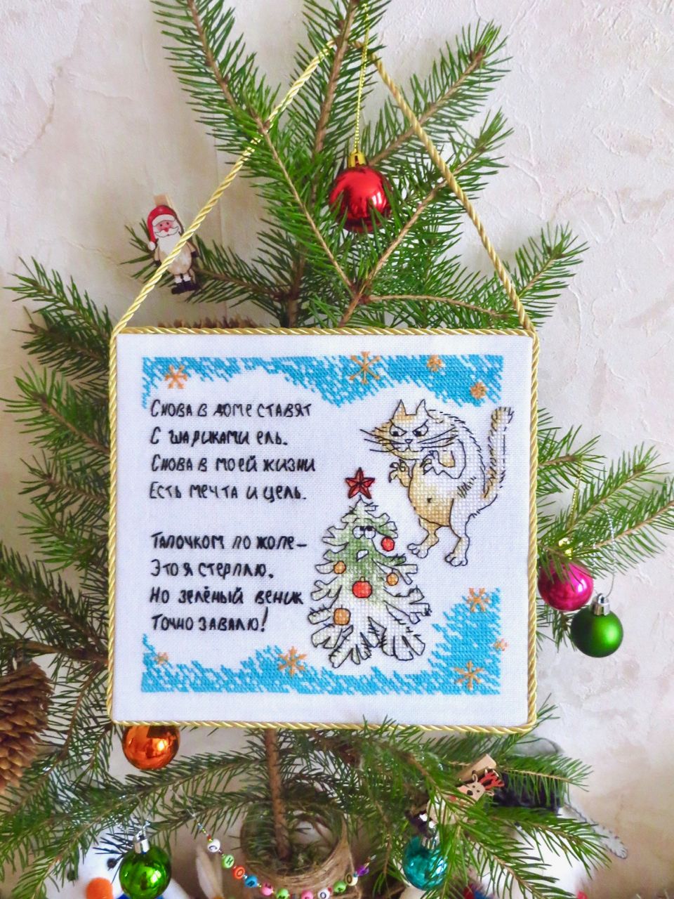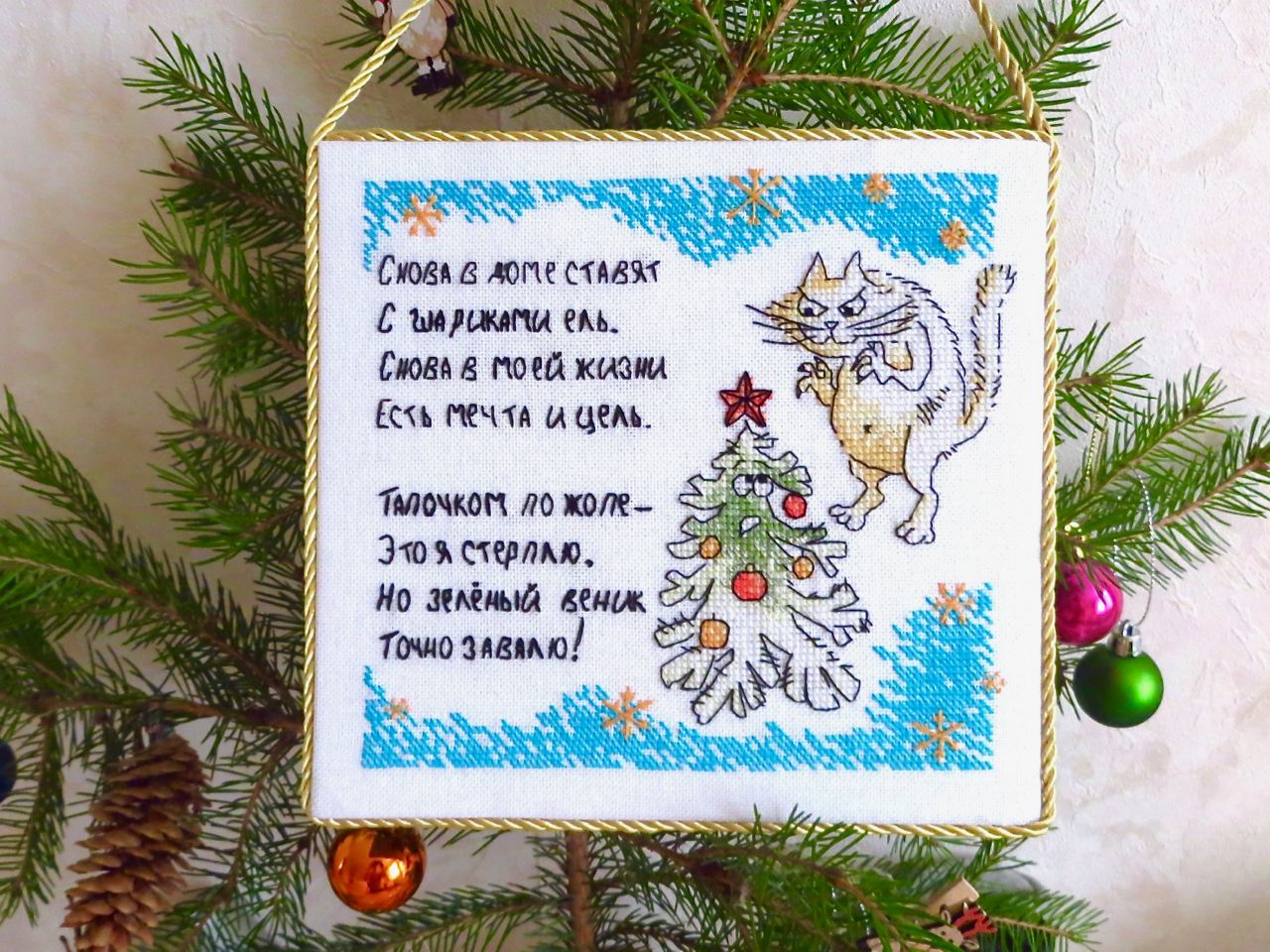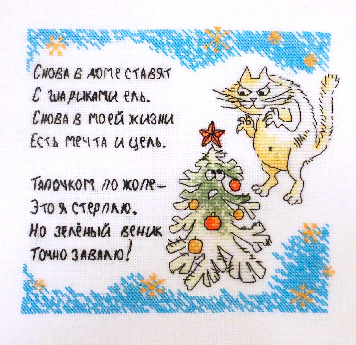 14 января 2023 Не терпиться показать свой первый финиш в новом году, получившийся довольно символичным. Вышивка спонтанная, весёлая и желанная. История её такова: в одной из групп в ВК в конце декабря подводились итоги конкурса схем для вышивания «Как кошка с собакой», главными героями которого, как видно из названия, были коты и собаки. На этапе голосования моё внимание привлекла забавная схема Елены Кокориной «Мечта и цель» с целеустремлённым котом, новогодней мечтой которого стало завалить ненавистную ёлку. Дизайн — просто огонь! Изображена зловещая сцена: кот (вполне возможно, что в состоянии аффекта), выпустив когти, пошел в наступление на наряженную ёлку, которая смотрит на животное ошалевшим от ужаса взглядом. Своим мощным психологическим воздействием, накалом страстей, переживаниями и выразительными эмоциями отчаяния и страха дизайн перекликается с картиной Эдварда Мунка «Крик». Настал час расплаты. У кота стоит дыбом шерсть, у ёлки от страха дыбом встали иголки. Прочитав стишок, долго смеялась. Сразу вспомнила Светиных кошек (справедливости ради замечу, что по отношению к установленной дома зелёной красавице они ведут себя более или менее корректно. Очевидно, сказывается успех должного педагогического воспитания и особого подхода в сочетании с глубоким знанием кошачьей психологии и учета потребностей, настроения кошек и их эмоционального фона ), и захотелось поздравить их этой вышивкой (кошек Светика я обычно поздравляю с Новым годом отдельно). В нетерпении ерзала, ожидая схему. Проблема была в том, что конкурсные схемы высылались почти перед самым моим отъездом из города, 27 декабря, поэтому мои мечты и цели были изначально недостижимы, но я старалась. Если бы не работа, то, конечно, закончила и подарила бы 29-го числа, когда со Светиком отмечали НГ. Много времени ушло на подготовку. Вроде бы и количество цветов мулине DMC небольшое, но из них в наличии у меня оказалось только два. Остальные пришлось подбирать в других палитрах, а за голубым даже сбегать в магазин, благо что он рядом. Вышивала на белорусской равномерке, за что поблагодарила себя сотню раз, так как буквы вышивать на канве было бы затруднительно, и смотрелось бы не так аккуратно. От себя вышила пупок на пузике кота и добавила точки в букве «ё». Оформила как открытку, которую при желании можно повесить на елочку: Размер вышивки на канве 30-го каунта — 15,5 х 14,3 см. В общем, в отношении сроков исполнения свои силы я явно переоценила и до отъезда успела вышить только синий фон. Закончила вышивку и оформление в открытку на днях, а подарила сегодня, когда отмечали старый Новый год. На обороте разместила для кошек стишок собственного сочинения. Надеюсь, они прочитают и останутся довольны пожеланиями и будут признательны дизайнеру и художнику за воплощение их мечты хотя бы на открытке! Вообще же очень хочется уйти в 100% оплачиваемый творческий отпуск лет так на 8-10 и вышивать, вышивать, вышивать… Фотографии для процесса: Схема Елены Кокориной "Мечта и цель". Счетный крест. Превью: СветланаМ, irisheckin, Хозяйка смешных зверей и 17 других сказали спасибо Поделиться сообщением Ссылка на сообщение