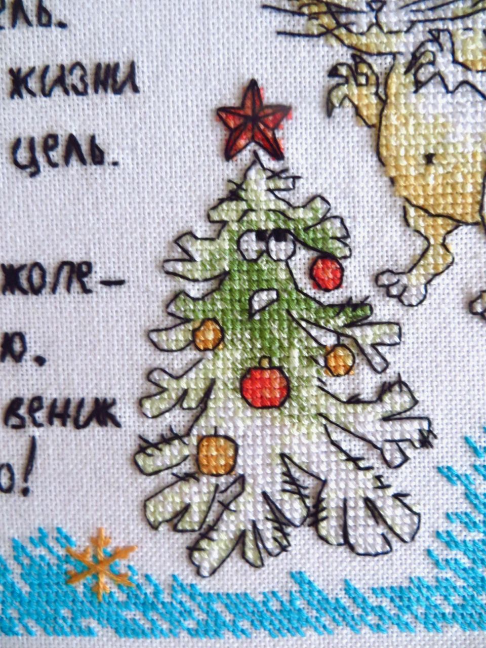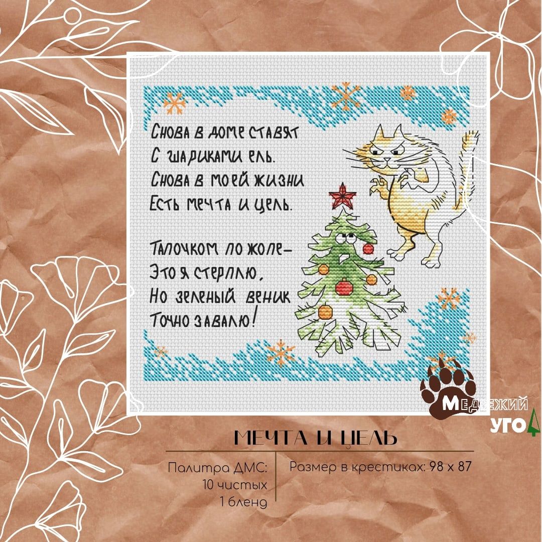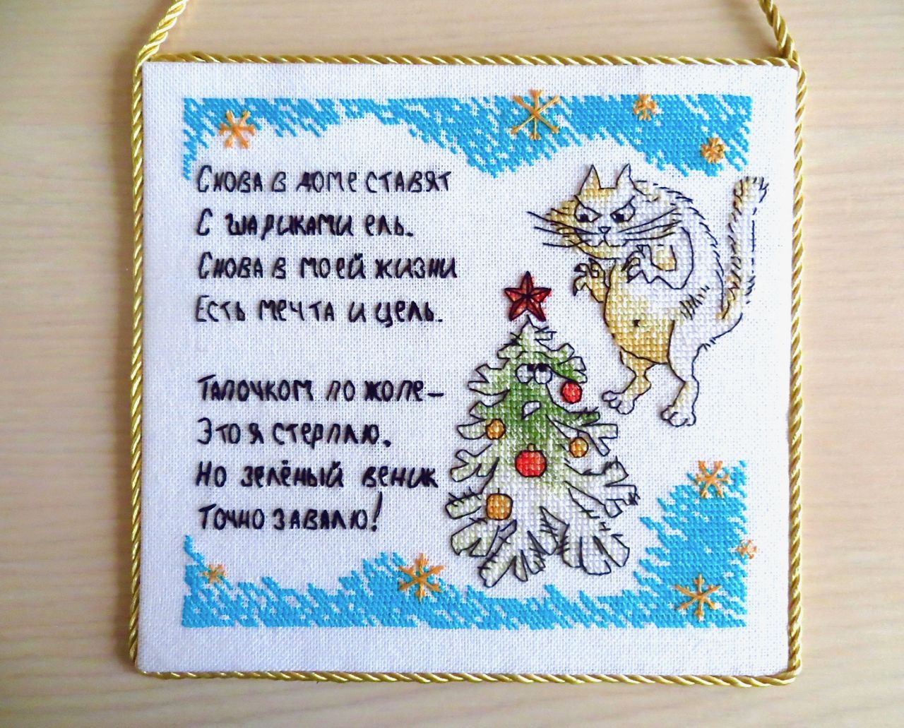 14 января 2023 Не терпиться показать свой первый финиш в новом году, получившийся довольно символичным. Вышивка спонтанная, весёлая и желанная. История её такова: в одной из групп в ВК в конце декабря подводились итоги конкурса схем для вышивания «Как кошка с собакой», главными героями которого, как видно из названия, были коты и собаки. На этапе голосования моё внимание привлекла забавная схема Елены Кокориной «Мечта и цель» с целеустремлённым котом, новогодней мечтой которого стало завалить ненавистную ёлку. Дизайн — просто огонь! Изображена зловещая сцена: кот (вполне возможно, что в состоянии аффекта), выпустив когти, пошел в наступление на наряженную ёлку, которая смотрит на животное ошалевшим от ужаса взглядом. Своим мощным психологическим воздействием, накалом страстей, переживаниями и выразительными эмоциями отчаяния и страха дизайн перекликается с картиной Эдварда Мунка «Крик». Настал час расплаты. У кота стоит дыбом шерсть, у ёлки от страха дыбом встали иголки. Прочитав стишок, долго смеялась. Сразу вспомнила Светиных кошек (справедливости ради замечу, что по отношению к установленной дома зелёной красавице они ведут себя более или менее корректно. Очевидно, сказывается успех должного педагогического воспитания и особого подхода в сочетании с глубоким знанием кошачьей психологии и учета потребностей, настроения кошек и их эмоционального фона ), и захотелось поздравить их этой вышивкой (кошек Светика я обычно поздравляю с Новым годом отдельно). В нетерпении ерзала, ожидая схему. Проблема была в том, что конкурсные схемы высылались почти перед самым моим отъездом из города, 27 декабря, поэтому мои мечты и цели были изначально недостижимы, но я старалась. Если бы не работа, то, конечно, закончила и подарила бы 29-го числа, когда со Светиком отмечали НГ. Много времени ушло на подготовку. Вроде бы и количество цветов мулине DMC небольшое, но из них в наличии у меня оказалось только два. Остальные пришлось подбирать в других палитрах, а за голубым даже сбегать в магазин, благо что он рядом. Вышивала на белорусской равномерке, за что поблагодарила себя сотню раз, так как буквы вышивать на канве было бы затруднительно, и смотрелось бы не так аккуратно. От себя вышила пупок на пузике кота и добавила точки в букве «ё». Оформила как открытку, которую при желании можно повесить на елочку: Размер вышивки на канве 30-го каунта — 15,5 х 14,3 см. В общем, в отношении сроков исполнения свои силы я явно переоценила и до отъезда успела вышить только синий фон. Закончила вышивку и оформление в открытку на днях, а подарила сегодня, когда отмечали старый Новый год. На обороте разместила для кошек стишок собственного сочинения. Надеюсь, они прочитают и останутся довольны пожеланиями и будут признательны дизайнеру и художнику за воплощение их мечты хотя бы на открытке! Вообще же очень хочется уйти в 100% оплачиваемый творческий отпуск лет так на 8-10 и вышивать, вышивать, вышивать… Фотографии для процесса: Схема Елены Кокориной "Мечта и цель". Счетный крест. Превью: СветланаМ, irisheckin, Хозяйка смешных зверей и 17 других сказали спасибо Поделиться сообщением Ссылка на сообщение