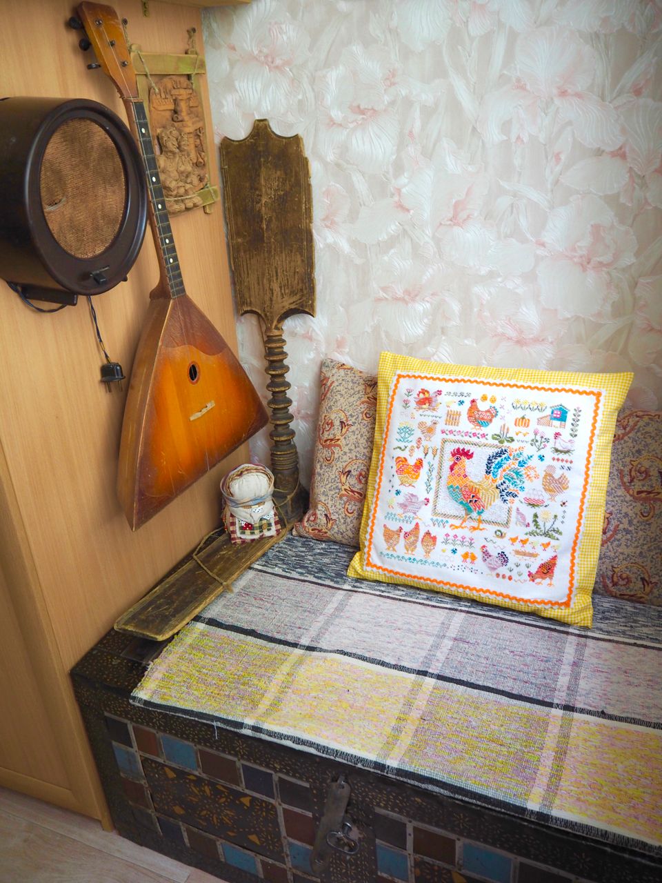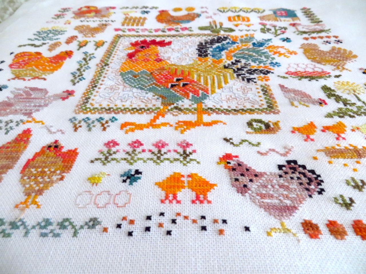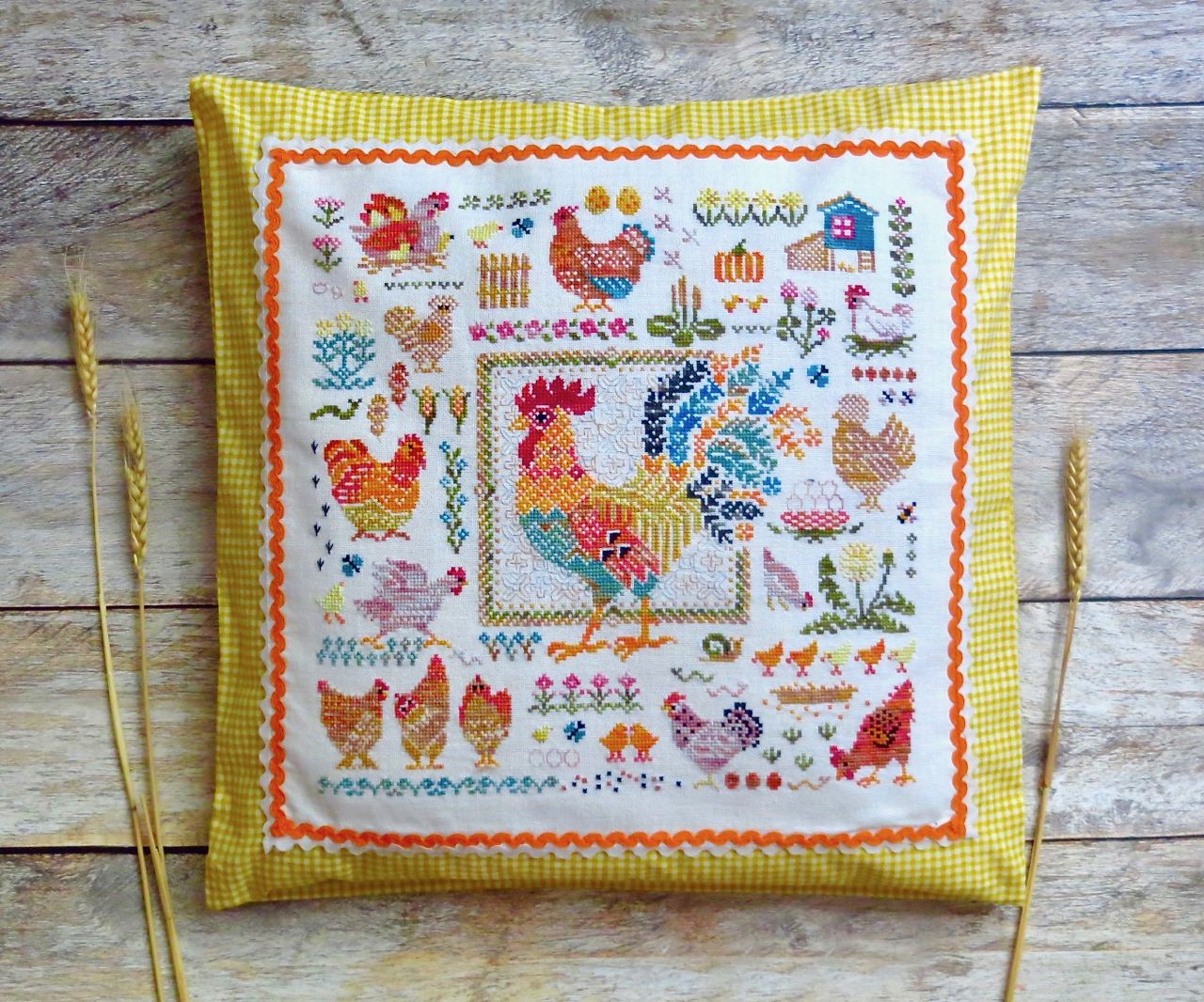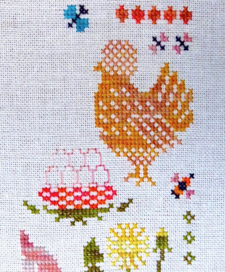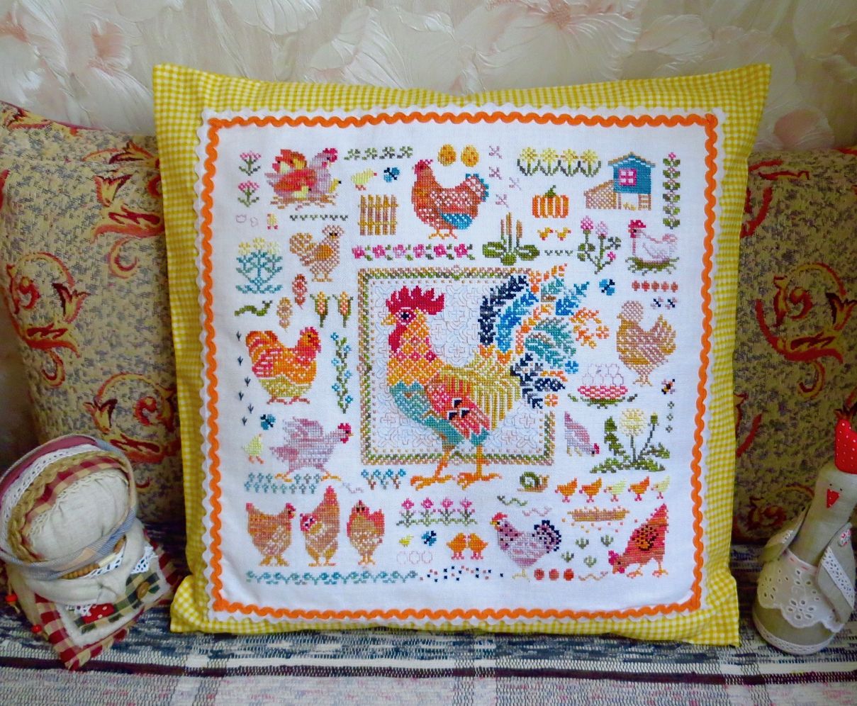 14 мая 2023 19 часов назад, феня777 сказал(а): С интересом наблюдаю за продвижением куриного подворья твоего и Еленочки, Светуля, спасибо, что нашла возможность написать Хорошего тебе отдыха! А между тем, я дошила сэмплер! Несмотря на то, что отчетный день в нашем совместнике -- по понедельникам, решила подвести итоги сегодня, в выходной, когда времени больше. Эмоции переполняют! Вышито 14 разномастных курочек и петушков, 19 действующих и 20 будущих (яйца то есть) цыплят, а также бабочки, пчёлки, червячки и разнообразная растительность. Каждая животинка — со своим характером и особенностями. Очень понравились травинки, одуванчики, подорожник. Заодно почитала о разных породах кур. Мне кажется, что вот эта — одна из пород хохлатых курочек. Точно породу затруднилась определить. Посмотрите, какие красавицы среди них водятся: русская хохлатая китайские шелковые гудан голландская белохохлая павловская польская хохлатая. Процесс доставил громадное удовольствие! Сюжет сам по себе очень добрый и уютный, а вышивать нитками ручного окрашивания — неописуемое удовольствие! Сейчас смотрю даже на обычные схемы с прицелом, можно ли в них использовать подобные нитки. Только посмотрите, какие интересные названия у ниточек для этой схемы Повторюсь, что вышивала не оригинальными нитками, а купленными в группе в ВК, специально окрашенными для этого дизайна. С одной стороны, нитки неплохие, цвета в основном соответствуют оригинальным ниткам из набора. С другой стороны, есть нюансы: нитки желтого цвета настолько бледные, что просто сливались с основой, в результате чего ими почти не вышивала. Подобрала другие из выигранных в той же группе косичек из ниток ручного окрашивания. Также пару раз заменяла один из красных цветов. Местами он был скучноват и невыразителен. Заменила также ниточку, предназначавшуюся для вышивки фона (показалась толстоватой) хотя она по толщине полностью соответствовала оригинальному Perle № 8. Плюсом считаю то, что черные нитки оказались тоже секционного окрашивания в отличие от оригинального набора, где черный — это просто чёрный. Ну и экономия средств, конечно же, имеет для меня немаловажное значение. В запасе есть еще наборы и схемы «Совиного леса». Подумаю над тем, покупать ли все же оригинальные нитки, так как ПНК в той группе в ВК девушка больше не красит. С недавних пор на комбинате «ПНК им. Кирова» используют другой хлопок, что отрицательно сказалось на качестве мулине. А мулине Luca-S, которое окрашивает сейчас хозяйка группы, получается дороже. Оформила сэмплер, как и планировала, в наволочку для подушки. Ткань покупала заранее. Шила вчера (не без косяков, конечно), фотографировала сегодня. С удивлением обнаружила, что это первая моя наволочка с вышивкой. Вот они, мои любимые курочки. Хвост у центрального петуха такой роскошный, что затмил всех вышитых до этого момента петушков и куриц Фотографии для процесса Фотографии не для процесса Примеряла подушку на диван , но не очень понравилось. Есть у меня дома любимое местечко, своеобразный ретро-уголок -- старый мамин сундук, покрытый половичками, сотканными моей двоюродной бабушкой. Тут же -- балалайка от одной бабушки и старинные прялка и радио -- от другой. Местечко крошечное, но очень уютное. Вот для этого уголка и предназначена была подушка с курочками Всем добра, мира и уютных курочек!