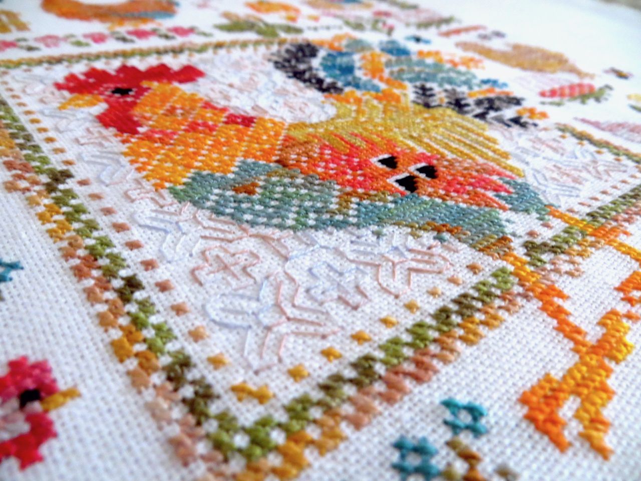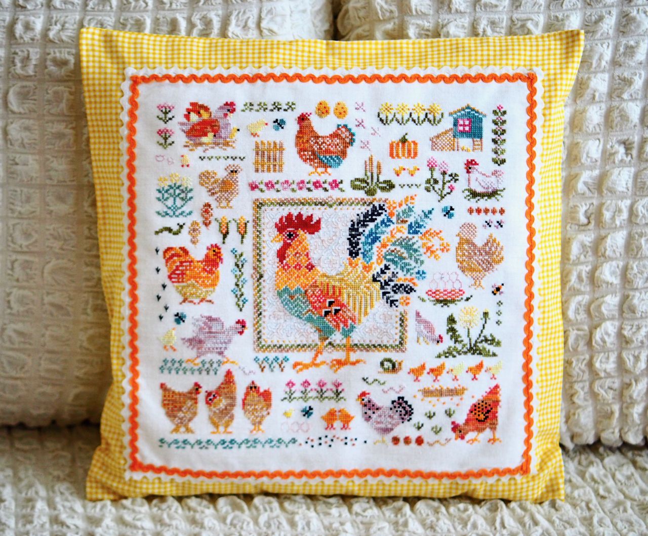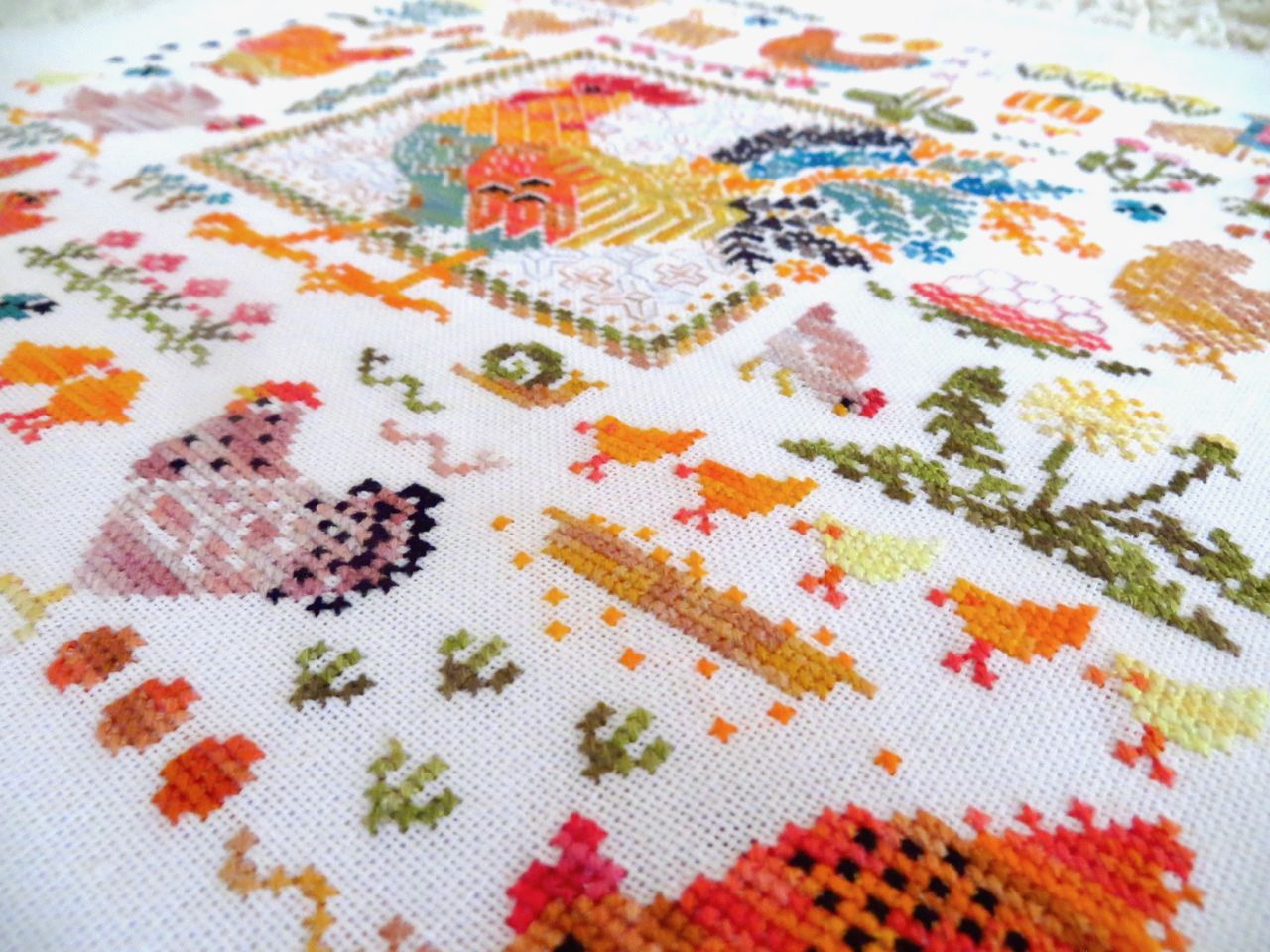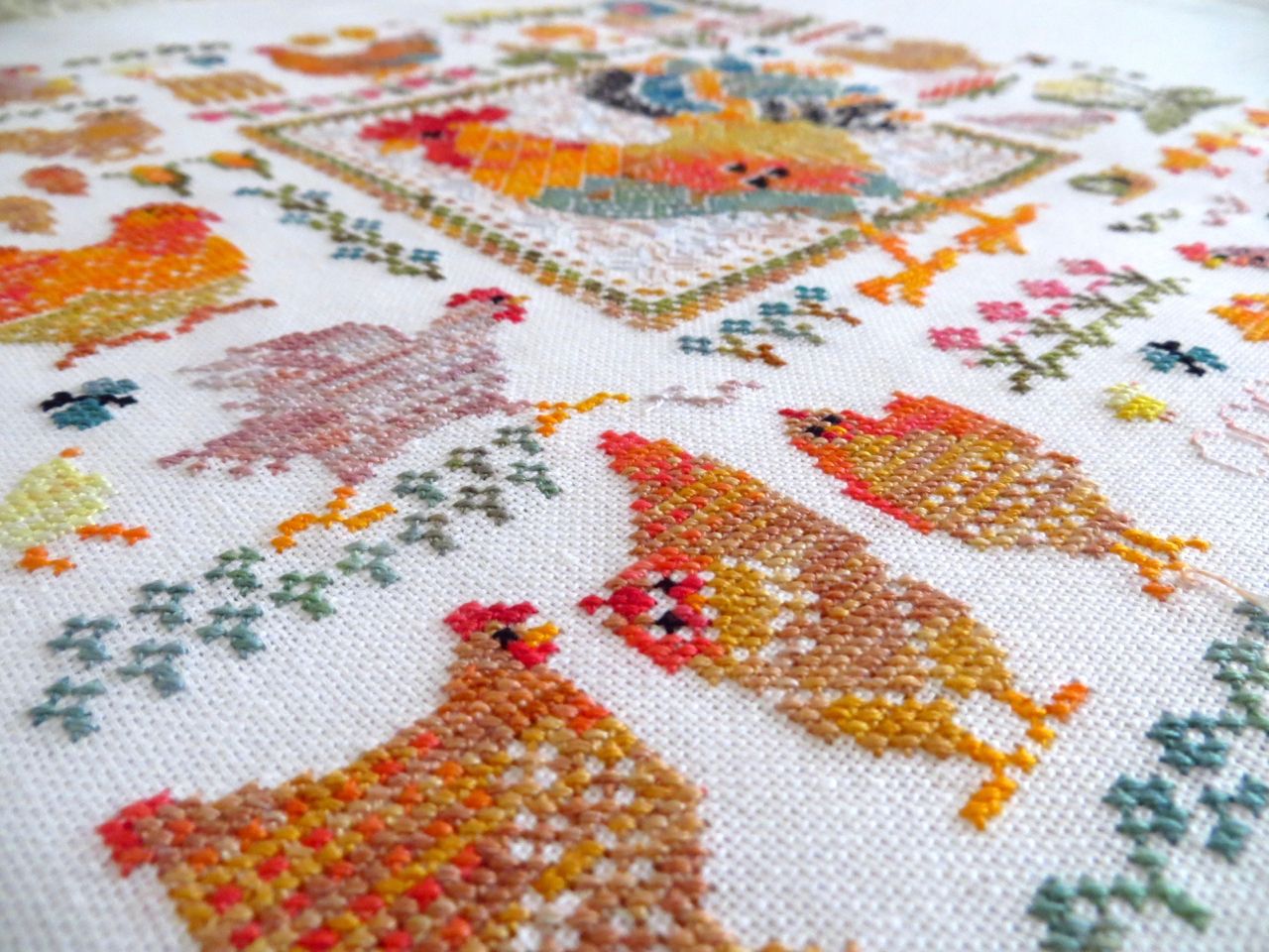 14 мая 2023 19 часов назад, феня777 сказал(а): С интересом наблюдаю за продвижением куриного подворья твоего и Еленочки, Светуля, спасибо, что нашла возможность написать Хорошего тебе отдыха! А между тем, я дошила сэмплер! Несмотря на то, что отчетный день в нашем совместнике -- по понедельникам, решила подвести итоги сегодня, в выходной, когда времени больше. Эмоции переполняют! Вышито 14 разномастных курочек и петушков, 19 действующих и 20 будущих (яйца то есть) цыплят, а также бабочки, пчёлки, червячки и разнообразная растительность. Каждая животинка — со своим характером и особенностями. Очень понравились травинки, одуванчики, подорожник. Заодно почитала о разных породах кур. Мне кажется, что вот эта — одна из пород хохлатых курочек. Точно породу затруднилась определить. Посмотрите, какие красавицы среди них водятся: русская хохлатая китайские шелковые гудан голландская белохохлая павловская польская хохлатая. Процесс доставил громадное удовольствие! Сюжет сам по себе очень добрый и уютный, а вышивать нитками ручного окрашивания — неописуемое удовольствие! Сейчас смотрю даже на обычные схемы с прицелом, можно ли в них использовать подобные нитки. Только посмотрите, какие интересные названия у ниточек для этой схемы Повторюсь, что вышивала не оригинальными нитками, а купленными в группе в ВК, специально окрашенными для этого дизайна. С одной стороны, нитки неплохие, цвета в основном соответствуют оригинальным ниткам из набора. С другой стороны, есть нюансы: нитки желтого цвета настолько бледные, что просто сливались с основой, в результате чего ими почти не вышивала. Подобрала другие из выигранных в той же группе косичек из ниток ручного окрашивания. Также пару раз заменяла один из красных цветов. Местами он был скучноват и невыразителен. Заменила также ниточку, предназначавшуюся для вышивки фона (показалась толстоватой) хотя она по толщине полностью соответствовала оригинальному Perle № 8. Плюсом считаю то, что черные нитки оказались тоже секционного окрашивания в отличие от оригинального набора, где черный — это просто чёрный. Ну и экономия средств, конечно же, имеет для меня немаловажное значение. В запасе есть еще наборы и схемы «Совиного леса». Подумаю над тем, покупать ли все же оригинальные нитки, так как ПНК в той группе в ВК девушка больше не красит. С недавних пор на комбинате «ПНК им. Кирова» используют другой хлопок, что отрицательно сказалось на качестве мулине. А мулине Luca-S, которое окрашивает сейчас хозяйка группы, получается дороже. Оформила сэмплер, как и планировала, в наволочку для подушки. Ткань покупала заранее. Шила вчера (не без косяков, конечно), фотографировала сегодня. С удивлением обнаружила, что это первая моя наволочка с вышивкой. Вот они, мои любимые курочки. Хвост у центрального петуха такой роскошный, что затмил всех вышитых до этого момента петушков и куриц Фотографии для процесса Фотографии не для процесса Примеряла подушку на диван , но не очень понравилось. Есть у меня дома любимое местечко, своеобразный ретро-уголок -- старый мамин сундук, покрытый половичками, сотканными моей двоюродной бабушкой. Тут же -- балалайка от одной бабушки и старинные прялка и радио -- от другой. Местечко крошечное, но очень уютное. Вот для этого уголка и предназначена была подушка с курочками Всем добра, мира и уютных курочек!