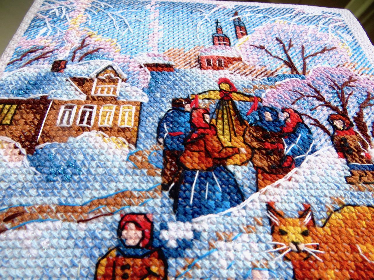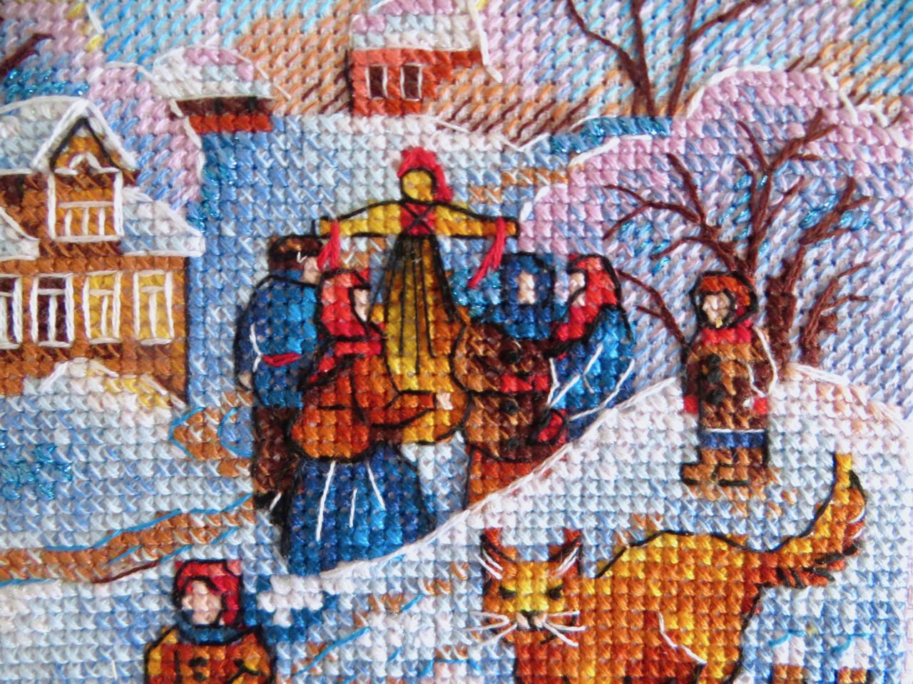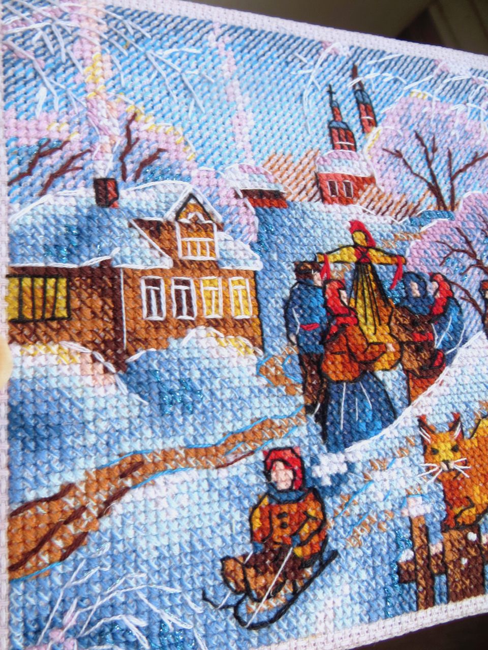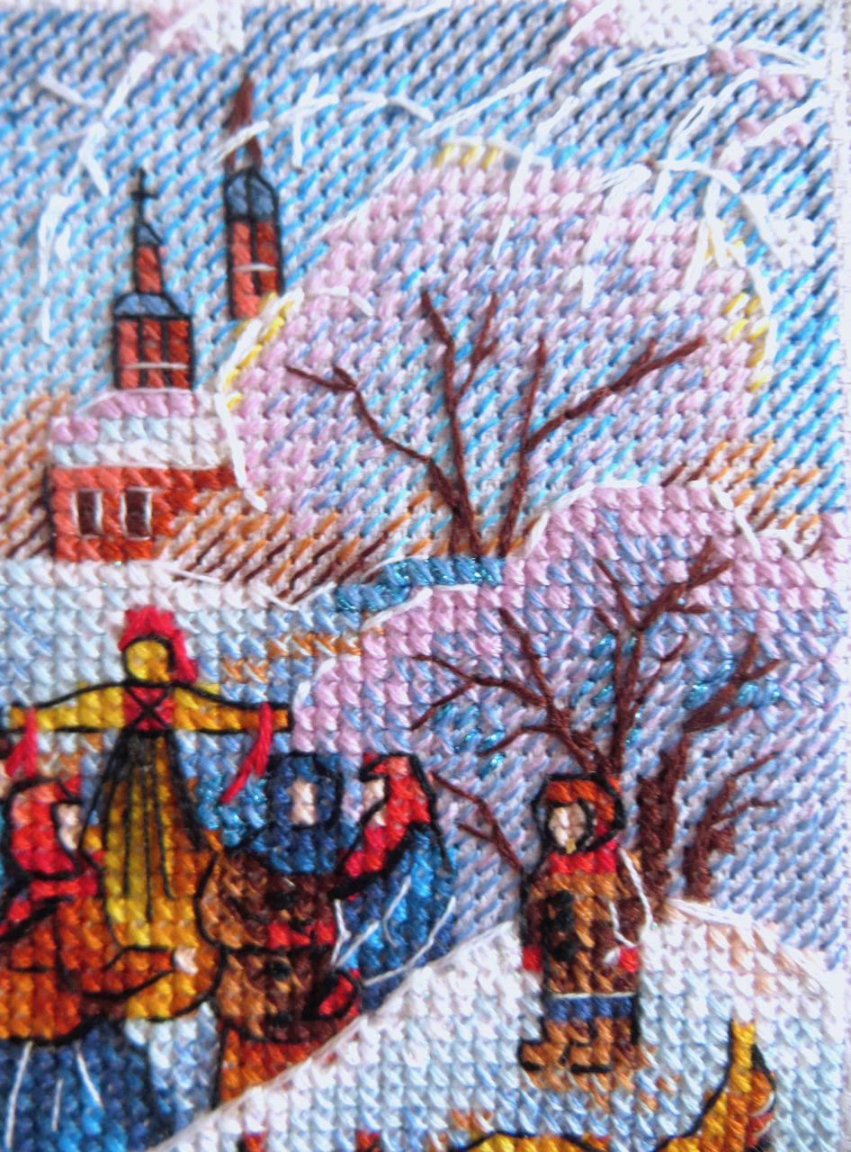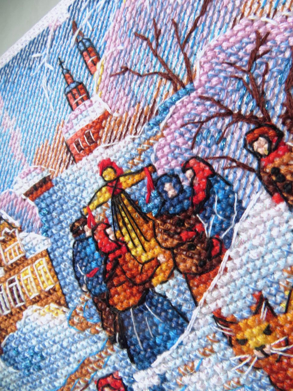 5 апреля 2024 31.03.2024 в 21:02, Raduga777 сказал(а): Бэкала я, бэкала и наконец добэкала! Мечтала к Масленице закончить небольшую, вышивку, но не тут-то было! За неделю до праздника выудила из закромов наборчик «Масленица у ворот!» (производитель — «Двое из ларца»). Думала, что успею хотя бы к концу блинной недели, но куда там! Сам набор оформлен довольно добротно: плотная картонная упаковка, красивое фото (правда, не отшива, а скрина). Схема отпечатана на плотной бумаге, но то, что с обратной стороны ключ напечатан бэк, просто убивает. Мне приспичило начать в выходные, и бежать куда-то делать копию схемы не хотелось. Ключ мне удобнее отрезать, так как схему я для удобства сгибаю. И вот пришлось откромсать ключ, с обратной стороны которого была схема с бэком, а потом, когда настала очередь бэка, приклеивать всё это богатство обратно скотчем. Ставлю жирный минус за это. Канва — Gamma 14 каунта светло-сиреневого цвета, в меру жесткая, вышивать удобно, колом не стоит, дырочки крахмалом не забиты, как у некоторых. Однако канва оказалась не совсем равномерной: вышивка должна была быть размером 11,5х11,5 см, но получился недоквадрат, две стороны которого были больше двух других сторон на 7 мм Мулине — ПНК им. Кирова 21 цвета. Два цвета были плохого качества: рвались, казалось, от одного взгляда на них. На некоторых нитках были катышки. Сами ниточки тусклые, жиденькие. Кроме чистых цветов — 10 блендов. Также использовались 2 цвета металлизированной нити (вроде бы Kreinik), которые в процессе потрясающе блестели и переливались. Синий металлик в результате на картинке жвивую заметен, а вот перламутрового совсем не видно. Надо ли говорить, что на фотографиях блеск не виден совсем! Обидно, ведь было так красиво! Рамочку купила на маркетплейсе за 200 руб. Покрасила её в белый цвет и затонировала синим. Стекло не стала вставлять, так как картинка предназначена для сменной экспозиции. По периметру пришлось дошивать 2-3 ряда (напомню, что квадрат оказался вовсе не квадратом). Вроде справилась. Мне очень нравится сюжет, живой и динамичный! Это настоящая сценка из жизни русской деревеньки, празднующей Масленицу. На небольшом кусочке канвы разместились и дома, и церквушка, и чучело Масленицы, а также три беседующие кумушки, один мужичок, два катающихся с горки ребятенка и крупным планом кот! Судя по дыму столбом, на улице ещё морозец. Как всё это удалось разместить — загадка! Деревца, вышитые полукрестом интересными блендами, выглядят кружевными. Крестиком вышивала 5 вечеров, а бэкала шесть! И ни конца и ни края ему, разноцветному бэку, не было видно! Я думала, что умом тронусь, пока его при закончу. Наконец он был побеждён, и я смогла полюбоваться результатом (если что, это я не себе, любимой, пою оды, а дизайнеру). Мне безумно нравится то, что получилось! Я и так неровно дышу к деревенским сюжетам, а тут всё — в самое сердечко: и шумный праздник, и весёлая, уютная деревенька, и горка с рыжим котиком! У котика, кстати, чуть подправила хвостик и ушки, иначе он мне напоминал белочку. И усики вышила белыми нитками (схемой для половины усов предполагался чёрный цвет — см. превью). Очень душевный, родной сюжет! Как ни старалась сфоткать вышивку под разными углами, чтобы словить блеск металлика, но это не удалось Фотографии для процесса: «Двое из ларца», «Масленица у ворот!» А-031 , счетный крест. Превью: Кстати, о н