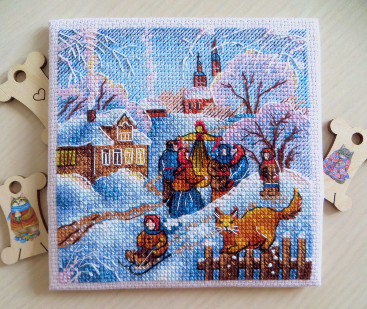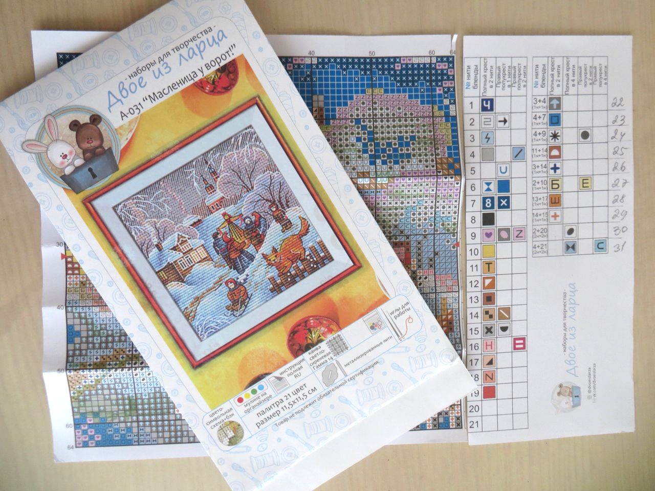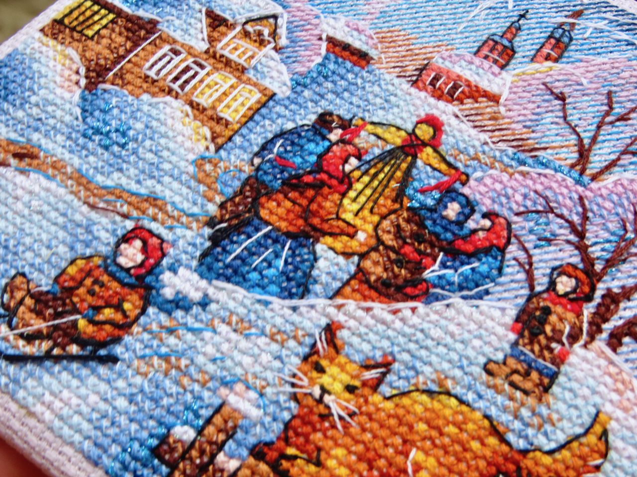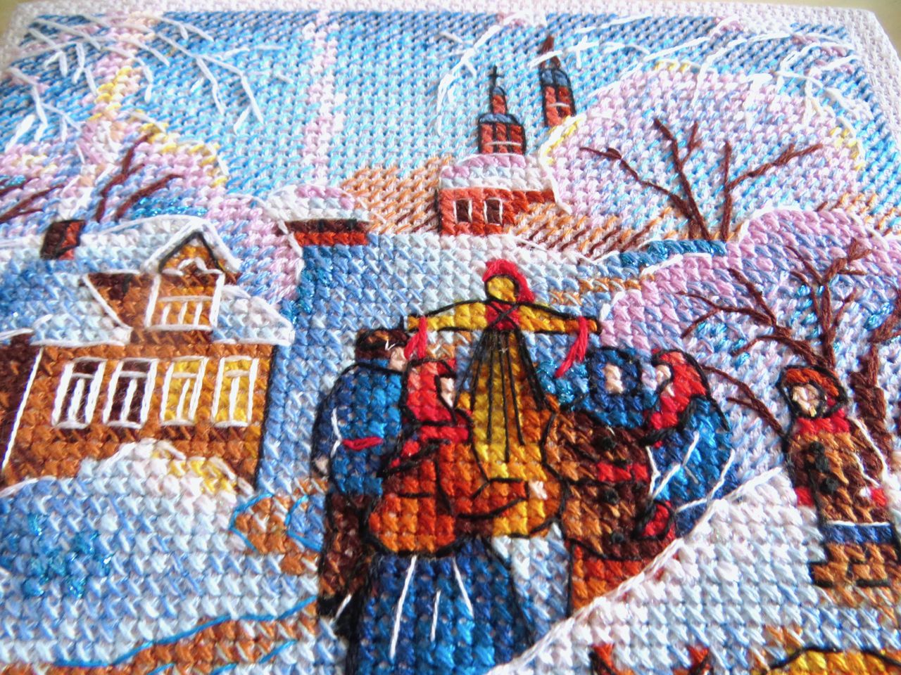 5 апреля 2024 31.03.2024 в 21:02, Raduga777 сказал(а): Бэкала я, бэкала и наконец добэкала! Мечтала к Масленице закончить небольшую, вышивку, но не тут-то было! За неделю до праздника выудила из закромов наборчик «Масленица у ворот!» (производитель — «Двое из ларца»). Думала, что успею хотя бы к концу блинной недели, но куда там! Сам набор оформлен довольно добротно: плотная картонная упаковка, красивое фото (правда, не отшива, а скрина). Схема отпечатана на плотной бумаге, но то, что с обратной стороны ключ напечатан бэк, просто убивает. Мне приспичило начать в выходные, и бежать куда-то делать копию схемы не хотелось. Ключ мне удобнее отрезать, так как схему я для удобства сгибаю. И вот пришлось откромсать ключ, с обратной стороны которого была схема с бэком, а потом, когда настала очередь бэка, приклеивать всё это богатство обратно скотчем. Ставлю жирный минус за это. Канва — Gamma 14 каунта светло-сиреневого цвета, в меру жесткая, вышивать удобно, колом не стоит, дырочки крахмалом не забиты, как у некоторых. Однако канва оказалась не совсем равномерной: вышивка должна была быть размером 11,5х11,5 см, но получился недоквадрат, две стороны которого были больше двух других сторон на 7 мм Мулине — ПНК им. Кирова 21 цвета. Два цвета были плохого качества: рвались, казалось, от одного взгляда на них. На некоторых нитках были катышки. Сами ниточки тусклые, жиденькие. Кроме чистых цветов — 10 блендов. Также использовались 2 цвета металлизированной нити (вроде бы Kreinik), которые в процессе потрясающе блестели и переливались. Синий металлик в результате на картинке жвивую заметен, а вот перламутрового совсем не видно. Надо ли говорить, что на фотографиях блеск не виден совсем! Обидно, ведь было так красиво! Рамочку купила на маркетплейсе за 200 руб. Покрасила её в белый цвет и затонировала синим. Стекло не стала вставлять, так как картинка предназначена для сменной экспозиции. По периметру пришлось дошивать 2-3 ряда (напомню, что квадрат оказался вовсе не квадратом). Вроде справилась. Мне очень нравится сюжет, живой и динамичный! Это настоящая сценка из жизни русской деревеньки, празднующей Масленицу. На небольшом кусочке канвы разместились и дома, и церквушка, и чучело Масленицы, а также три беседующие кумушки, один мужичок, два катающихся с горки ребятенка и крупным планом кот! Судя по дыму столбом, на улице ещё морозец. Как всё это удалось разместить — загадка! Деревца, вышитые полукрестом интересными блендами, выглядят кружевными. Крестиком вышивала 5 вечеров, а бэкала шесть! И ни конца и ни края ему, разноцветному бэку, не было видно! Я думала, что умом тронусь, пока его при закончу. Наконец он был побеждён, и я смогла полюбоваться результатом (если что, это я не себе, любимой, пою оды, а дизайнеру). Мне безумно нравится то, что получилось! Я и так неровно дышу к деревенским сюжетам, а тут всё — в самое сердечко: и шумный праздник, и весёлая, уютная деревенька, и горка с рыжим котиком! У котика, кстати, чуть подправила хвостик и ушки, иначе он мне напоминал белочку. И усики вышила белыми нитками (схемой для половины усов предполагался чёрный цвет — см. превью). Очень душевный, родной сюжет! Как ни старалась сфоткать вышивку под разными углами, чтобы словить блеск металлика, но это не удалось Фотографии для процесса: «Двое из ларца», «Масленица у ворот!» А-031 , счетный крест. Превью: Кстати, о н