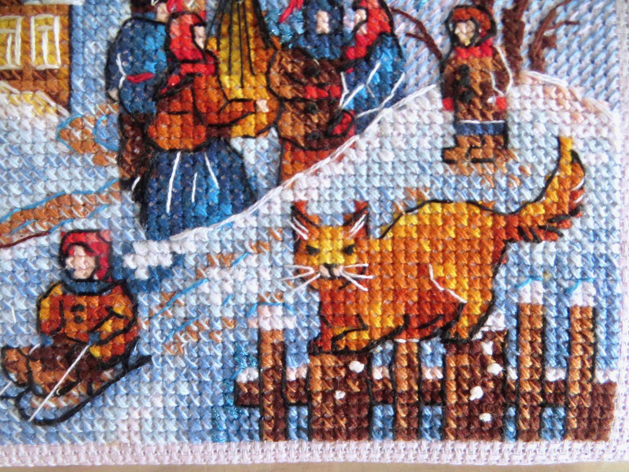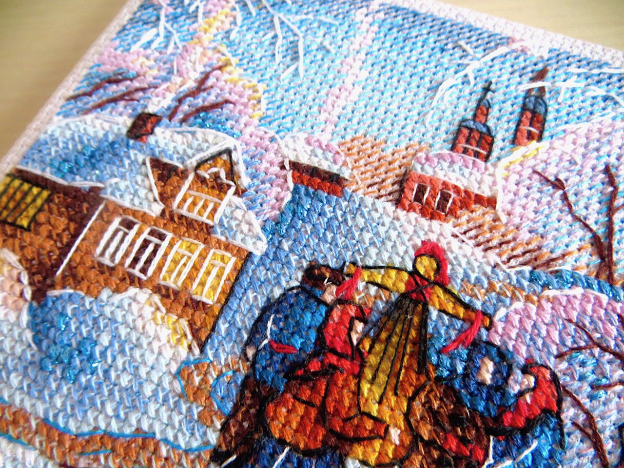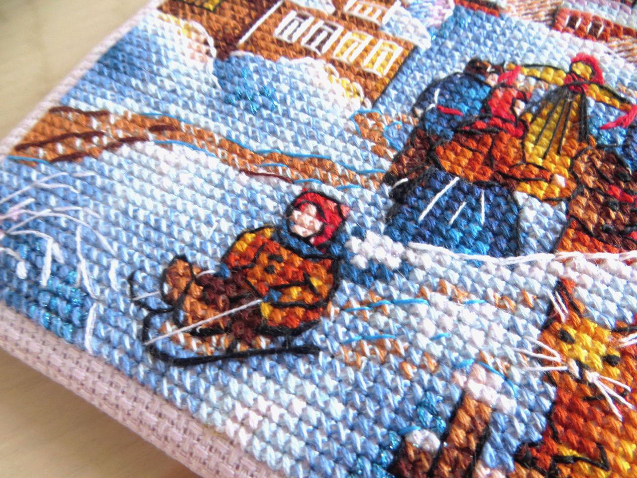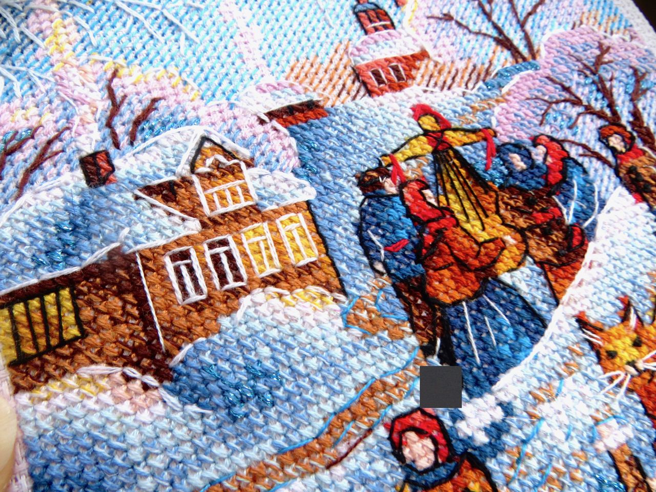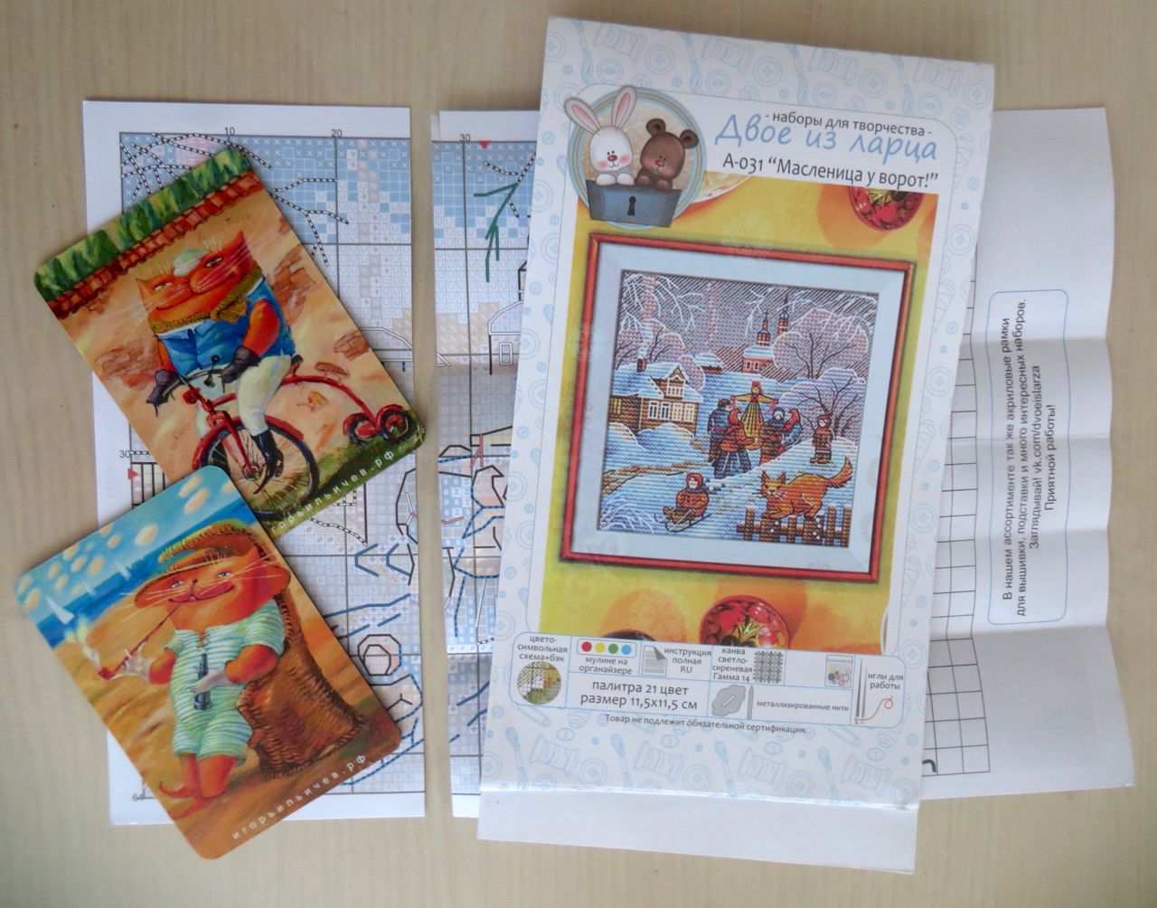5 апреля 2024 31.03.2024 в 21:02, Raduga777 сказал(а): Бэкала я, бэкала и наконец добэкала! Мечтала к Масленице закончить небольшую, вышивку, но не тут-то было! За неделю до праздника выудила из закромов наборчик «Масленица у ворот!» (производитель — «Двое из ларца»). Думала, что успею хотя бы к концу блинной недели, но куда там! Сам набор оформлен довольно добротно: плотная картонная упаковка, красивое фото (правда, не отшива, а скрина). Схема отпечатана на плотной бумаге, но то, что с обратной стороны ключ напечатан бэк, просто убивает. Мне приспичило начать в выходные, и бежать куда-то делать копию схемы не хотелось. Ключ мне удобнее отрезать, так как схему я для удобства сгибаю. И вот пришлось откромсать ключ, с обратной стороны которого была схема с бэком, а потом, когда настала очередь бэка, приклеивать всё это богатство обратно скотчем. Ставлю жирный минус за это. Канва — Gamma 14 каунта светло-сиреневого цвета, в меру жесткая, вышивать удобно, колом не стоит, дырочки крахмалом не забиты, как у некоторых. Однако канва оказалась не совсем равномерной: вышивка должна была быть размером 11,5х11,5 см, но получился недоквадрат, две стороны которого были больше двух других сторон на 7 мм Мулине — ПНК им. Кирова 21 цвета. Два цвета были плохого качества: рвались, казалось, от одного взгляда на них. На некоторых нитках были катышки. Сами ниточки тусклые, жиденькие. Кроме чистых цветов — 10 блендов. Также использовались 2 цвета металлизированной нити (вроде бы Kreinik), которые в процессе потрясающе блестели и переливались. Синий металлик в результате на картинке жвивую заметен, а вот перламутрового совсем не видно. Надо ли говорить, что на фотографиях блеск не виден совсем! Обидно, ведь было так красиво! Рамочку купила на маркетплейсе за 200 руб. Покрасила её в белый цвет и затонировала синим. Стекло не стала вставлять, так как картинка предназначена для сменной экспозиции. По периметру пришлось дошивать 2-3 ряда (напомню, что квадрат оказался вовсе не квадратом). Вроде справилась. Мне очень нравится сюжет, живой и динамичный! Это настоящая сценка из жизни русской деревеньки, празднующей Масленицу. На небольшом кусочке канвы разместились и дома, и церквушка, и чучело Масленицы, а также три беседующие кумушки, один мужичок, два катающихся с горки ребятенка и крупным планом кот! Судя по дыму столбом, на улице ещё морозец. Как всё это удалось разместить — загадка! Деревца, вышитые полукрестом интересными блендами, выглядят кружевными. Крестиком вышивала 5 вечеров, а бэкала шесть! И ни конца и ни края ему, разноцветному бэку, не было видно! Я думала, что умом тронусь, пока его при закончу. Наконец он был побеждён, и я смогла полюбоваться результатом (если что, это я не себе, любимой, пою оды, а дизайнеру). Мне безумно нравится то, что получилось! Я и так неровно дышу к деревенским сюжетам, а тут всё — в самое сердечко: и шумный праздник, и весёлая, уютная деревенька, и горка с рыжим котиком! У котика, кстати, чуть подправила хвостик и ушки, иначе он мне напоминал белочку. И усики вышила белыми нитками (схемой для половины усов предполагался чёрный цвет — см. превью). Очень душевный, родной сюжет! Как ни старалась сфоткать вышивку под разными углами, чтобы словить блеск металлика, но это не удалось Фотографии для процесса: «Двое из ларца», «Масленица у ворот!» А-031 , счетный крест. Превью: Кстати, о н