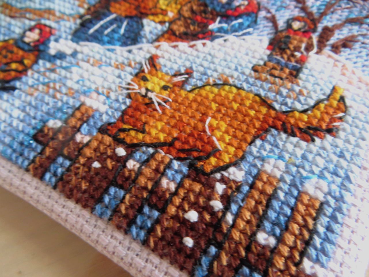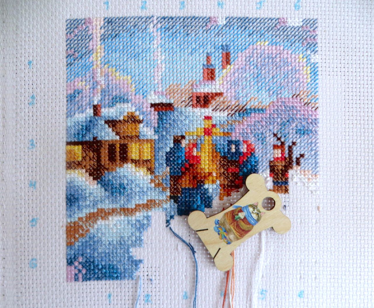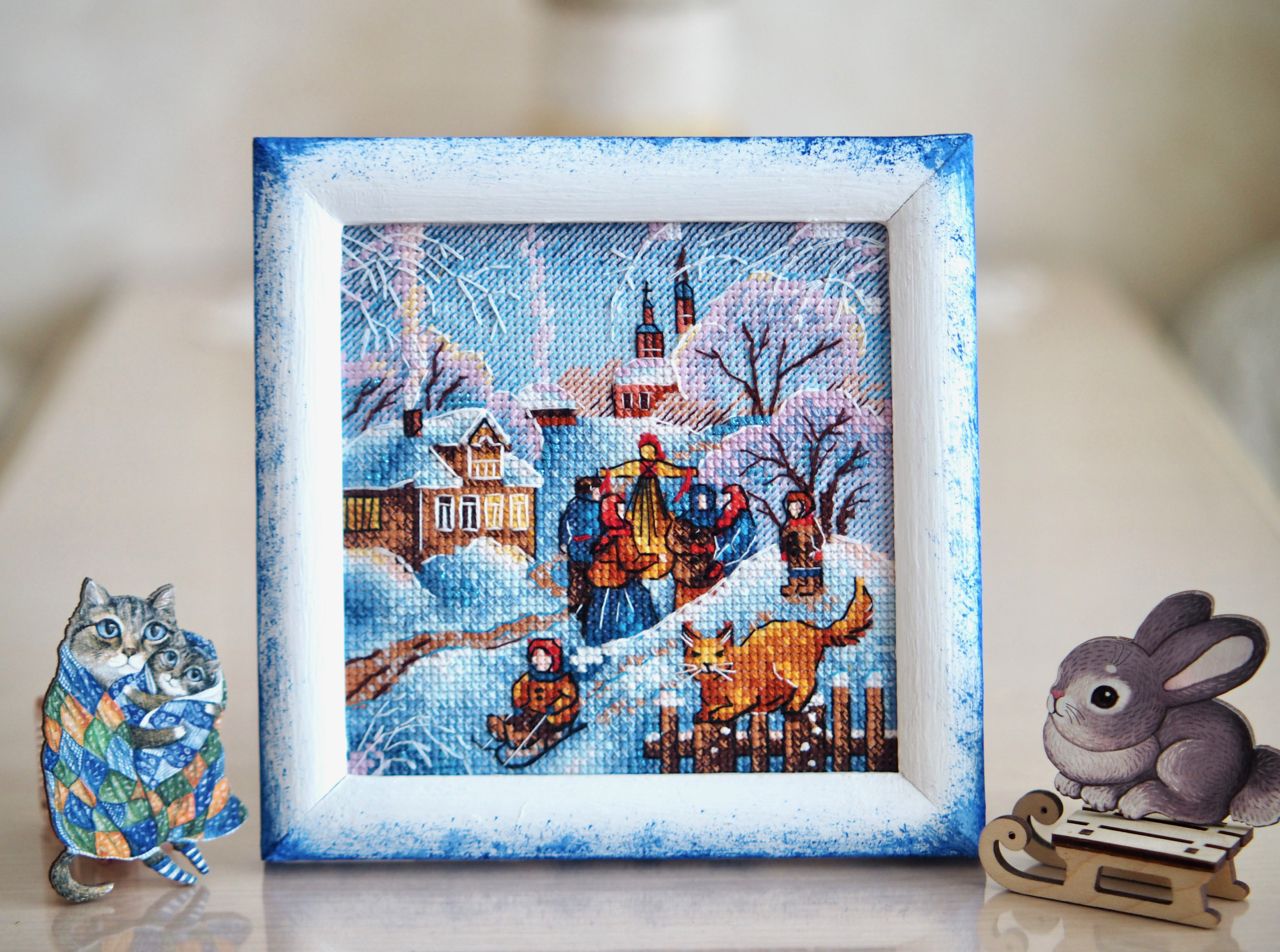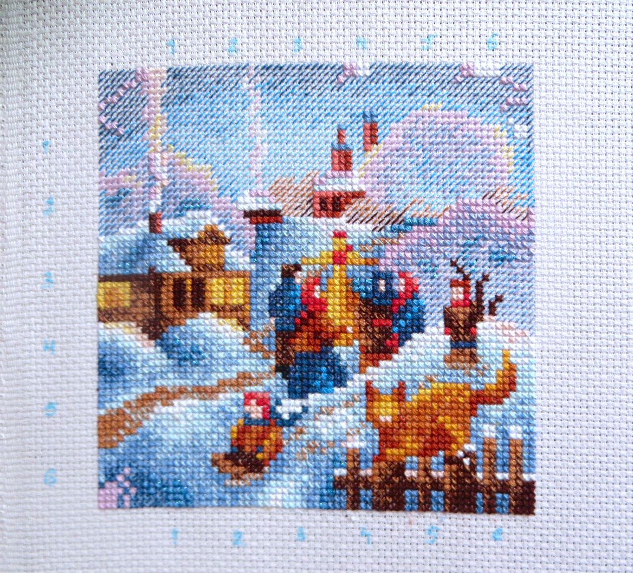 5 апреля 2024 31.03.2024 в 21:02, Raduga777 сказал(а): Бэкала я, бэкала и наконец добэкала! Мечтала к Масленице закончить небольшую, вышивку, но не тут-то было! За неделю до праздника выудила из закромов наборчик «Масленица у ворот!» (производитель — «Двое из ларца»). Думала, что успею хотя бы к концу блинной недели, но куда там! Сам набор оформлен довольно добротно: плотная картонная упаковка, красивое фото (правда, не отшива, а скрина). Схема отпечатана на плотной бумаге, но то, что с обратной стороны ключ напечатан бэк, просто убивает. Мне приспичило начать в выходные, и бежать куда-то делать копию схемы не хотелось. Ключ мне удобнее отрезать, так как схему я для удобства сгибаю. И вот пришлось откромсать ключ, с обратной стороны которого была схема с бэком, а потом, когда настала очередь бэка, приклеивать всё это богатство обратно скотчем. Ставлю жирный минус за это. Канва — Gamma 14 каунта светло-сиреневого цвета, в меру жесткая, вышивать удобно, колом не стоит, дырочки крахмалом не забиты, как у некоторых. Однако канва оказалась не совсем равномерной: вышивка должна была быть размером 11,5х11,5 см, но получился недоквадрат, две стороны которого были больше двух других сторон на 7 мм Мулине — ПНК им. Кирова 21 цвета. Два цвета были плохого качества: рвались, казалось, от одного взгляда на них. На некоторых нитках были катышки. Сами ниточки тусклые, жиденькие. Кроме чистых цветов — 10 блендов. Также использовались 2 цвета металлизированной нити (вроде бы Kreinik), которые в процессе потрясающе блестели и переливались. Синий металлик в результате на картинке жвивую заметен, а вот перламутрового совсем не видно. Надо ли говорить, что на фотографиях блеск не виден совсем! Обидно, ведь было так красиво! Рамочку купила на маркетплейсе за 200 руб. Покрасила её в белый цвет и затонировала синим. Стекло не стала вставлять, так как картинка предназначена для сменной экспозиции. По периметру пришлось дошивать 2-3 ряда (напомню, что квадрат оказался вовсе не квадратом). Вроде справилась. Мне очень нравится сюжет, живой и динамичный! Это настоящая сценка из жизни русской деревеньки, празднующей Масленицу. На небольшом кусочке канвы разместились и дома, и церквушка, и чучело Масленицы, а также три беседующие кумушки, один мужичок, два катающихся с горки ребятенка и крупным планом кот! Судя по дыму столбом, на улице ещё морозец. Как всё это удалось разместить — загадка! Деревца, вышитые полукрестом интересными блендами, выглядят кружевными. Крестиком вышивала 5 вечеров, а бэкала шесть! И ни конца и ни края ему, разноцветному бэку, не было видно! Я думала, что умом тронусь, пока его при закончу. Наконец он был побеждён, и я смогла полюбоваться результатом (если что, это я не себе, любимой, пою оды, а дизайнеру). Мне безумно нравится то, что получилось! Я и так неровно дышу к деревенским сюжетам, а тут всё — в самое сердечко: и шумный праздник, и весёлая, уютная деревенька, и горка с рыжим котиком! У котика, кстати, чуть подправила хвостик и ушки, иначе он мне напоминал белочку. И усики вышила белыми нитками (схемой для половины усов предполагался чёрный цвет — см. превью). Очень душевный, родной сюжет! Как ни старалась сфоткать вышивку под разными углами, чтобы словить блеск металлика, но это не удалось Фотографии для процесса: «Двое из ларца», «Масленица у ворот!» А-031 , счетный крест. Превью: Кстати, о н