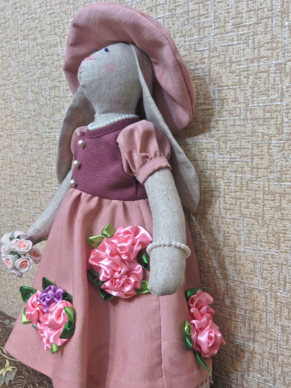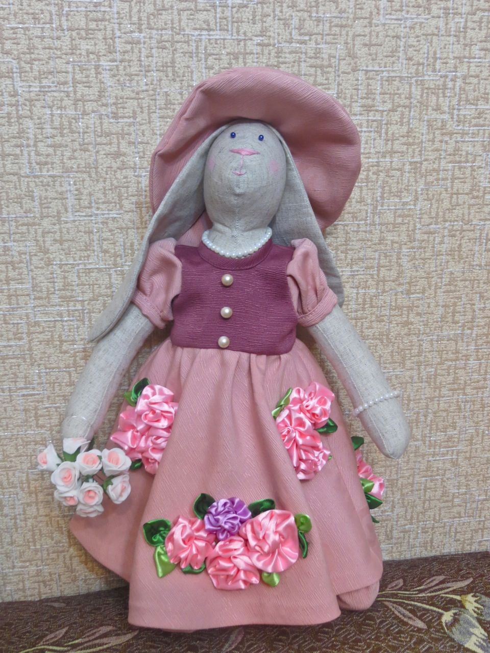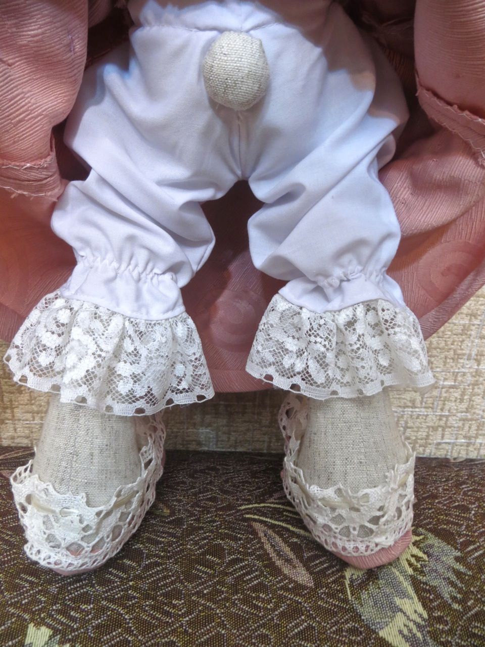 8 мая 2017 Продолжаются праздничные дни. Свободного времени побольше, и я наконец-то собралась познакомить вас с дружным семейством Зайцевых, обитающим у меня в квартире (кстати, можете поздравить их с переездом. Не так давно они перекочевали из темного уголка в коридоре в светлую комнату). И начну его, как и полагается этикету, с дамы - хозяюшки этой семьи, Софи, тем более с нее-то все и началось. История создания ее такова: несколько лет назад на одной из "Формул рукоделия" увидела чудеснейших, обворожительных зайцев-тильд. Выглядели они великолепно: прелестные платьица, шапочки на длинных ушках ... Я, остолбенев, стояла там с разинутым ртом, в том числе и от ценника - одна зайчиха стоила 4000 рублей! А дело было еще до обвала рубля, когда 1 доллар стоил около 30 рублей. И вот стояла я и с жалостью к своему кошельку осознавала, что на такую трату я "пойтить не могу". Какое счастье, что на выставке можно купить для рукоделия практически все! Подошла к стенду, где продавался белорусский лен, и хапнула сразу приличный кусок (чтоб з запасом на все заячье стадо, значит ). Эти зайцы так овладели моим воображением, что всю обратную дорогу с выставки только о них, длинноухих, и думала! На следующий день глянула в интернете общую информацию о тильдах, начертила сама от руки выкройку и сшила заячью тушку. Стала думать, что делать с нарядом. В интернете платьишка, поразившего меня на выставочной зайчихе, не нашла, поэтому и шляпка, и платье, в котором Софи красуется сейчас, - полностью плод моей фантазии. С шитьем я на "Вы", а тут прямо в экстаз вошла и сама и выкройки смастерила, и платьишко со шляпкой расшила лентами, благо и ткань, и ленты в закромах имелись. На шейку зайке повесила бусики, на лапку - браслетик, а в другую лапку вложила букетик цветов, подаренный ей зайцем-мужем (он появится в следующей серии) На мордочку нанесла румяна. Она же девочка, должна уметь пользоваться косметикой! Вот такая моднявая зайка у меня получилась: Давайте заглянем ей под платьишко , чтобы посмотреть на ее кружевные панталончики и хвостик: Тапочки тоже сделала с кружевцем, чтобы получился гармоничный ансамбль Результатом в целом осталась довольна. Путешественница, Ярославовна, Чивава и 9 других сказали спасибо Поделиться сообщением Ссылка на сообщение