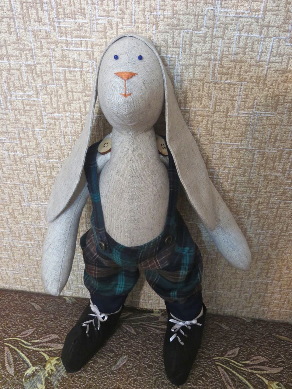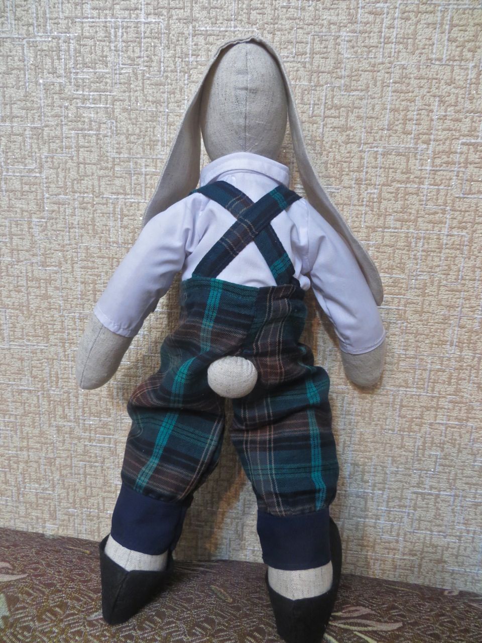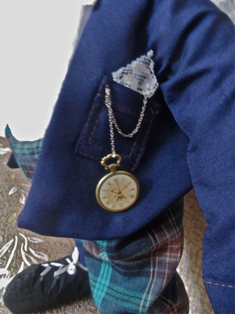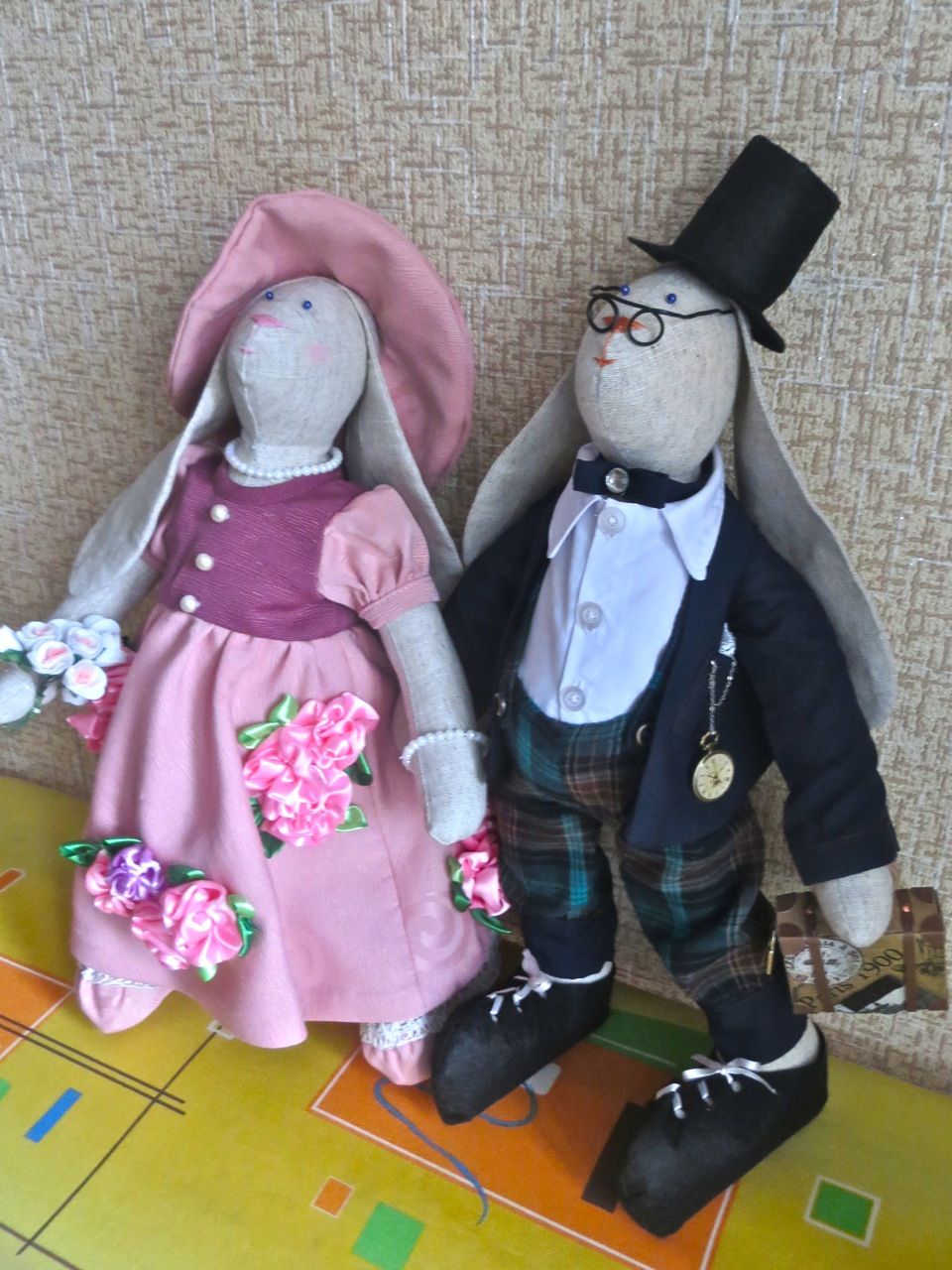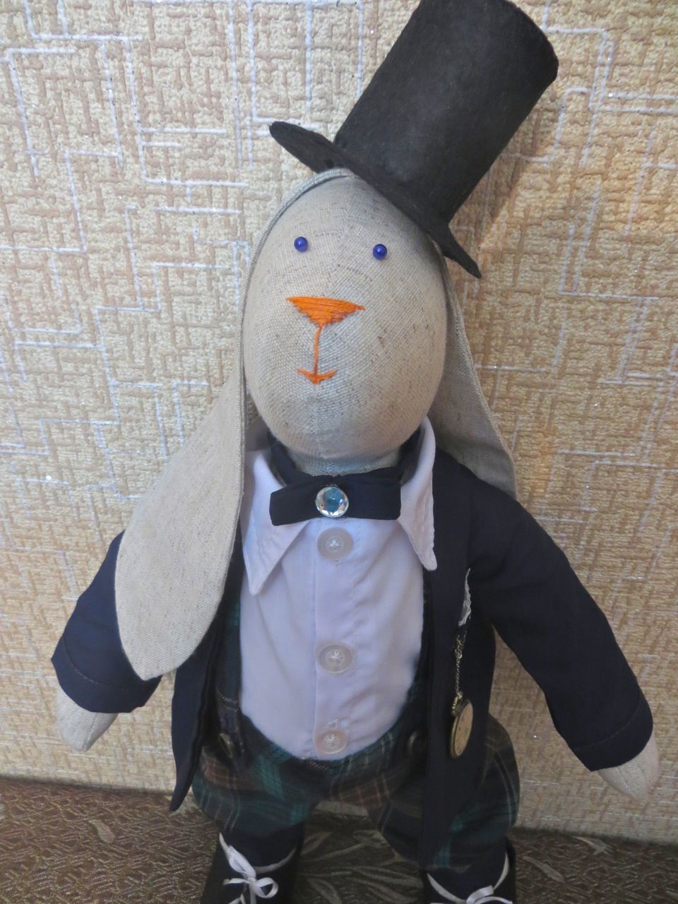 8 мая 2017 Сериал "Зайцевы". 2-я серия. Настал черед познакомить вас с главой семьи - Мишелем Зайцевым. Он, хотя и на неделю младше своей вышеобозначенной супруги, является основным кормильцем и поильцем семейства, будучи преуспевающим бизнесменом. Постоянно в думах и заботах... Жизнь его состоит из бизнес-встреч, командировок, разъездов. Несмотря на это, время на супругу и дочку (о ней речь пойдет позже) по выходным старается все же выкраивать. С Софи он безупречен: внимателен, нежен, заботлив, постоянно дарит цветы, выполняя ежепятничное завещание Леонида Якубовича из "Поля чудес" - "...и чтобы без цветов я больше вас не видел!" В общем, идеальный муж и отец, пример для подражания многим мужчинам! Создавался он тоже экспромтом. Просто видела, что Софи как-то тоскливо одной было, и через неделю у нее появился партнер (заяц). Для туловища использовала выкройку, по которой шила его супругу (прости меня, Софи!). У зайчиков движутся задние и передние лапки. Костюмчик Мишеля - также целиком и полностью моя идея. Сшит без каких-либо выкроек из подручных материалов, например, пиджак - из завалявшейся подкладочной ткани, а рубашка - из бывшей простыни Я просто снимала нужные мне мерки и чертила сразу на ткани. По фигуре одежку подгоняла прямо на зайце. Вначале были сшиты вот такие штанишки на подтяжках Все на пуговичках, легко снимается и стирается. Видела некоторых тильд, у которых одежка пришита прямо к тельцу. Это не про меня. Я помешана на чистоте, и мне нужно, чтобы и мои подопечные зайцы всегда были одеты во все чистое Туфли сшиты из фетра. Затем сшила рубашку с отложным воротничком, застегивающуюся на пуговички. Естественно, для хвостика в штанах предусмотрена спецдырка После этого сшила бархоточку с бриллиантиком на заячью шейку и пиджак с отстроченными манжетами и кармашком. Может, в природе таких пиджаков и не бывает, но у Зайцева он есть. Будем считать это "последним писком моды" В кармашек вложила кружевной платочек и старинные часы на цепочке, доставшиеся Мишелю еще от его дедушки От постоянного чтения деловой литературы у Зайцева чуток испортилось зрение, так что пришлось быстро соображать ему очки из черной пластиковой проволочки. Ее обычно используют для сбора в пучок разных проводов. Ну и какой же бизнесмен без чемодана? Пришлось мастерить и чемодан из верха бумажного пакета. Вот такой франт у меня получился И еще одно фото семейной пары, Софи и Мишеля, вместе Это они собрались на светский раут Каори, оленек, titania и 12 других сказали спасибо Поделиться сообщением Ссылка на сообщение