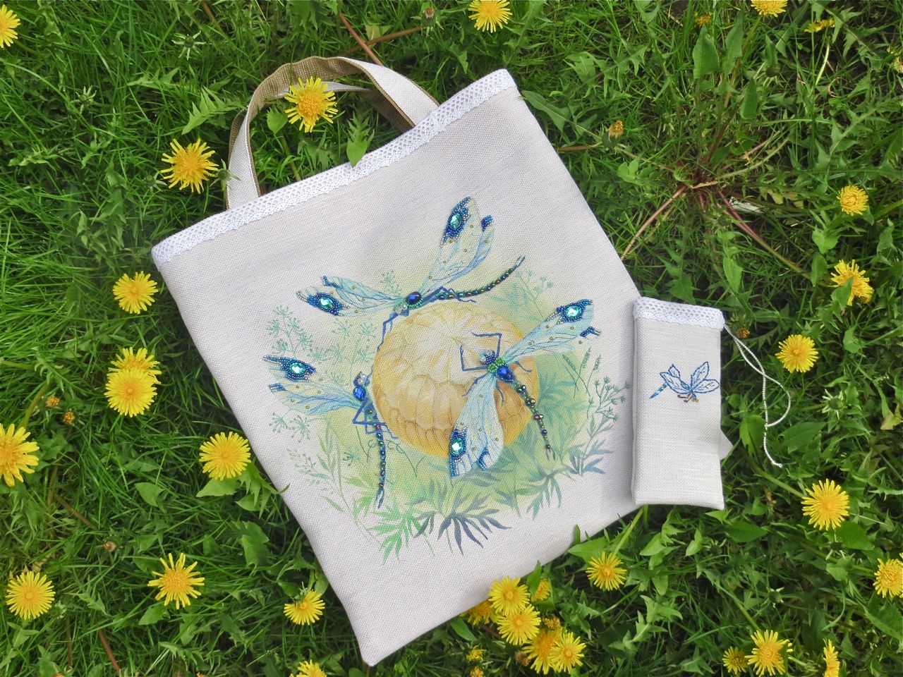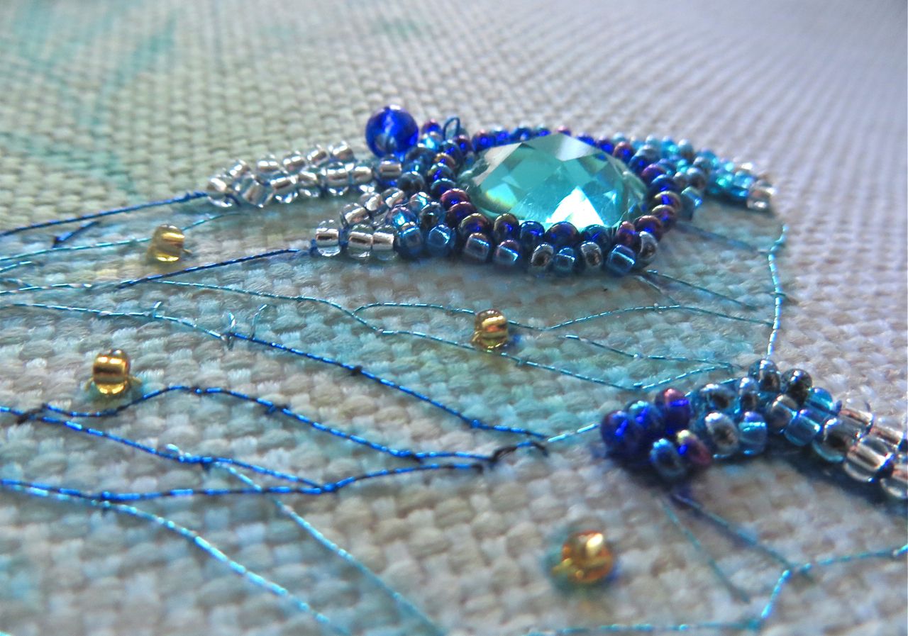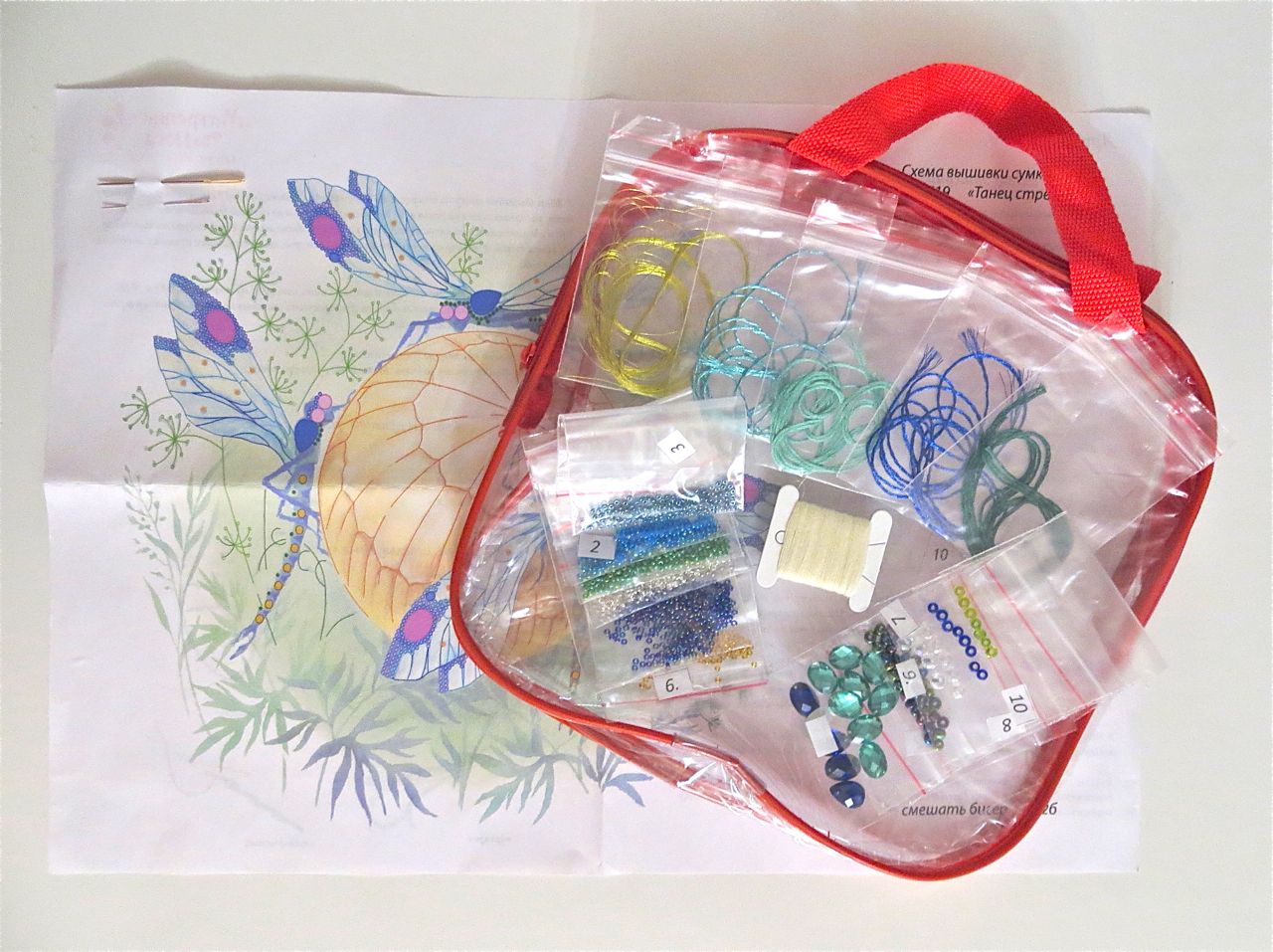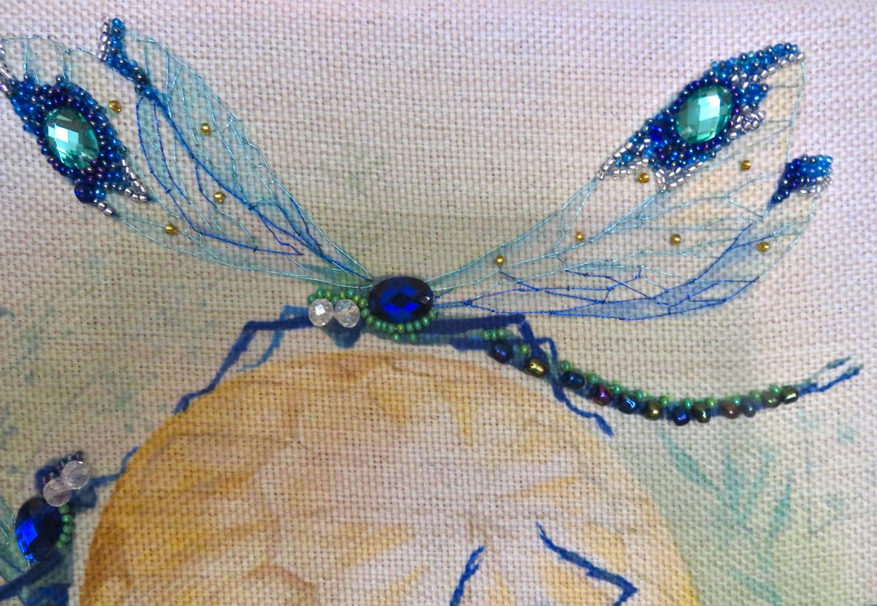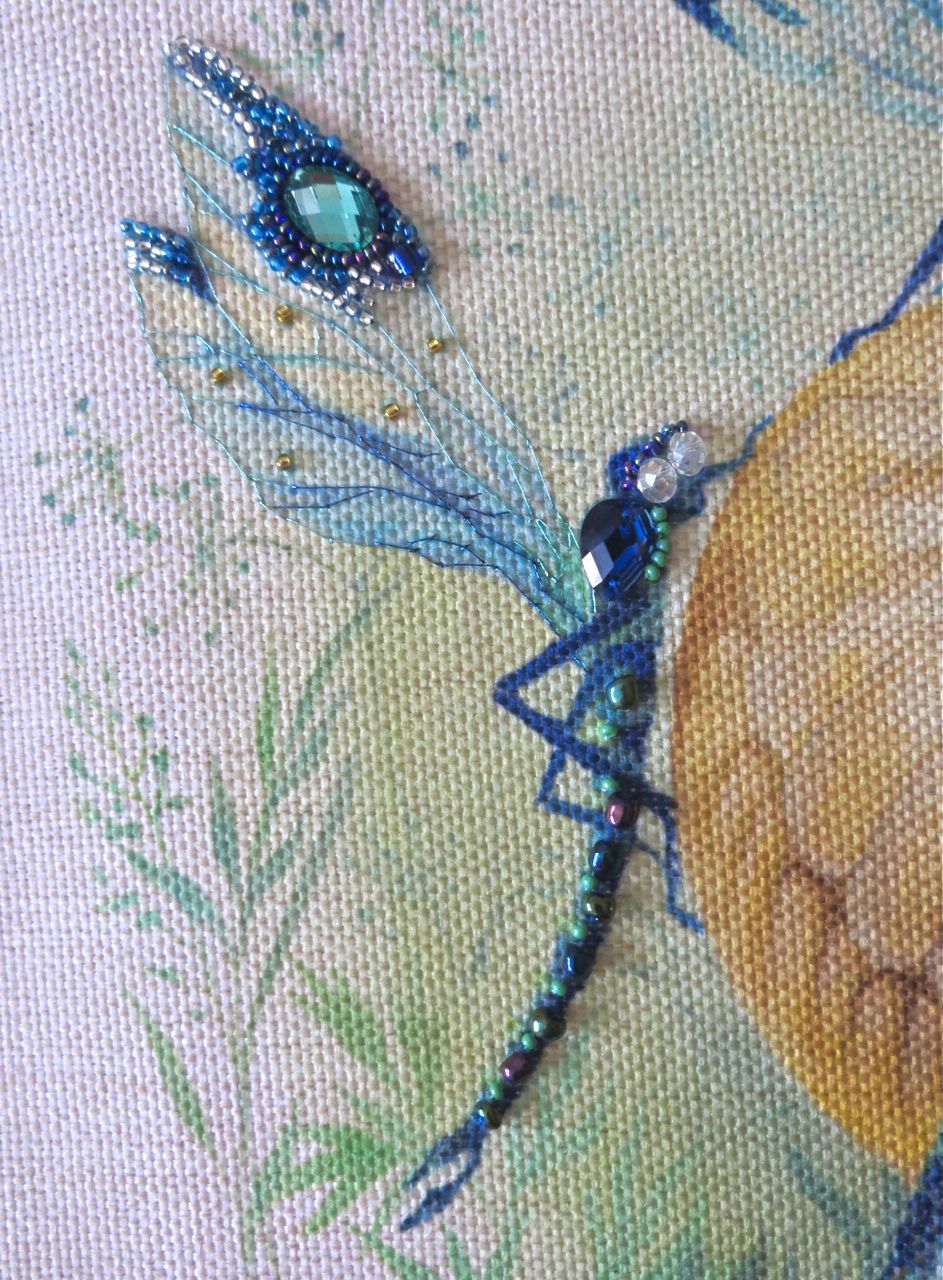 25 мая 2017 Танец стрекоз, или От сумы не зарекайся! (Уважаемые модераторы, фото, размещенные в данном посте, - не для гаечки. Фото для гаечки будут в следующем отдельном сообщении ) Девочки, поздравьте меня с обновкой! Недавно подумалось: отпуск на носу. Пусть и проведу его не у моря, а с родителями, но хотелось бы немного к лету прибарахлиться. Который год лежала у меня заготовка для сумки от "Едренина Матренина Посада", вокруг которой я каждое лето описывала большие круги. Достану, посмотрю на этого монстра размером 41 х 43 см с метровыми ручками -- и сердце от страха сжимается. Запихивала опять куда подальше этот набор с глаз долой. И вот наконец-то набралась мужества и решилась! В прошлое воскресенье разложила на столе все бусины-стразины, чтобы они меня манили и больше не отпускали, пока не сошью себе новую сумку. Все блестело и играло переливами. Лепота! В порыве экстаза распорола все швы, в том числе и подклад, так как сразу поняла, что сумку такого огромного размера мне, во-первых, просто не осилить в прямом смысле этого слова, и, во-вторых, сумка эта предназначена в основном для пляжа, который мне пока что только снится. Зато порка сумки позволила мне закрепить ткань на станке и вышивать с комфортом. Мурча от удовольствия, пришила стразы сначала одного цвета, потом лапа потянулась за второй партией. И тут меня вовремя дёрнуло глянуть на уже вышитые сумочки, выложенные в галерее. Батюшки! Вместо голубых страз на этом месте, оказывается, должны быть зеленые! Все дело в нумерации пакетиков с материалами, которые упаковщик до конца не пронумеровал, а даже то, что пронумеровал, перепутал. Да еще в самой схеме вместо номеров по порядку бисер разного цвета обозначен одной и той же цифрой, только под буквами а) и б). Вот он с перепугу, видимо, перепутал, а потом и вовсе плюнул на это дело - авось, покупатель сам разберется! На этом фото видно, что под № 12 должен быть крейник, а не зеленые стразы. В результате правильно пронумерованным был пакетик под №1. Остальные номера производитель предлагал угадать самостоятельно. В схеме три вида сине-зеленого бисера обозначены одним и тем же символом и практически одного и того же цвета, поэтому вышивала местами по своему усмотрению. Стразы ужасного качества - битые, калеченные, с боков непрокрашенные. Хорошо еще, что всех материалов было положено с избытком, можно было выбирать, а сбоку пришила бисер, поэтому облезлые бока удалось замаскировать Очень понравились цветные камушки, которыми вышивается спинка стрекоз! Они все разноцветные, переливчатые, будто из сказки. Глазки вышиты прозрачными бусинами, крылышки - сине-зеленым металликом. Затем приступила к волшебному желтому цветку-шару. Там вышивать практически нечего, только контуры, но получается эффектно. После этого вышила травинки, накрутив огромное количество фрузелков (слава вышитой ранее овце-рукодельнице, на шерсти которой наупражнялась на этих фрузелках на всю оставшуюся жизнь ). На вышивку ушла половина выходного дня и вечер понедельника. От распоротой сумки осталось донышко, пришивать которое не решилась, не захотев ее утяжелять. В донце был вставлен какой-то интересный материал для придания жесткости, и я, недолго думая, сварганила из него очечник, на котором остатками ниток и бисера вышила стрекозу. Сшила края и - вуаля - новый домик для очков гото