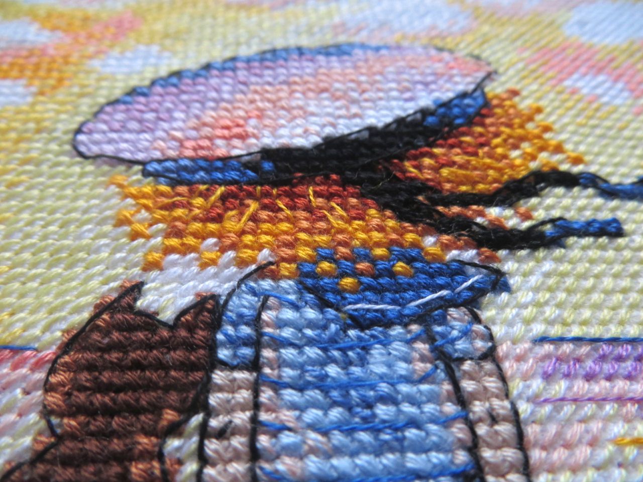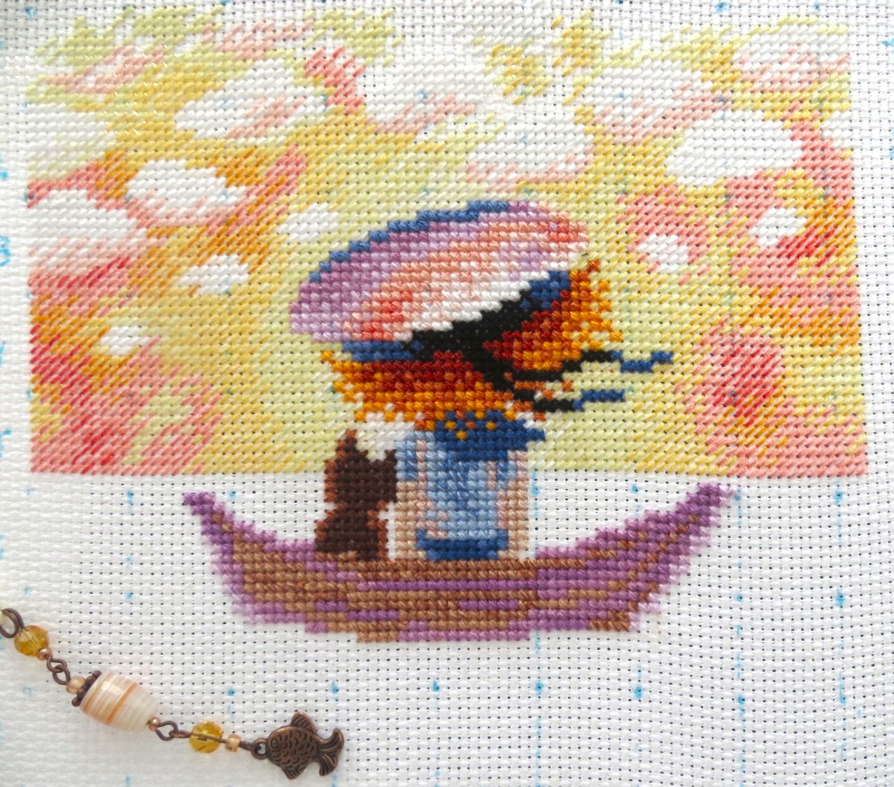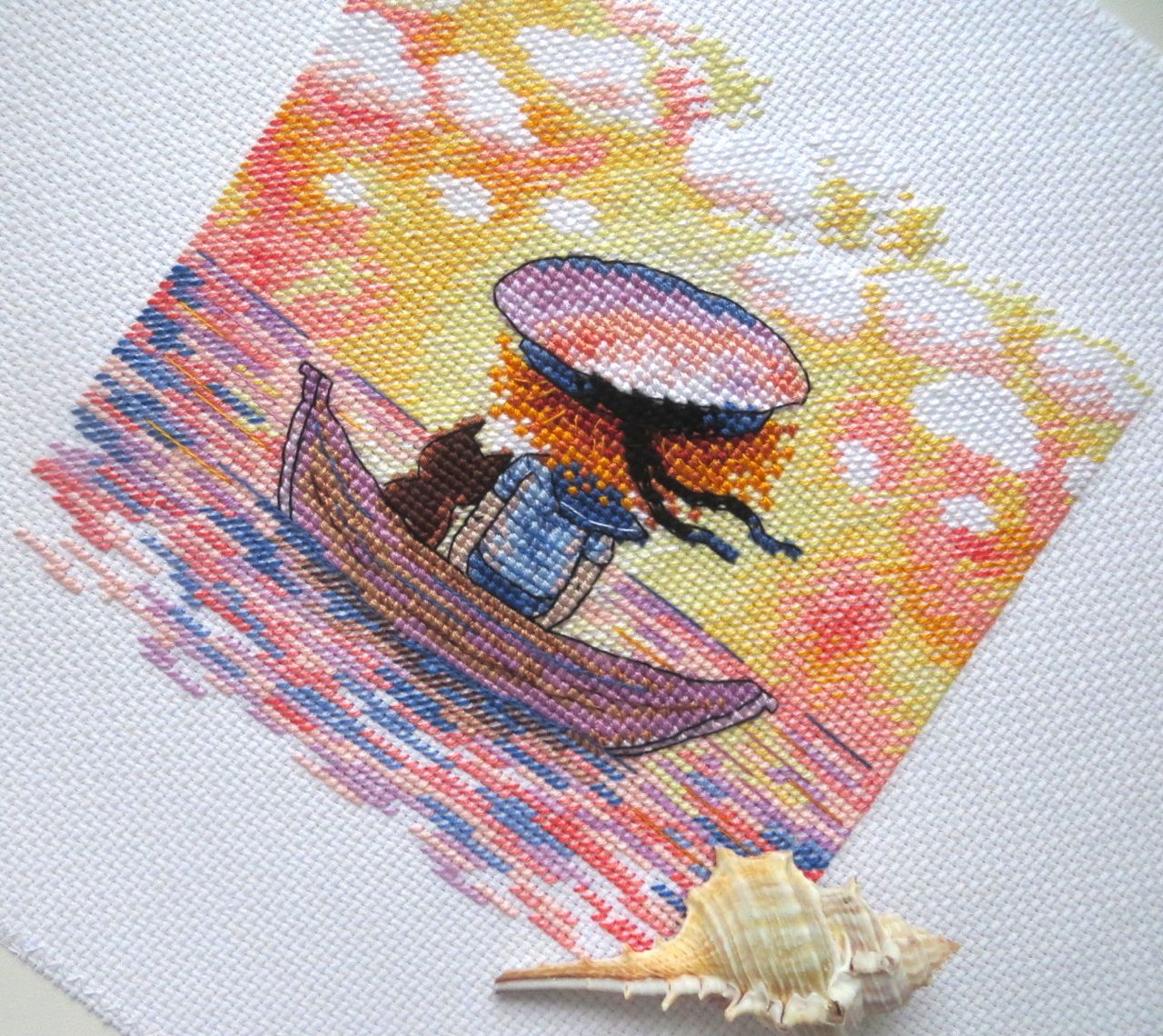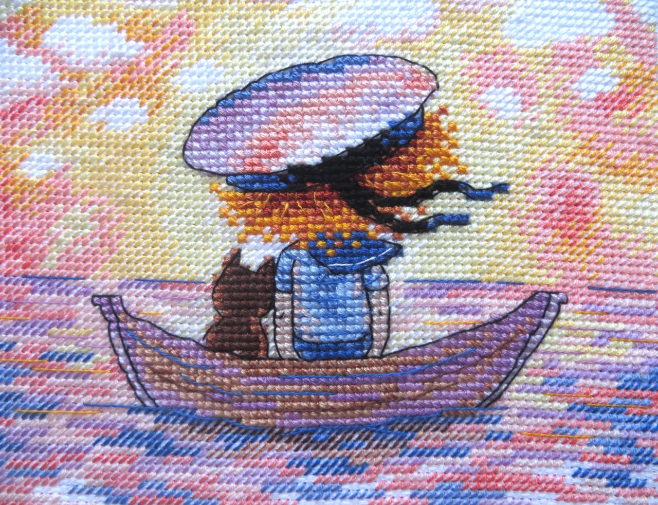 7 августа 2017 Успела! Успела постирать и погладить вышитый наборчик до лунного затмения! Как-то прочитала, что все дела к началу затмения нужно обязательно завершить. И у меня получилось! Правда, саму багровую, как обещали астрономы, луну, увидеть так и не удалось, так как московское небо было затянуто тучами Случалась ли у вас любовь с наборчиками с первого взгляда? У меня это произошло совсем недавно, когда увидела новинку "М. П. Студии" -- рыжеволосого мальчугана с доверчиво прислонившимся к нему котиком, уплывающими на лодке куда-то в закат. Набор так вроде бы и называется, "Уплывая в закат". "Вроде бы", так как на обложке название нигде не значится, и романтичная картинка зашифрована обыденным сочетанием буковок и циферок: НВ-616 Пока вышивала, называла для себя эту историю котика и мальчика в матроске "Одиночество вдвоем". Сюжет какой-то пронизывающе-ностальгический, исполненный одновременно и чувства одиночества, и тихой, негромкой радости от того, что рядом с тобой находится кто-то, кто понимает тебя с полуслова, с полувзгляда, когда находишься с родным тебе по духу существом на одной волне в буквальном смысле этого слова, когда не нужны слова и достаточно вот так, тихонечко покачиваясь в лодке, думать каждый о своем, провожая взглядом полыхающее красно-желто-оранжевое зарево заката, отражающееся в морской глади, как в зеркале... А может, это река? О чем им мечтается в этот момент? Мальчику, наверное, грезятся дальние морские странствия, подвиги и приключения, а коту - прогулки под луной и думается, быть может, о том, как хорошо, что есть этот дом, в который всегда можно вернуться, и этот мальчик, под бочком у которого можно, свернувшись калачиком, сладко заснуть... Пусть ему снятся приятные кошачьи сны, а мы же не будем нарушать этот хрупкий момент единения Природы, Мальчика и Кота... Напишу свои впечатления о наборе и процессе, занявшем пару вечеров после работы и один выходной день. Производитель подстраховывается вовсю, подкладывая себе побольше соломки, вещая покупателю о том, что цвета вышивки могут не совпадать изображенными на обложке, оттенки материалов в наборах могут меняться, а размеры готовой работы не соответствовать заявленным. Это значит, что если вам понравилась картинка на обложке, то это не значит ровным счетом ничего. Цвета мулине могут заменяться на удобные производителю, равно как и размер и цвет канвы. Утрирую, конечно, но все же покупатели должны быть морально готовы к неожиданностям, причем не обязательно приятным. Схема распечатана на листочке толщиной в папиросную бумажку. Клянусь, я таких тощеньких схемок никогда прежде не видела! Какая-то жутко недокормленная схема Уж насколько я аккуратно обращаюсь с вещами, но все равно к концу процесса бумажка в одном месте надорвалась и чуток помялась. Я бы посоветовала приклеить ее к более плотному листу бумаги. Канву перед тем, как вышивать, стираю редко. Вложенная в набор Аида была настолько сильно накрахмалена, что при глажке утюг просто захлебнулся ошметками крахмала и долго потом фыркал, отплевываясь Когда набор только увидела в интернете, промелькнула мысль о замене канвы на равномерку, но, повертев в руках, мыслю эту прогнала прочь и вот почему: незашитой остается маленькая часть картинки, а сам дизайн вышивается полукрестом в 2 нити и полным крестом в 3 нити. Если ме