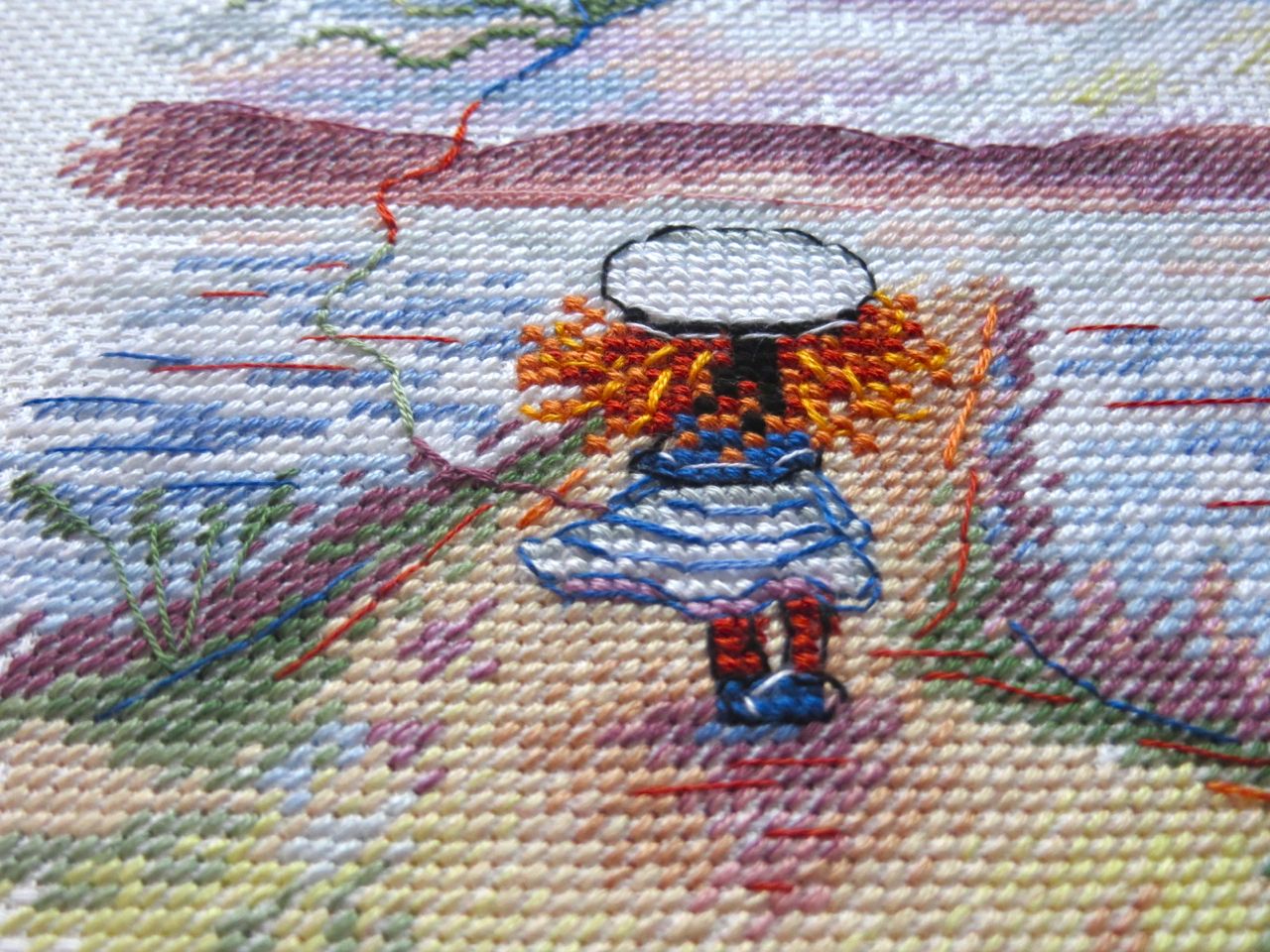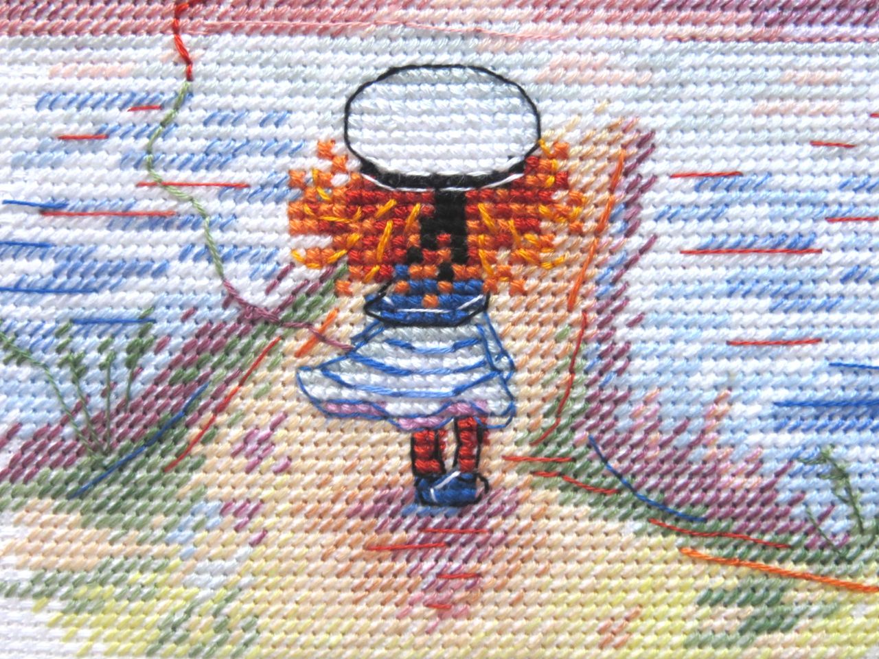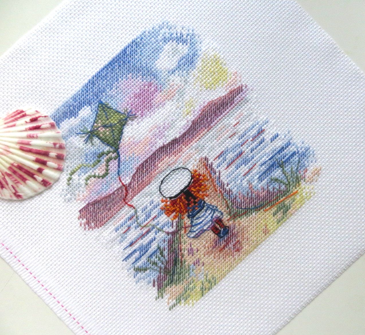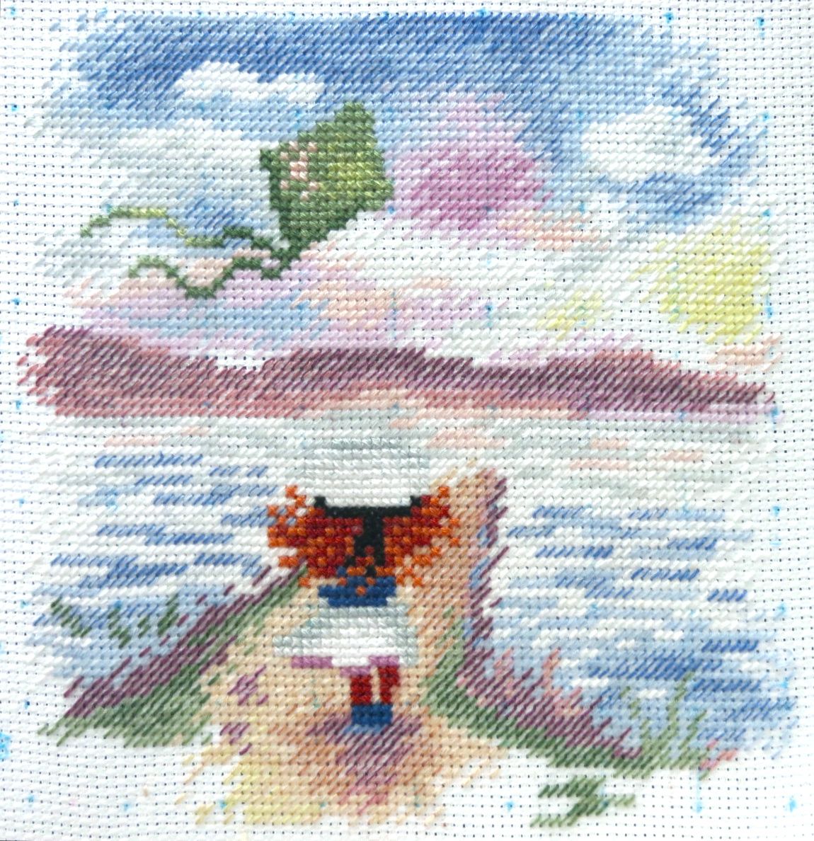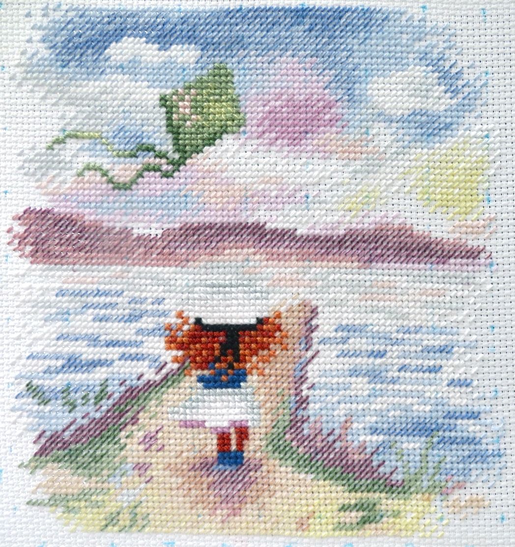 19 августа 2017 Итак, у меня появилась девочка! Вышилась она еще быстрее мальчика. Вся картинка, за исключением девочки и воздушного змея, вышивается полукрестом. "М.П. Студия" НВ-620, "Следуй за мечтой", размер 15 х 15 см, Аида 14. Дизайнер Анжелика Иванова (страна должна знать своих героев! ) На самом наборе название снова отсутствует. Видимо, до сих пор не определились, следовать за мечтой или нет, и если да, то как далеко и в каком направлении В такой малявке всего 19 цветов и аж 9 (девять!) блендов! Вышивается все это великолепие полукрестиком в две и три нити, крестом в две и три нити и завершающим аккордом звучит обалденно красивый цветной бэк в одну и две нитки. В общем, не заскучаешь! Зато смотрится картинка очень рельефно, с изюминкой Первым делом, распечатав набор, принялась гладить канву. И вот результат первого соприкосновения утюга с прекрасным Аидой 14 С подошвы свисают ошметки крахмала И это притом, что фото сделано после одного скромного поглаживания канвы. Аида оказалась дамой капризной. Стирать канву до вышивки я не люблю, так как она теряет свою жесткость, а на вялой тряпочке вышивать как-то несподручно. Ну ладно, утюг привела в божеский вид, канву отгладила, сделала первые крестики , вторые и вошла во вкус Посмотрите, как темноватая на первый взгляд картинка превратилась в дорогу в светлое девочкино будущее всего лишь с помощью нескольких рядков полукрестиков, вышитых желтовато-лимонными оттенками мулине И вот, наконец, пробило время бэка, сразу расставившего все по своим местам: зеленая краказябра в небе оказалась управляемым девочкой воздушным змеем, у самой девочки вырисовались морская фуражка и полосатое платьице, а непонятная лиловая клякса на дальнем плане оказалась на самом деле горами И немножко макриков, чтобы хоть чуть-чуть передать эффект 3D В результате я очень рада, что у моего мальчика-морячка появилась такая же рыжеволосая, потрясающая сестренка Чивава, Эжени, weron и 22 других сказали спасибо Поделиться сообщением Ссылка на сообщение