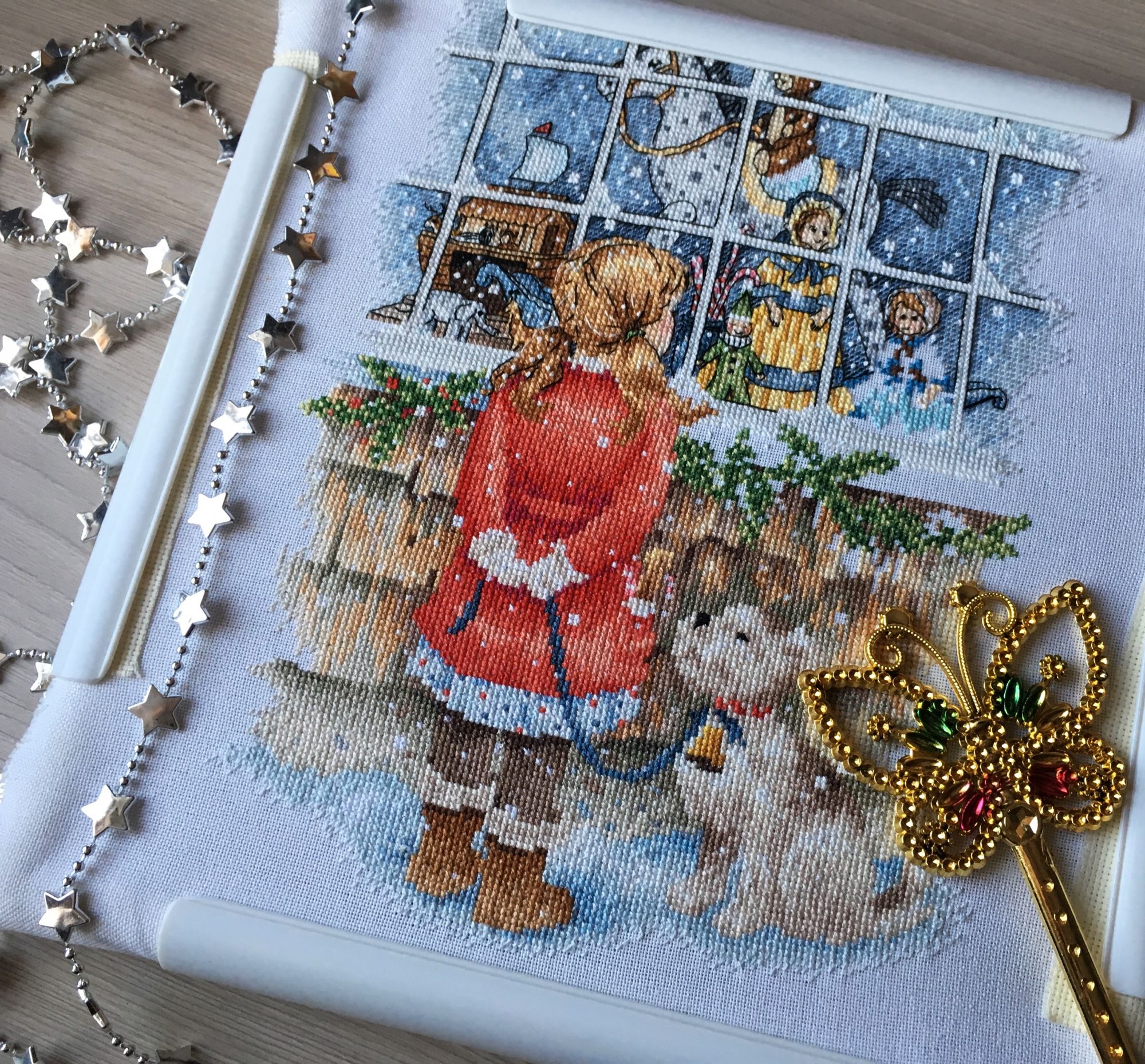 23 декабря 2018 Всех с наступающим Новым годом! Давно меня тут не было. Надо отчитаться перед Новым годом.) И так, после сиреневых сумерек, примерно 24 октября, я продолжила вышивать «новогоднее желание» и взяв себя в руки закончила 21 ноября. процесс был интересный, хоть и растянулся на пол года.) в процессе раз 5 пришлось стирать работу, такое у меня впервые было очень много желающих потрогать. Процессы у меня всегда хранятся на самой верхней полке, но старшая давно уже может добраться туда. поэтому однажды решила дорисовать кошечку, потом пролила кофе и конечно же обязательно надо было показать младшему который измазал ее в шоколаде. Но все закончилось хорошо) После этого я закончила небольшой секретный проект и приступила к авторской схеме Яны Минасян «Виолончель» (с 26.11-13.12) Результат превзошёл все ожидания! я влюблена в эти фонари и в эту пару хочется поскорее оформить, но это будет только в следующем году. Есть одна ошибка.. пара и полукресты над ней должны быть на одну клетку правее, но решила оставить так. И уже на фото увидела что не хватает пары стежков бэка. Сейчас уже исправила, но сделать фото возможности нет. Следующим процессом будет «Зимний вечер» от Екатерины Волковой. Целый год я решалась, проводила оценку своих возможностей и всё так же продолжая сомневаться купила схему, а раз купила пути обратно нет)) заказала мулине и основу. долго ломала голову над основой и в итоге взяла 28 каунт. работа будет долгой, кропотливой незачем усложнять себе жизнь)) уже почти неделю заказ дожидается меня в ПВЗ, а муж меня никак не может довезти. Надеюсь во вторник заберу, но начну наверно только в следующем году т.к дома ремонт ванной, в саду утренники, прививки, прорезывание клыков и моляров( которые не желают прорезываться в одиночку, а надо всем и сразу ) И совсем забыла! У меня же есть вот такая красотка спасибо что дочитали до конца) Корабль я тоже закончила. maui, Bogdan, Дикая белочка и 3 других сказали спасибо Поделиться сообщением Ссылка на сообщение