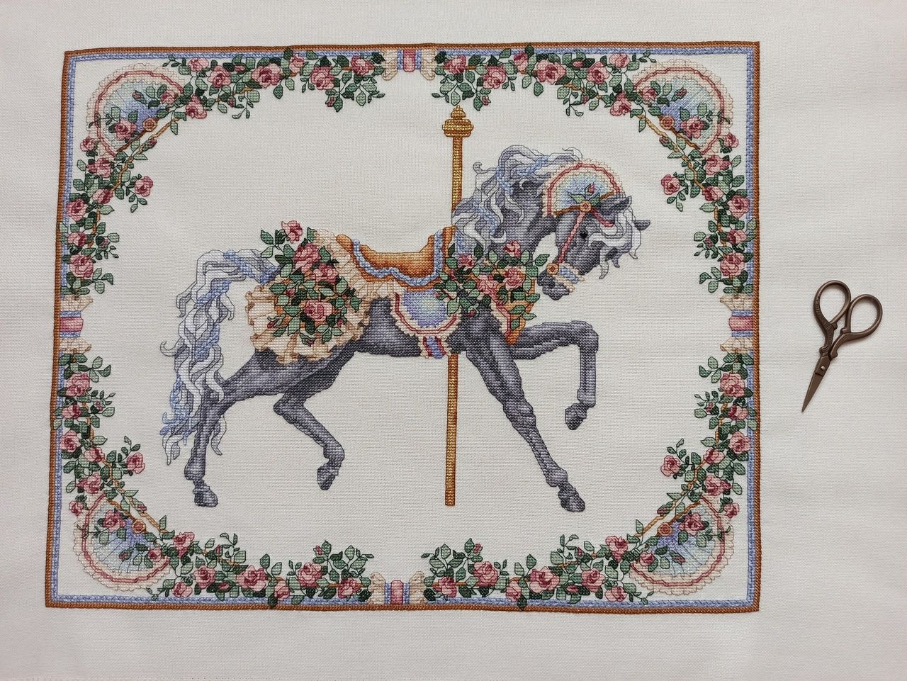 5 февраля 2023 Всем привет! Сегодня у меня случился финиш. После последней фотосессии всех своих процессов. Оценив от чего больше всего замирает сердце я поняла что очень сильно хочу увидеть финиш Лошадки от Терезы Венцлер (Carousel horse. Summer). И вот на протяжении месяца (с 7.01 по 5.02) я вышивала только ее. Никак не ожидала что меня накроет такое вдохновение. Давно уже у меня такого не было, чтобы я засыпала и просыпалась с мыслями только об этой вышивке. Срок на завершение я себе дала конец февраля- начало марта, но финиш случился раньше. Даже немного грустно что вышивка закончилась, последние дни я тянула как могла, хотя могла закончить на пару дней раньше. Размер: 242х198 крестиков Основа: Лугана от Цвайгарт, цвет 3835/101 молочный. 42 чистых цвета DMC, 14 блендов из них. 2 крейника BF 032 Pearl BF, 002 gold BF (но вместо него я использовала 002HL Gold High Lustre) Размер готовой работы 36,5 х 46,5см. Кол-во крестиков : если верить первому попавшемуся перенабору то где-то 34700 ХХХ. Очень красивая работа, да трудоемкая, кропотливая, но результат получается великолепный. Не жалко потраченного на нее времени и сил. Очень хочу ее оформить. Давно я не была в багетках и даже боюсь представить сколько встанет оформление. Забава_, relax_cross_stitch, Хозяйка смешных зверей и 1 другой сказали спасибо Поделиться сообщением Ссылка на сообщение
