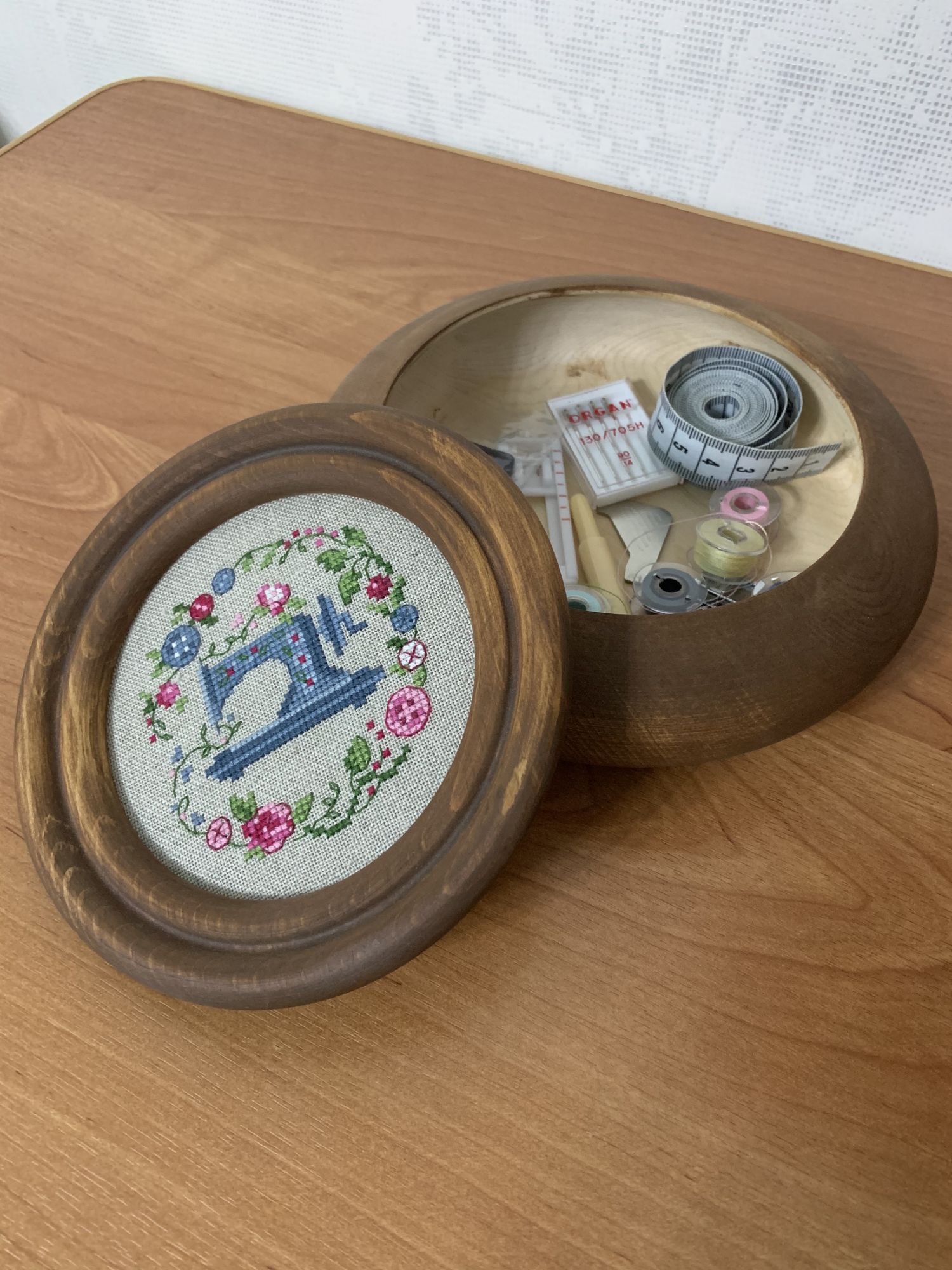 3 ноября 2020 Девочки, всем огромный ноябрьский привет! Наступило мое любимое время года: время желтых листьев , тихой воды , хризантем и длинных вечеров у камина . И конечно же вышивки... Мое лето официально закончилось 30 октября, именно в этот день финишировали красочные бабочки от Дименшенс. Вот такими яркими моментами запомнится мне окончание этой вышивки. Долго думала, делать или нет так нелюбимую мной выкладную нить по периметру работы, но наличие в ней металлика решило этот вопрос. Тонкий контур вышивается блендом мулине и блестящей ниточки. А на финише меня ждала вот такая красота! Мне искренне жаль расставаться с этим процессом, настолько легко, приятно и расслаблено он у меня вышивался! Прибавьте к этому восхитительный результат и вы получаете коктейль идеальной вышивки! Далее покажу оформление. Ещё в начале лета оформилась Моя Италия от Золотого руна. Оформление я старалась выбирать как можно более простое, чтобы подчеркнуть простор картины. В итоге-один слой молочного паспарту и рама с чуть отдающими оливковым цветом прожилками. Вышивка украсила кухню, идеально вписавшись в небольшой простенок. Любуюсь каждый день! Долго, очень долго я готовилась к следующему оформлению. Деревянные заготовки для этого комплекта я заказала еще весной. Основной трудностью стал подбор ткани. Огромное количество пересмотренных вариантов - серые, синие, красные, в цветочек, полосочку, на швейную тематику... Только увидев у одного блогера видео с обзором каталога из магазина французской вышивки, я поняла вот оно! Горошек!!! Пазл сложился и я засела за шитьё. В итоге получился уютный швейный набор, украшающий теперь мой рукодельный уголок. По бокам чехла расположила два очень нужных кармашка с миниатюрными сюжетами. В них идеально помещается педаль от швейной машинки и коробочка со шпулями. Сам чехол сшит из хлопковой ткани, внутри стеганый подклад из неё же. Кармашки внутри тоже оформлены подкладкой, которая склеена с внешней вышивкой паутинкой для пущей жесткости. Обрамила я все это дело темно-красным кантом. На этом сегодня всё. Спасибо всем заглянувшим на огонек! Всем тепла, добра и света!!! InnaN, nata-g, Catopuma и 15 других сказали спасибо Поделиться сообщением Ссылка на сообщение