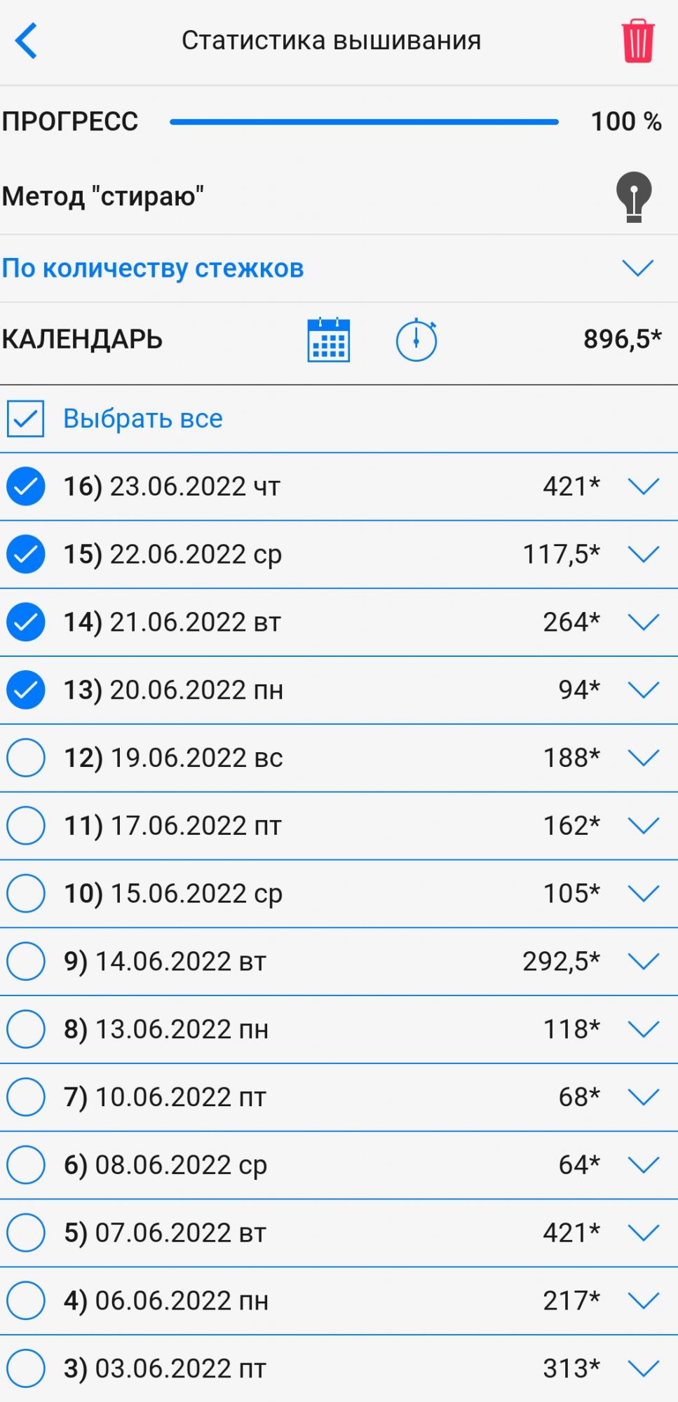 24 июня 2022 23.06.2022 в 08:26, Kattrielle сказал(а): О, с конкретными цифрами моё ощущение, что я в среднем поскромнее вас в результатах, вполне подтверждается У меня "годно-вышивальная" неделя --- это тысячи полторы итого Катюша, и такие цифры у меня бывают. Подозреваю, что в году средне арифметическое за неделю стремится к колебанию от 1,5-2 тысячи)) Сейчас у меня заканчивается 4-я неделя, когда я на работе могу на снапах вышивать. Со следующей скорее всего придётся возвращаться к пластику. А не хочется пока. 23.06.2022 в 08:26, Kattrielle сказал(а): при этом я ещё и нагло полукрестики не отделяю от крестов в подсчётах. И стежки бэка тоже суммирую "целиком" Знаешь, Сага это всё хитро считает. Особенно бэк, я вчера пыталась понять, но потом плюнула. Только с дробью разобралась - было 3 дробных креста, а программа их отображала 9 четвертинками. Вот сделала скрин статистики на лисёнка. Вчерашний результат - это на работе и дома. Хотелось финиша)) 23.06.2022 в 08:26, Kattrielle сказал(а): Лисик вообще крут, такая медитация))) И схема отличная))) 23.06.2022 в 08:26, Kattrielle сказал(а): Вот я тоже пока слона вижу Милого, с выразительным взглядом, но --- слона))) Пока это самый популярный результат)) Ага, на корову это до сих пор особо не похоже))) vasilisa-1977, Leutnant Ripley, Грёза и 1 другой сказали спасибо Поделиться сообщением Ссылка на сообщение