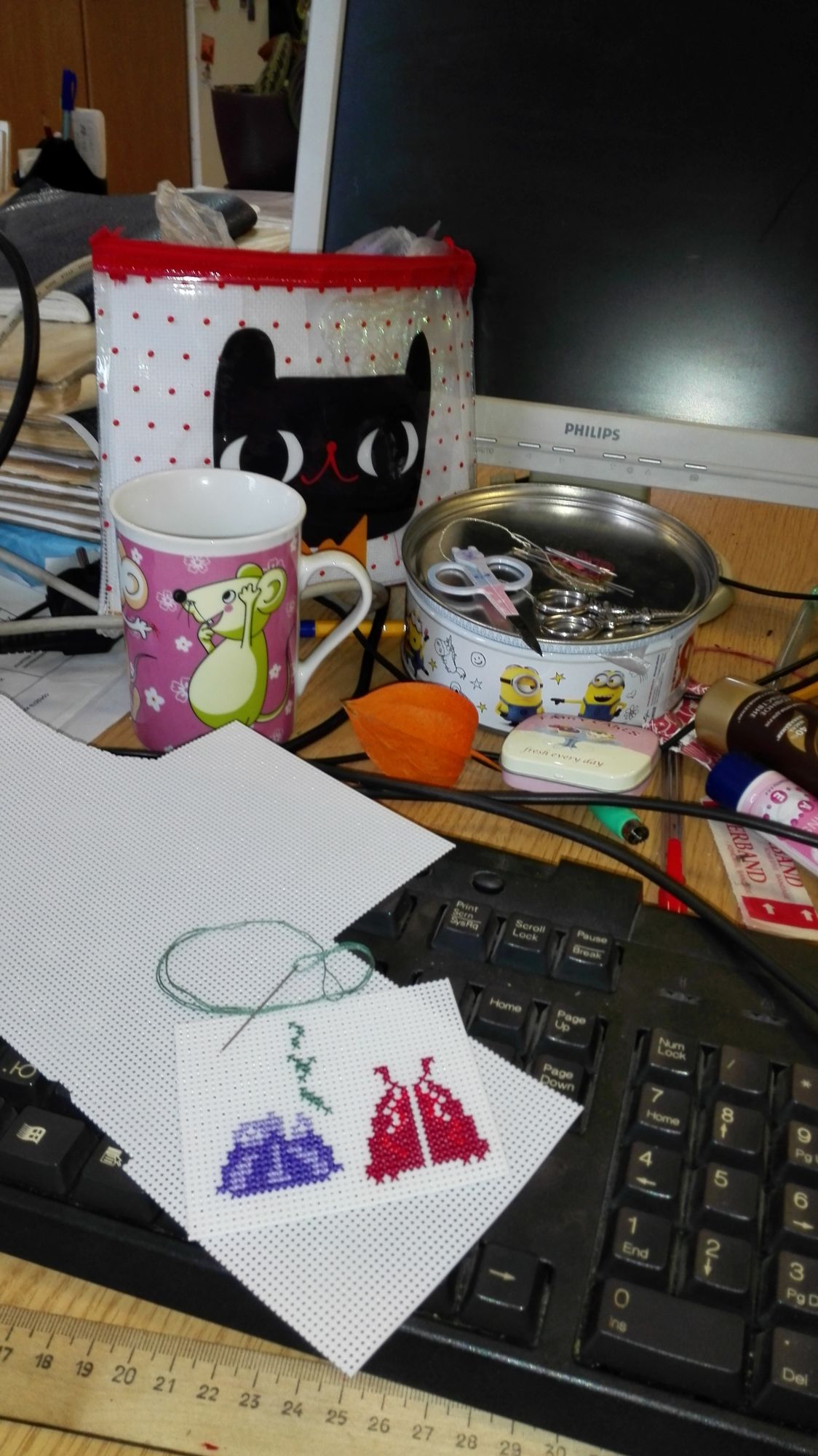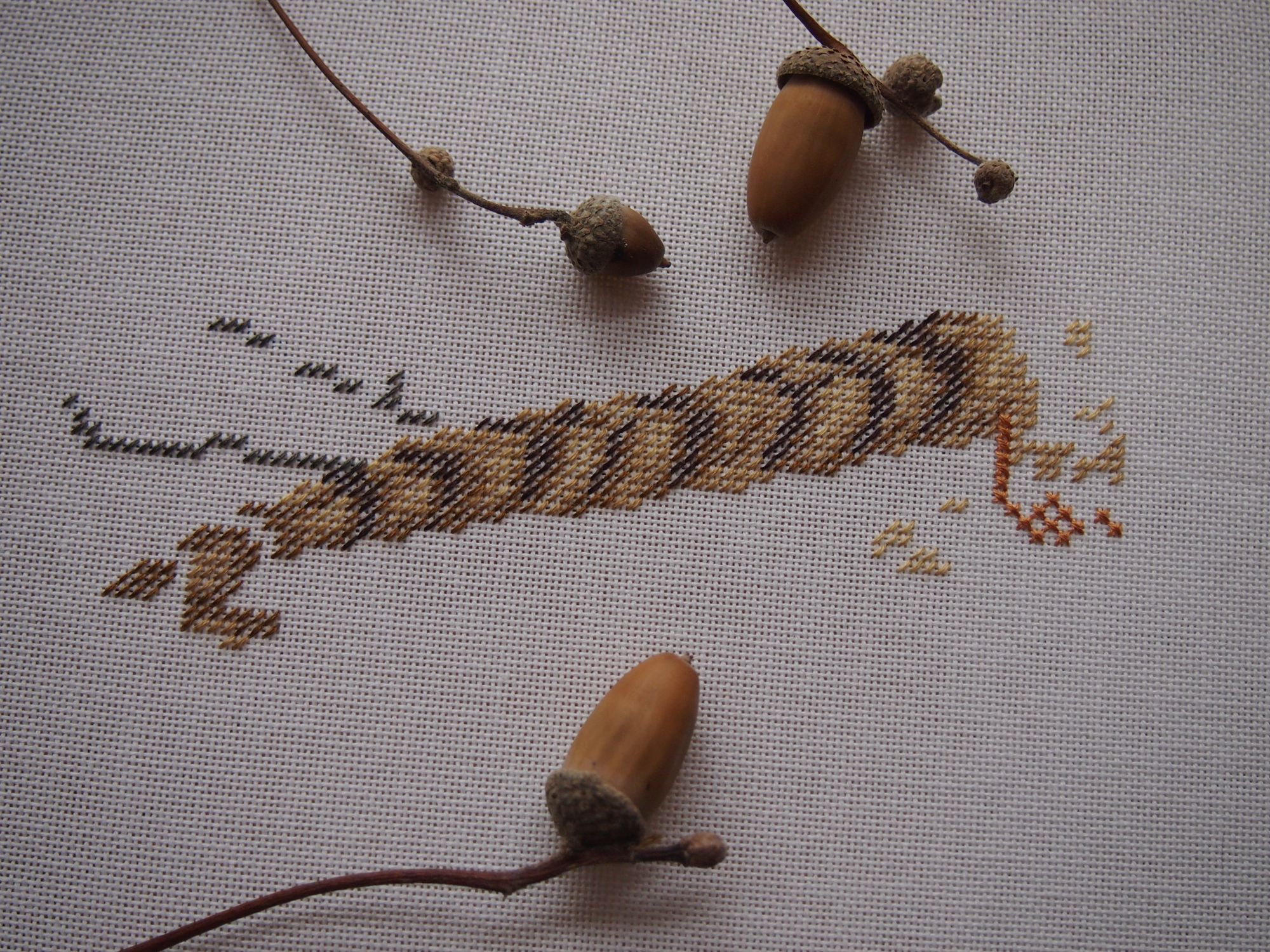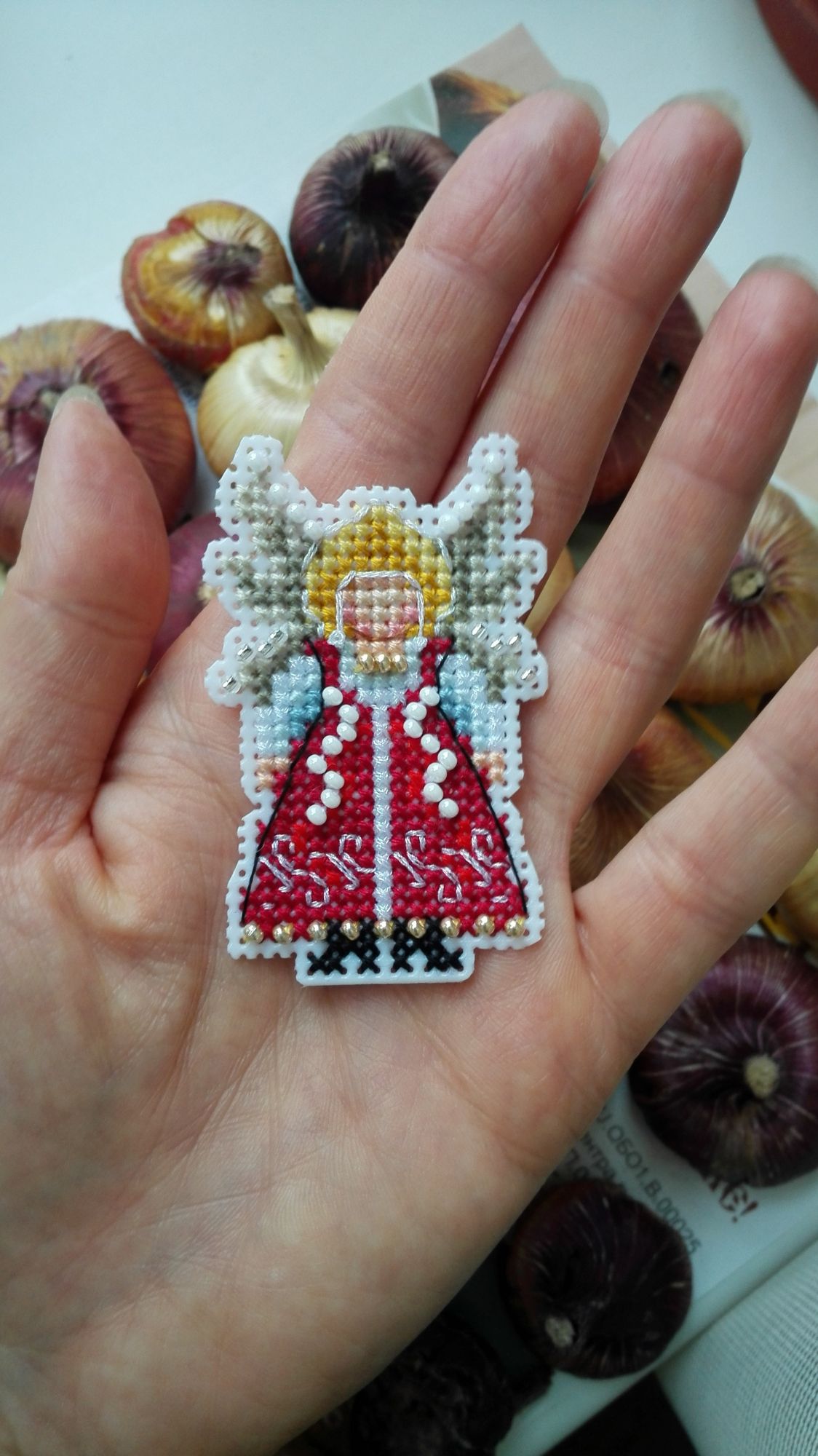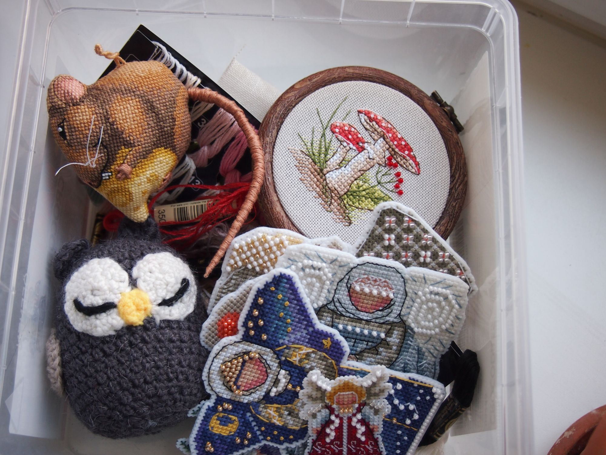 21 октября 2019 Добралась до ноута, хорошего всем настроения! Сегодня чуть не спалилась на работе - командир решил после долгого отсутствия зайти и задать свой любимый вопрос - "Чем занимаетесь?"... Я в этот момент пыталась читать тему Тольны на телефоне и пришивать фетр мелкоте... Хорошо, что вчера ниточки на тыковку решили от меня спрятаться, маленькие снапики я б так просто не скрыла... Завтра можно будет спокойно вышивать Вышивальные две недели завершились отлыниванием - после крысика потребовалось немного передохнуть. За то теперь точно финиш: Крыска Ириска - самое сложное было сшить. Ой и поматюкалась я. Ещё и усложнила себе жизнь - набивала через кривую часть внизу, не повторяйте моей ошибки. Фотки домашние и на улице. Следующим пунктом идёт новый старт. В этом году у меня почти нет осенних дизайнов, а очень они мне нравятся. Вспомнила я про набор, который имеет хорошую такую "выдержку". Встречайте Портрет Осени от НеоКрафт. Неправильно я думала, схема на двух листах и отдельно бэка нет. Значки мне мелковаты, хотя листы А3 формата. Финку я не сильно люблю, большой вопрос к её мерсеризации, скрипит, куча шероховатостей, не пластичная. Начала со скучного куска - то ли перья, то ли листья и мой бррр - полукрест. Хотя результат глазам нравится. Основу менять не стала - Линда молочная (вообще изначально мысли были, но посмотрела на обилие бэка и решила, что вполне хорош 27 каунт). Вышиваю дальше и жду "сюрпризов" и подвохов. Следующий финиш без гаечки. Я завершила очередную серию по книге Яны Горкальцевой и вышила подарочных малюсек (Яна их дарила всем участницам весеннего этапа) Ангелы-берегини Последней по книге вышилась Берегиня прозрачного росистого утра Малюськи И все вместе Моя мама вчера связала Себастьяну мышку, чтобы он не воровал её клубки И немного кошачьей помощи Пушистую тушку надо примостить именно там, где я вышиваю. Осень Всем лёгких и ровных крестиков! Naduh, Ветер, Камма80 и 15 других сказали спасибо Поделиться сообщением Ссылка на сообщение