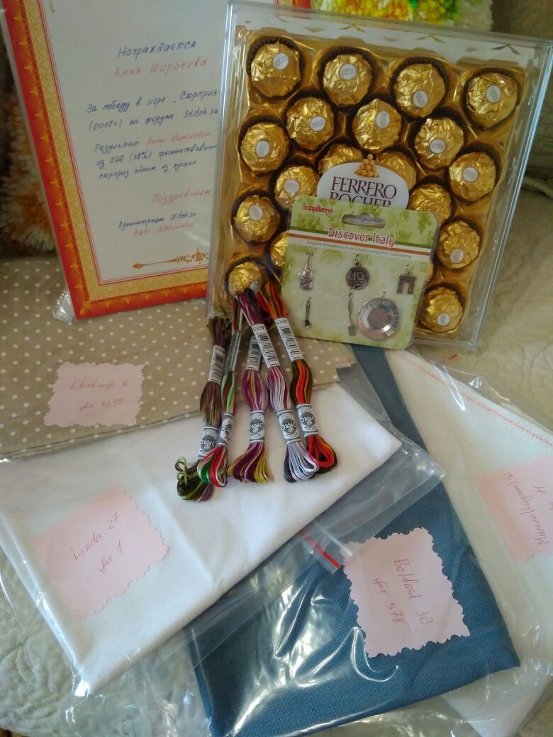 7 октября 2017 В 06.10.2017 в 12:31, Анна Широкова сказал: Вчера и я получила свою награду! И тоже плясала от радости! За вечер несколько раз доставала,разглядывала,трогала и восхищалась всем,что мне прислала Александра! Очень красивые тканюшки-равномерочки разных цветов. С люрексом прям сверкает,переливается. А как я мечтала о канве в горошек! А какой интересный цвет Belfast! А какие ниточки DMS! Шармики интересные. Конечно же конфетки. И грамота. Девочки,это настоящая коробочка с богаЦтвами! Огромное спасибо Александре и Алексу за такой шикарный подарок! Татусе спасибо за интересную игру,за подсказки,за поддержку! И спасибо любимому форуму,за вдохновление и идеи к творчеству! Анечка,тебя тоже с подарками.Такое все красивое! Дичок и Анна Широкова сказали спасибо Поделиться сообщением Ссылка на сообщение