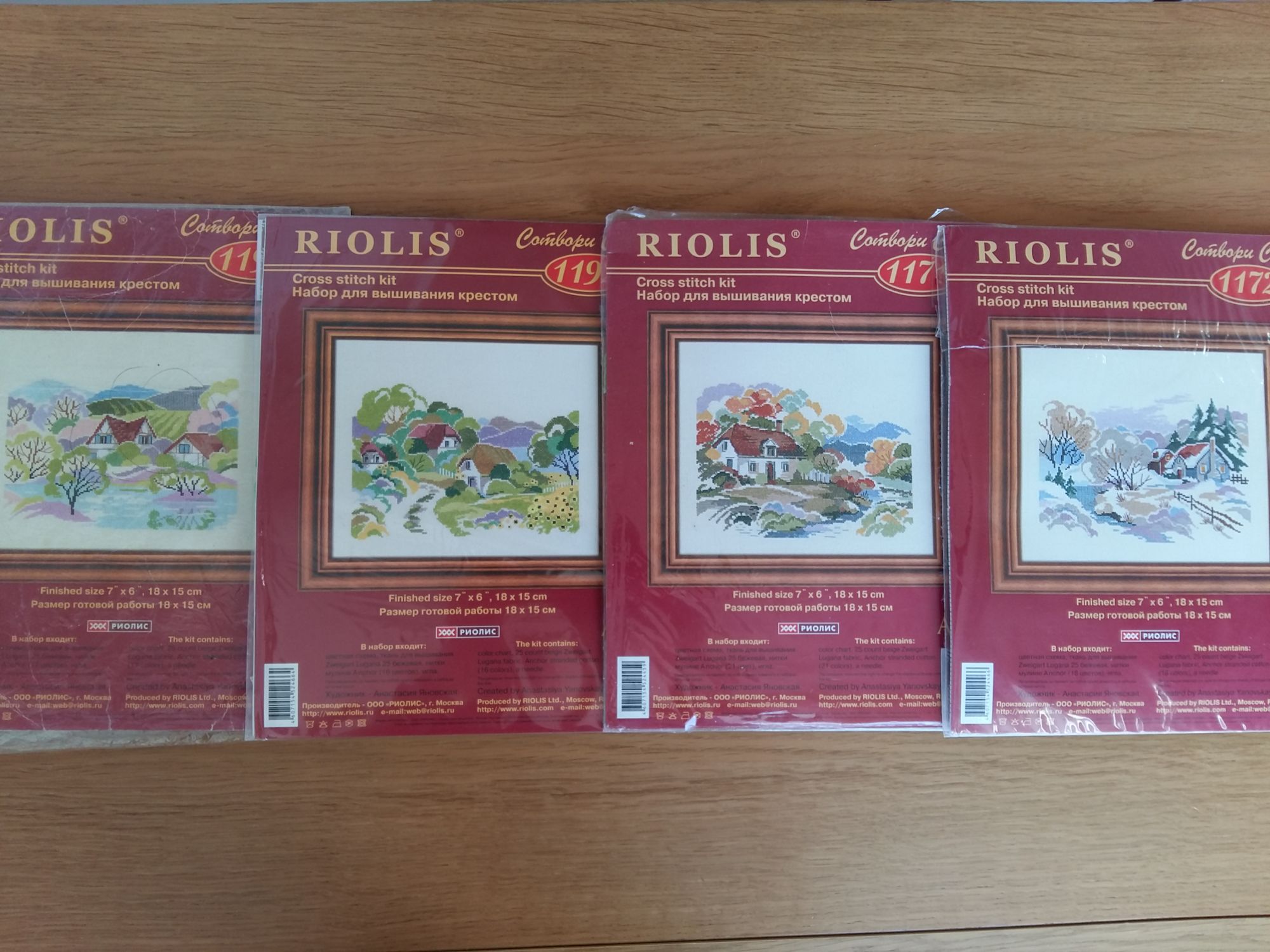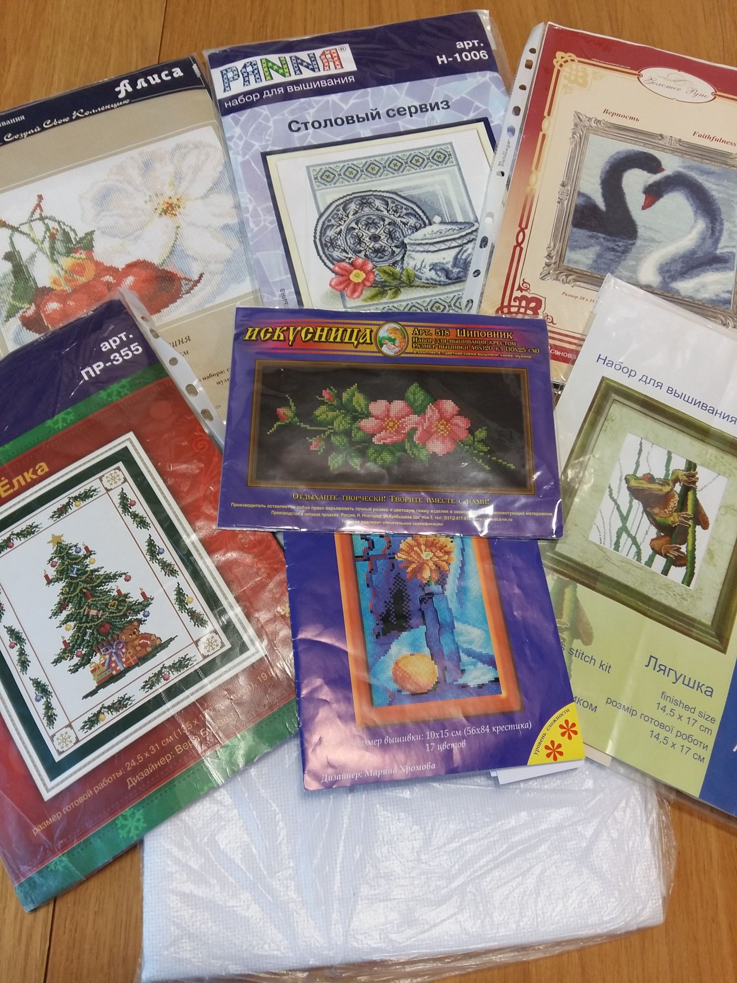 23 апреля 2018 Всем доброго дня (вечера, утра)!!!! Зашла в некоторые темы и взбодрилась: люди красоты столько навышивали! Зеленят гаечки, новые заводят! Покупками хвалятся! А я не знаю за что хвататься - дома бедлам, рабочий темп врзрастает, от хобби один стресс (тут я немного сникла). У меня если кто и трудился - так это хомяк! Он от людей не отстает! Итак: 1. Обмен. Постучалась ко мне наша форумчанка с предложением обменять одну куриную семейку на кое-что из списка желаний. А именно, на 2 наборчика и остатки от третьего. А я у нее углядела остатки от лягушки, которую периодически кладу в корзину. Выступила с встречным предложением. Но она мне эту лягуху так отдала. Потом ей понравился еще один набор, котрый был обменен на отрез польской аиды 14каунта 50×160см. В общем, вот что мне прислали из Тольятти: По обмену: Черешня от Алисы, посуда от Панны и Елочка от Панны с родной канвой и нитками на отшив! И аида. А в "довесок": Лягуха, прекрасный шиповник с красивой темно-синей канвой, остаточки от натюрморта и "Верность". Девочки! Какой красивый набор с лебедями! Я сначала отказалась, а потом рассмотрела отшив и передумала! На обложке мрачный показался.Почему он не популярен? Может из-за обложки? 2. Давнишние желания. В то же самое время мне в личку постучалась другая форумчанка, которую я ранее спрашивала по обмену одного раритета. А она, вероятно, обратила внимание, что я ищу льва от РТО. И, увидев его, на сайте об"явлений, скинула мне ссылку!!! Я его тоже как-то видела, но сразу не купила, а потом он исчез. Так что в этот раз я действовала энергичнее. И на следующий день красавец был у меня дома! Со стопкой журналов, которые я у того же продавца взяла. (Одни люди избавляются от хлама, другие...) Табу на покупки на снятое с производства не распространяется Еще я собрала всю серию пейзажей от Риолис: !!! Когда я только начала вышивать и закупать в неограниченном количестве наборы, увидела у кого-то эту серию и запомнила. Ее уже снимали с производства. Это подстегнуло меня к срочной покупке. Но! Купила лишь лето и зиму. И как-то они мне не попадались больше. В прошлом году я предприняла активную попытку поиска. Начала приставать ко всем на форуме, кто шил или имеет эти наборы в закромах. Но безуспешно. Периодически девочки кидали ссылки на магазины, но все мимо. Потом мне скинули сканы схем с подбором ниток. (Да простят меня борцы за авторские права! - я честно пыталась купить!) Собственно, это событие и подстегнуло меня на покупку карты цветов. И тут наши форумчанки отдали мне остатки от наборов! Девочки, спасибо Вам огромное! ...Зимой по об"явлению купила остатки: Это тоже давнишняя мечта. Еще нравится "Старый город" и "Город у моря". 3. По об"явлениям. (Куплено до нового года, под запрет не попало ) Попались недорого: 4.Закупка тканей! Все началось мирно: наступила весна, появился скан схемы весеннего пейзажа от Риолис, самое время новому процессу! С нитками боле-менее понятно. Нужна ткань! Тут, по случаю, в Мире вышивки скидки на Zweigart. Ну и кое-что по мелочи надо. Пыталась "на глаз" купить ткань как в наборе, но немного оттенок отличается. У купленной мною ткани - более теплый тон. Не знаю видно ли на фото разницу. Параллельно купила еще много чего. Что-то под конкретные цели, что-то приблизительно. Т.к. с монитора (точнее, телефона) правильно оценить цвет не возможно, брала похожие тона. Здесь две сто