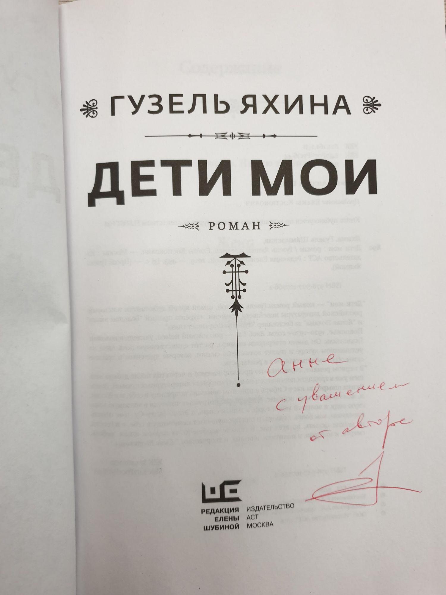 23 ноября 2019 20.11.2019 в 05:24, sette venerdi сказал(а): Культпоход. В понедельник мне было не до отчёта, потому что вечером я ходила на лекцию! А по сути на творческую встречу с Гузель Яхиной. Сегодня это имя на слуху и представлять, я думаю, не надо. "Зулейха открывает глаза"- этот роман стал первой книгой за много лет, прочитанной мною на одном дыхании, нашедшей огромный отклик в душе и однозначно рекомендованной всем! Поэтому, зацепив краем глаза информацию о предстоящей лекции, отметила мысленно дату в голове и мне повезло вернуться к ней в Москву. Прихватила с полки "Дети мои"- второй роман писательницы- для автографа и пошагала.. Встреча пролетела! Формат: вопросы-ответы. Интересно! Очень понравилась сама Гузель: корректная, потрясающая речь! Ну и, разумеется, я не отстала со своей книжкой! Я совсем недавно прочитала ее книгу «Дети мои». Потрясающая вещь. До сих пор хожу под впечатлением. Проработанные детали быта, характеры героев - как-будто сама прожила на том хуторе птицей, рядом с Бахом... Я под большим впечатлением махно и sette venerdi сказали спасибо Поделиться сообщением Ссылка на сообщение