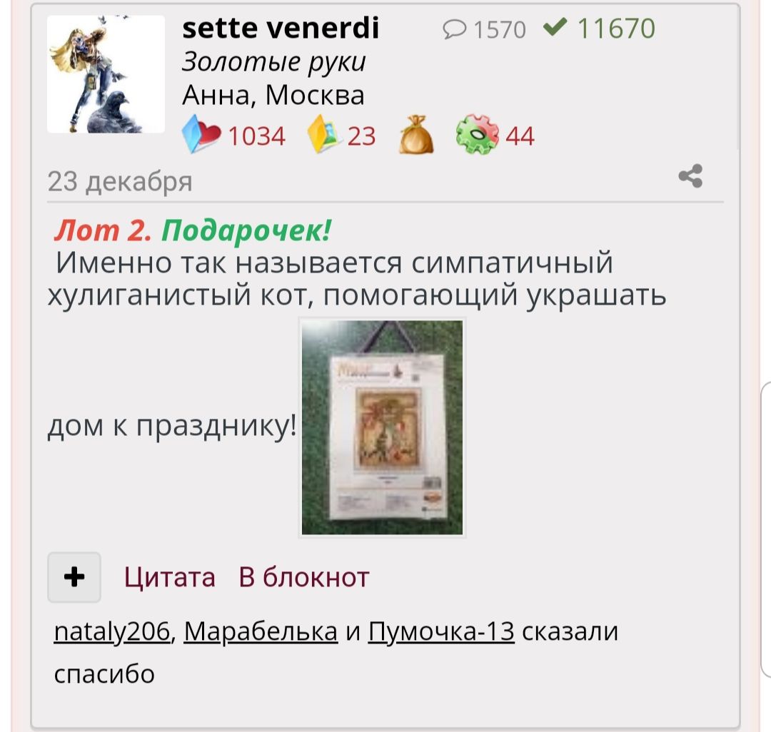 30 декабря 2019 Лот 2. Кот-помощник по кличке Подарочек. Также записалось три человека: Наталья, Марина и Ольга Крутим виртуальный барабан, и.. Рандом выбрал участника под номером 2. Марабелька, Марина! Поздравляю! nogres, Nata_Struchkowa, Пумочка-13 и 7 других сказали спасибо Поделиться сообщением Ссылка на сообщение