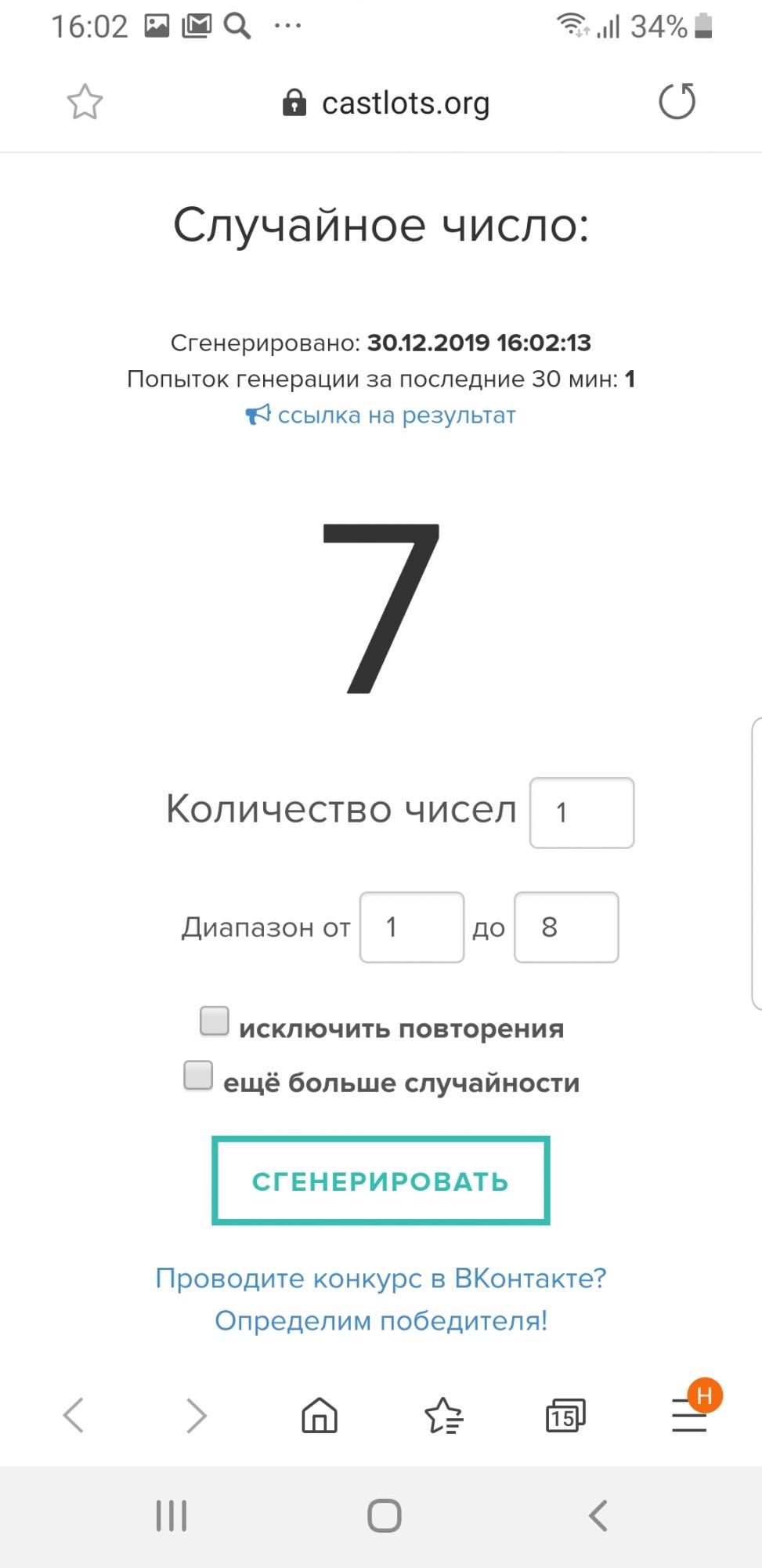 30 декабря 2019 Лот 3. Маяк. Здесь многолюднее) 8 человек, пооядковый номер так же, в порядке проставления "спасибо". От Натальи к Татьяне. Крутим виртуальный барабан, и.. Рандом выбрал участника под номером 7. Nata_Struchkowa, Наташа, поздравляю! Мини-голдик твой! Nata_Struchkowa, nogres, mamatata и 7 других сказали спасибо Поделиться сообщением Ссылка на сообщение