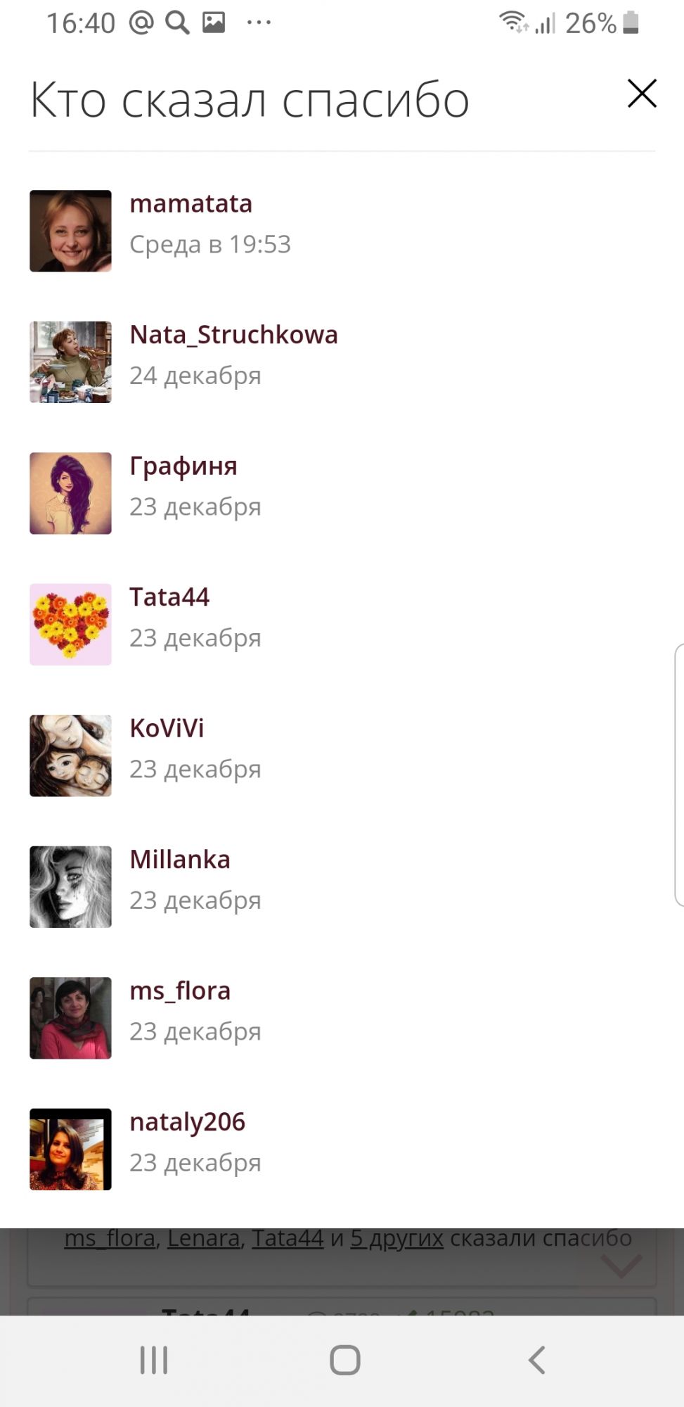 30 декабря 2019 Всем большое спасибо, за участие! В канун праздника хочется делать больше подарков и дарить больше тепла! Вика, Марина, Наташа, поздравляю Вас! План-передачу подарка обсудим в личной переписке Постаралась всё сделать за одну минуту, но написать быстро не удалось. Кого сегодня рандом прошёл мимо, пусть вдвойне порадует наступающий год! Tata44, Пумочка-13, mamatata и 9 других сказали спасибо Поделиться сообщением Ссылка на сообщение