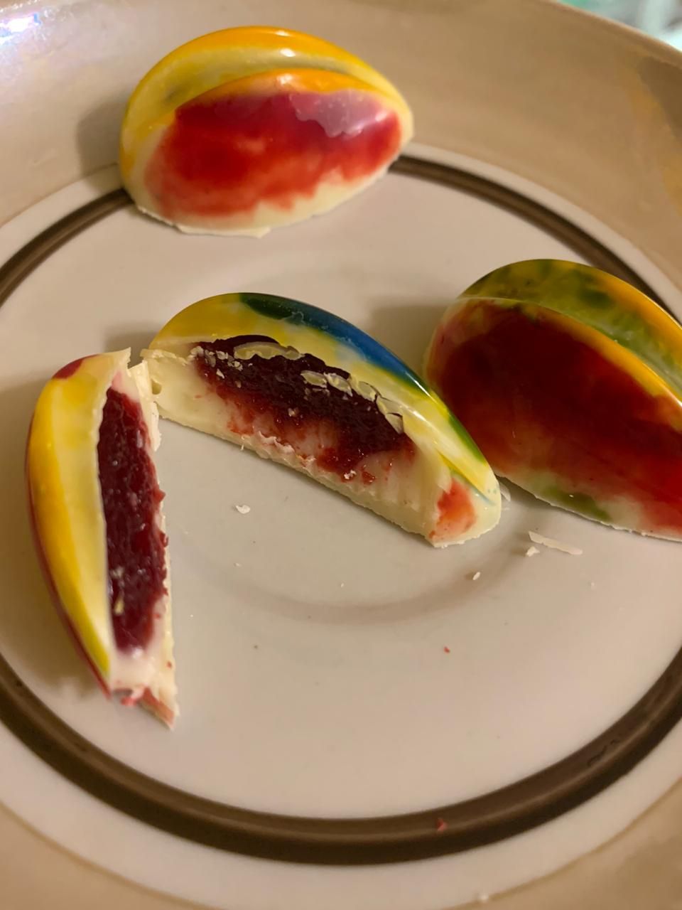 27 января 2020 Всем здравствуйте! Я принесла отчёт(ик) 1. Риолис. Букет полевых цветов. И ещё два дня, и, кажется, есть немного прибавки... Уважаемые модераторы! Валя, пожалуйста, добавьте в гаечку все три фотографии. Было: Стало: Я-молодец! 2. Crystal Art. Гербера. Брошь. Не знаю как там некоторые вышивают "начала и не успела заметить, как закончила. Поэтому нет фото". Я так не умею. Я и ошибиться успела, и фото наделать! Итак, что в наборе: Два кусочка фетра с нарисованными контурами. Один, для броши,-толстый, другой -для задника- тонкий. Бусины и бисер. Всего с запасом. Крупных бусин по одной, средних-по две, а бисера чуть не половина осталось. Так что материалов достаточно. Приступила к сборке: начала красиво . Потом зашила центр и начала вырезать, и.. отрезала нитки, на которые крепятся бусины: Сама виновата-не правильно их пришила, учту на будущее. Но с обрезанием фетра не всё так гладко. Чем его резать? Портновские ножницы велики, рукодельные малы-фетр толстый, мне цапельки жалко. В итоге приспособила под это дело рукодельные из запасов. Но и то справилась, потому-что бусин рядом с краем не было. Но отрезала не ровно, а с каким-то косым срезом. Верхняя часть фетра по контуру, а изнанка меньше Внутри броши картон-его в набор не кладут. Деталь должна быть на 3 мм меньше основной детали. Только что-то у меня эти зубчики, пока "на глаз," уменьшались от шаблона, перестали ему соответствовать Конечно, я всё собрала в результате... На задней детале нужно было прорезать отверстия под крепление, я сделала сплошной разрез, не лукавля. и заштопала его "декоративно" Не совсем понятно, как приклеить булавку к картону, я пришила Не могла решить чем пришивать бусины. В итоге, крупные пришила нитками для бисера (испробовала их заодно), бисер-мононитью (так привычнее), а с внешней стороны, отделочные работы- мулине под цвет.. Ну и повторго пришитые бусины - тоже мулине. Так, вероятно, правильнее, встречайте: Ошибки разобрала, постараюсь учесть. Ещё я хотела показать творчество жены одного из моих братьев. Похвастаться, так сказать... Около года назад она начала осваивать изготовление шоколада, конфет, пироженных в домашних условиях и вполне удачно. Но вот конфетки из последней партии меня просто очаровали: По-моему, очень красиво!! То что вкусно и безвредно- это само собой, но мне эстетическая сторона приглянулась очень)))) На этом сегодня всё! Спасибо, что заглянули))) Кисуля, Путешественница, Графиня и 23 других сказали спасибо Поделиться сообщением Ссылка на сообщение