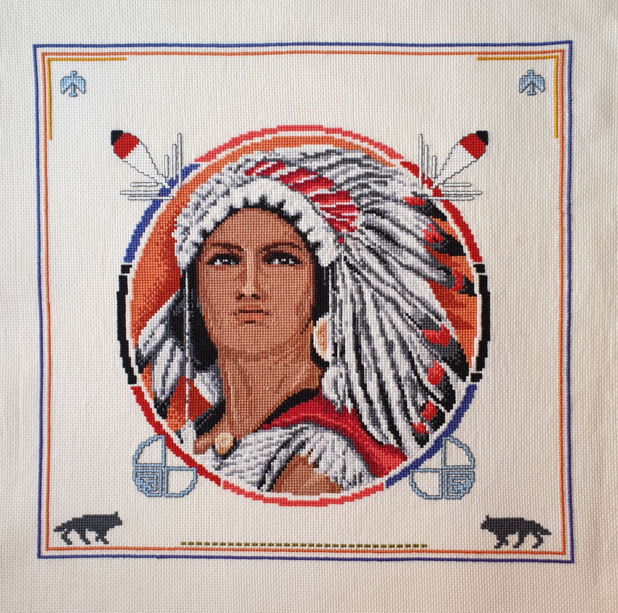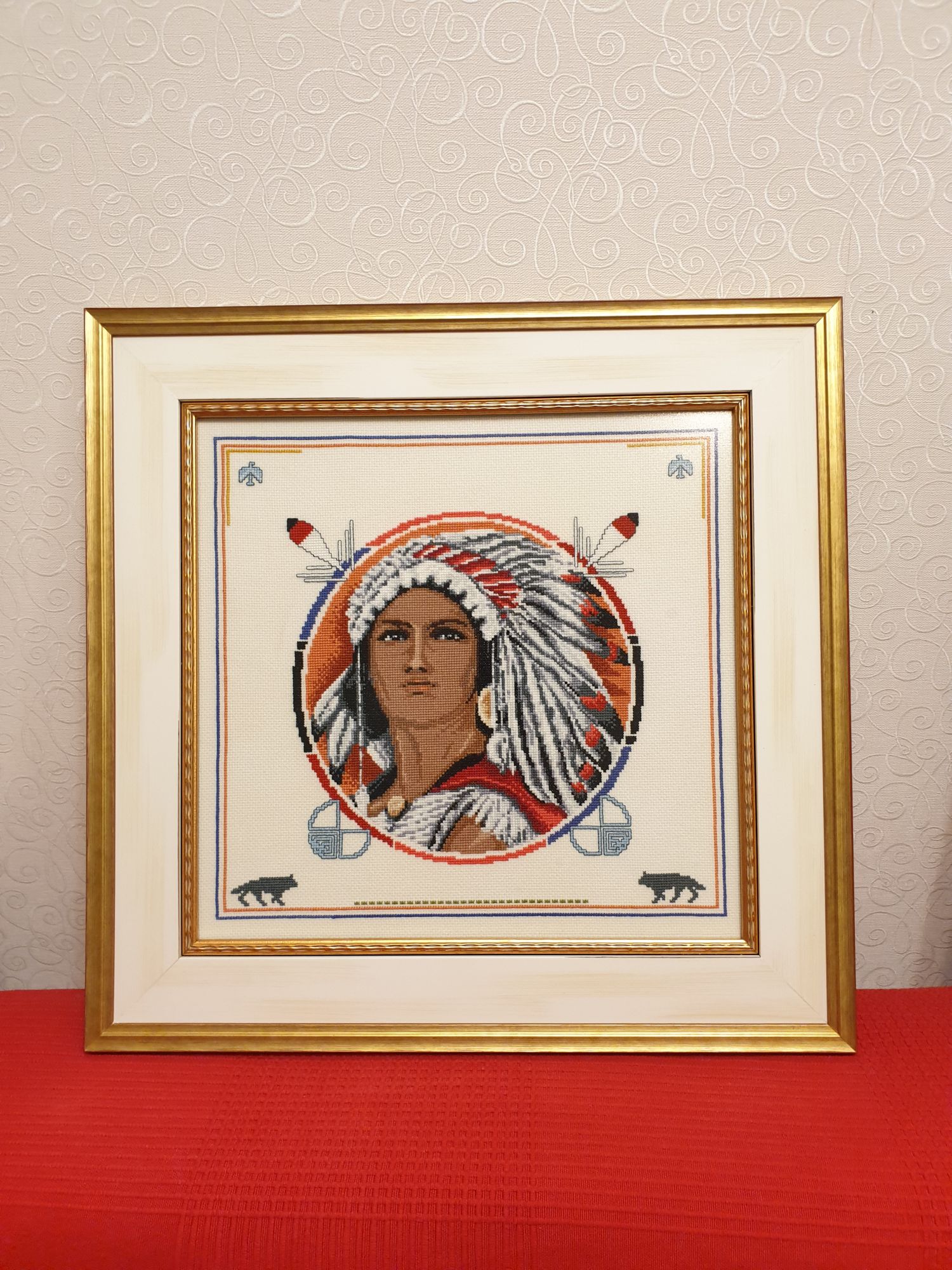 8 февраля 2021 В общем, тему Индейца закрываю! И отношу его к итогам прошлого года. Потому-что вышит, доработан и оформлен (рама сделана) был в прошлом году. Технические недочёты устраню потом. Когда-нибудь. Возможно... Итак, мой вариант рамки: Решила обойтись минимумом цветов и символики. Рамка в одну клеточку -бизонья тропа, пунктир - бизоны, волк и орёл. Ну и в багете: На пьяную бизонью тропу не смотрите. Это какая-то оптическая иллюзия на фото. Сейчас я заснять иначе не могу. Рядом с подругой на стене сфотаю завтра. ОльгаТольна, Nata_Struchkowa, Графиня и 13 других сказали спасибо Поделиться сообщением Ссылка на сообщение
