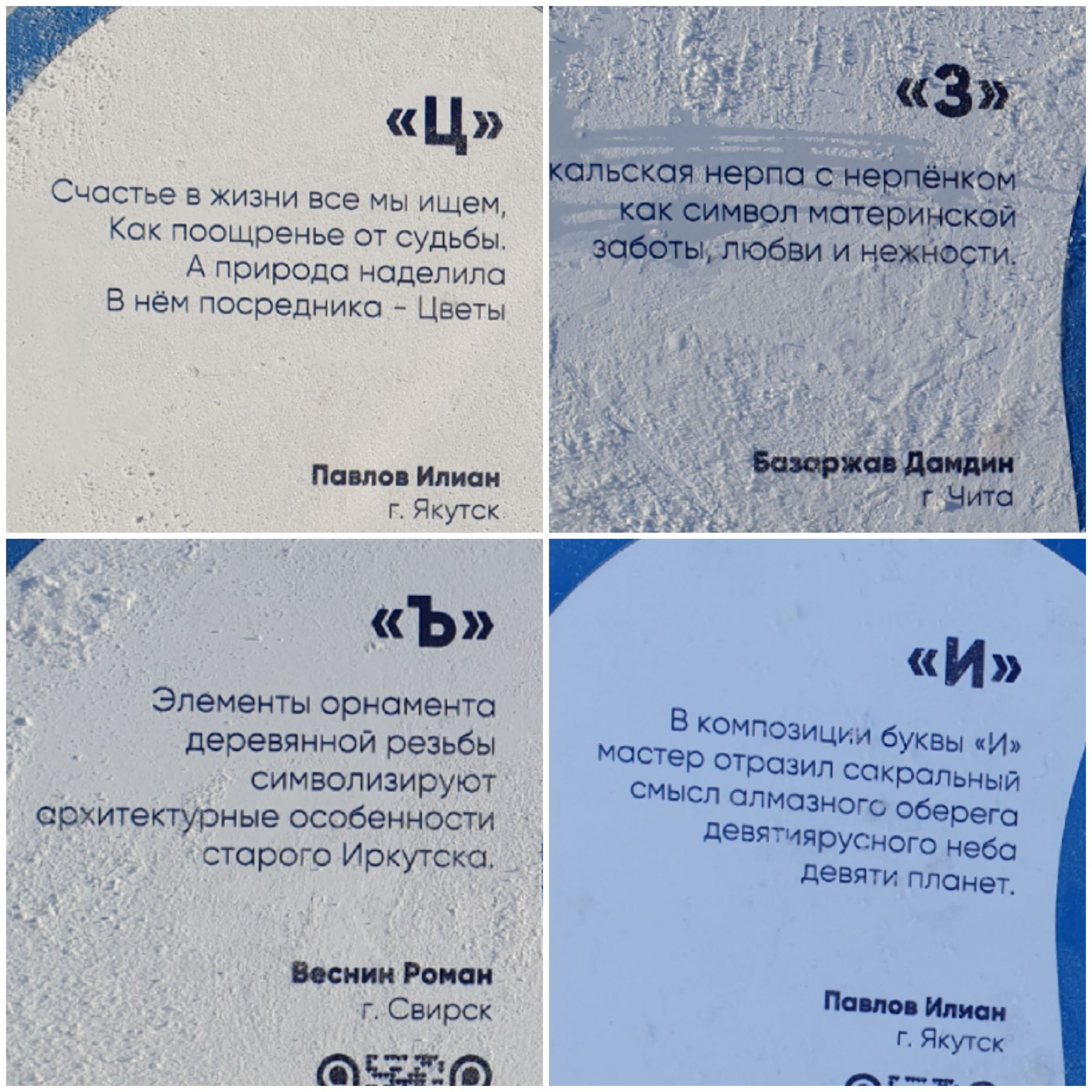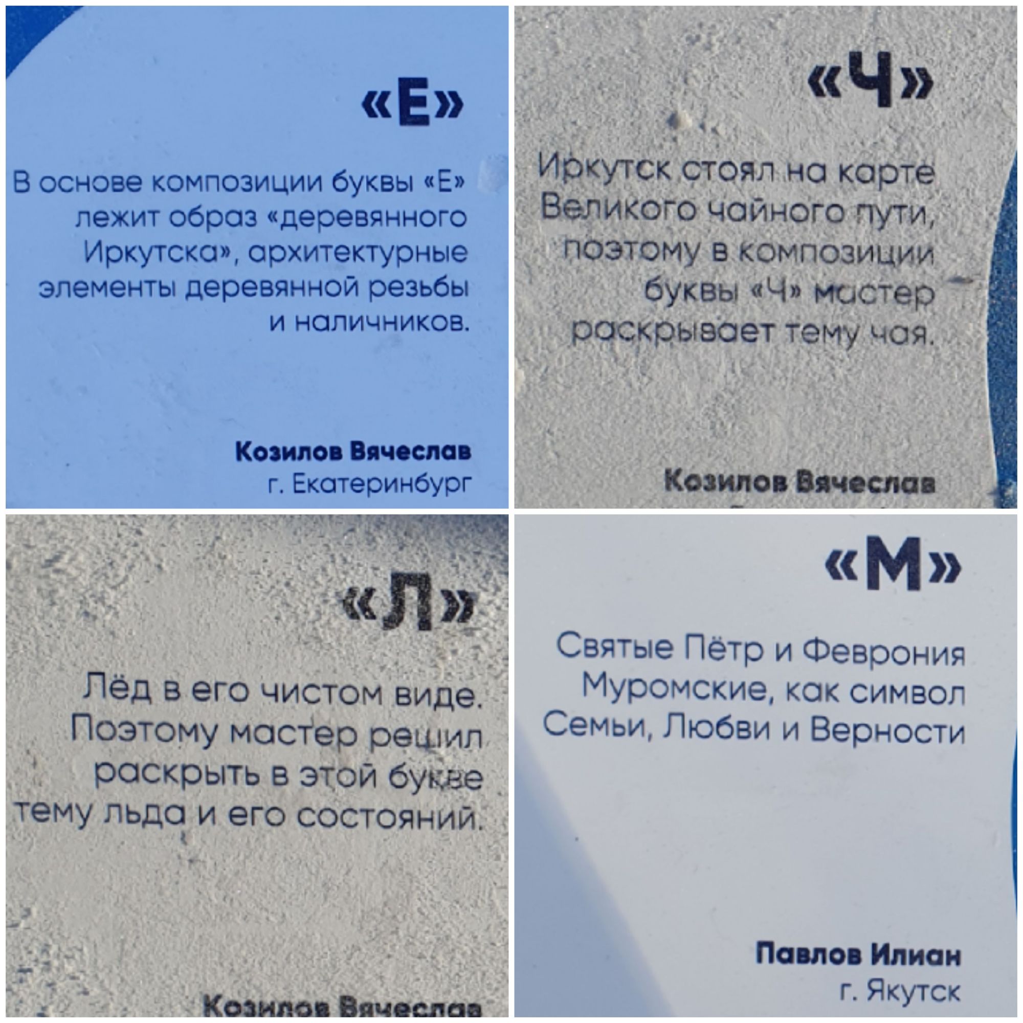 6 января 2024 Сейчас немного путешествий. Из интересного хочется рассказать о фестивале ледовой скульптуры "Иркутский алфавит". Совершенно потрясающая идея, хотя на моих фото всех нюансов не разглядеть: В букве "Н" заложена символика буддизма: Будда в центре и 8 символов. Победителем фестиваля признана буква "Р", посвящённая творчеству Валентина Распутина Какую-то букву я пропустила, кажется, "ь" ндяяя.... Спасибо что заглянули. Солнышка вам и счастья! Забава_, nogres, TheSunniestDay и 10 других сказали спасибо Поделиться сообщением Ссылка на сообщение