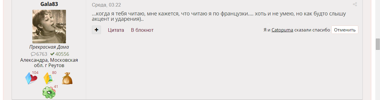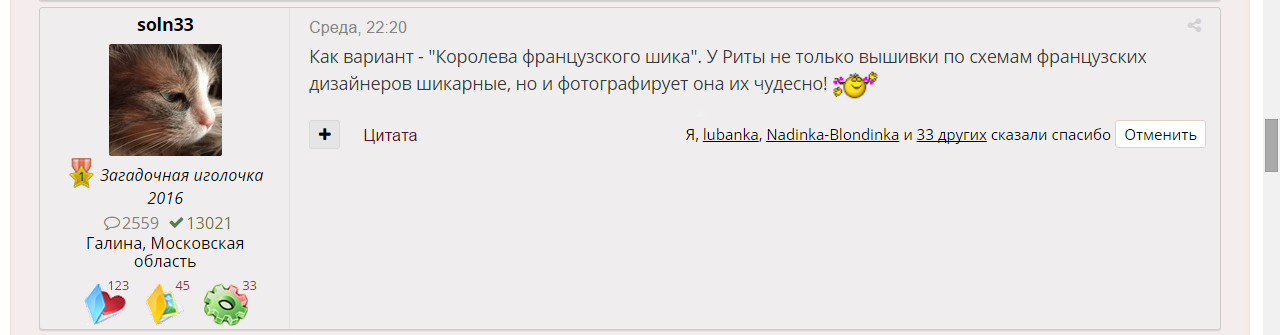 9 сентября 2017 А дело было так Саша @Gala83 написала в моей теме это сообщение которое непостижимым образом вдохновило Олю @maui проявить инициативу для присвоения мне почетного звания а Галя @soln33 придумала красивейшую фразу - великолепное звание Сашуля, Олечка, Галечка, большое-большое вам спасибо за такое море позитива, радости и счастья! Девочки, все кто голосовал, я очень-очень вам благодарна, особенно меня удивили и обрадовали те девочки, чьи ники я увидела впервые, с кем я здесь не знакома, это очень приятно, спасибо вам и, конечно, еще раз спасибо моим любимым подружкам которые здесь всегда со мной и без которых я уже просто не представляю себя ни здесь, ни вообще в моем творчестве teresa, maui, soln33 и 16 других сказали спасибо Поделиться сообщением Ссылка на сообщение