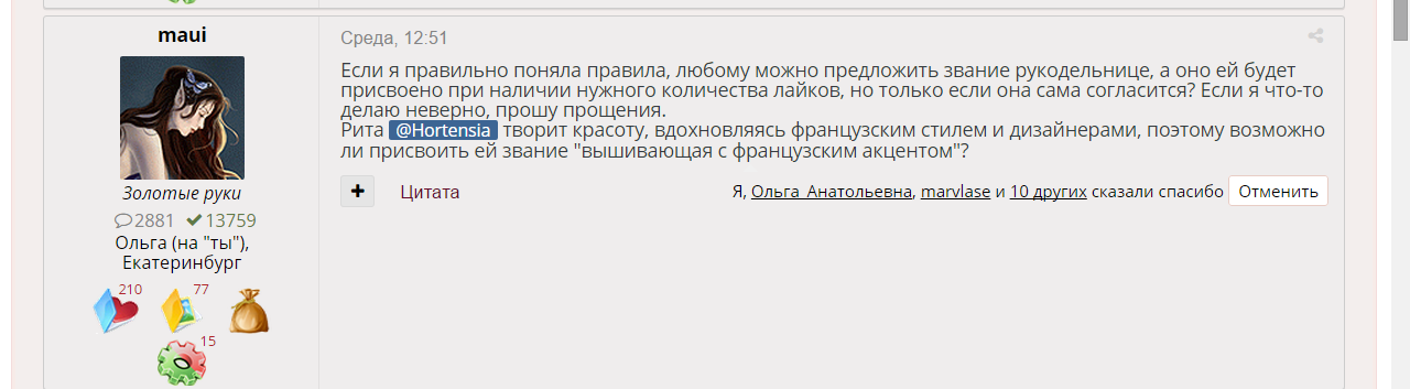 9 сентября 2017 Не могу не отметить в своей теме, что сейчас, в эти дни творится история моей форумной жизни, происходит знаковое в ней событие - девочки присваивают мне почетное звание!Звание уже сформулировано и необходимые 30 голосов и даже больше уже набраны, остается подождать 3 дня и если никто ничего не испортит не предложит альтернативных вариантов, то выбранное звание будет мне присвоено! Ой мамочки, оно такое красивое! И пусть это всего лишь наши дамские развлечения, но поверьте, столько счастья и радости это приносит! Давно я не чувствовала себя такой нужной и любимой Спасибо вам, мои хорошие! Люблю вас! Обнимаю! Целую! ОлюшКа, nogres, Толика и 12 других сказали спасибо Поделиться сообщением Ссылка на сообщение