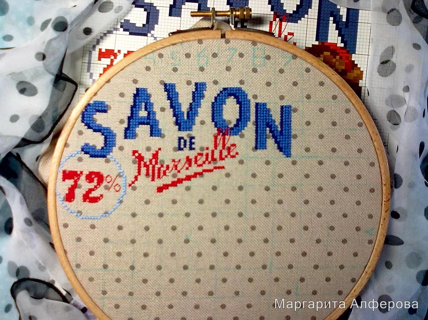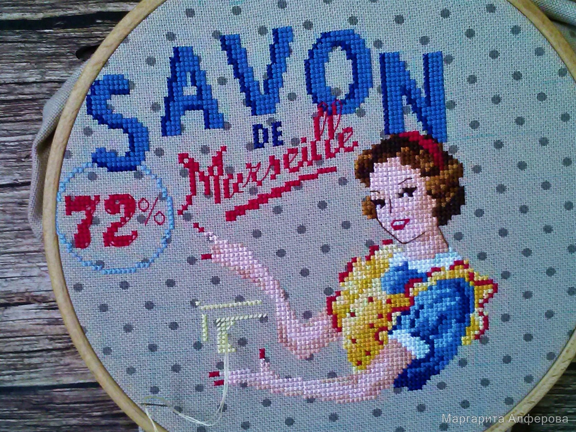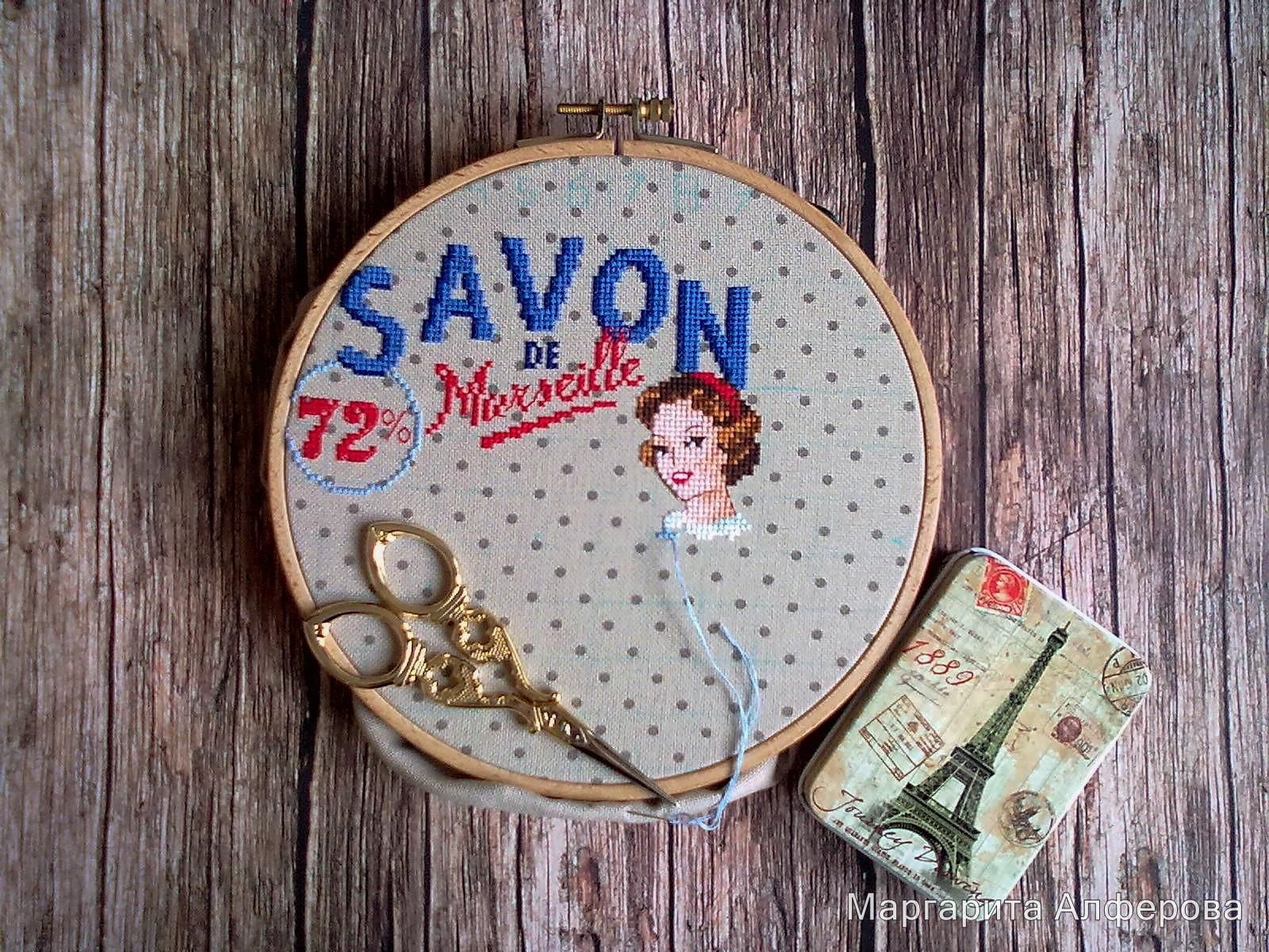 1 октября 2017 Привет - привет, мои дорогие! Как у вас проходит сегодняшний воскресный день? Вы уже готовы к наступающим трудовым будням? Что интересного вы успели за сегодня уже сделать и что планируете на вечер? Ой, у меня было столько планов на сегодня! Но на улице так сыро и холодно, в квартире не сыро, конечно, но тоже так холодно, что... брр... совсем ничегошеньки не хочется делать, а только спать, спать, спать... Да, мне вставать рано категорически противопоказано, а сегодня пришлось. Эх, вот теперь весь день и будет "спать, спать, спать..."! Ну что и на вас уже нагнала сонливость? Честно, я даже сейчас зевнула)) Все, делаю кофе и начинаю показывать что интересненького я вам сегодня принесла! Пришел мой долгожданный и любимый первый сборник лучших схем Вероник "Les plus belles creations de Veronique Enginger au point de croix"! В нем действительно каким-то чудесным образом собрано большинство моих самых любимых дизайнов! Даже не понимаю почему я только сейчас его купила? Вот - сокрооовище! А вот теперь два "сокровища" вместе И третье уже на подходе Угууу, будет еще и третье и, надеюсь, не последнее. Да-с, у кого-то золото и бриллианты, а у нас лен и книги! Обожаю! Влюблена всей Ритой в книги Veronique Enginger! Я уже писала, что больше всего у Вероник люблю серию Винтаж, с нее, собственно говоря, и началась моя страстная любовь к французской вышивке вообще и к Верноник Ажинер в частности. Не удивлюсь, если когда-нибудь я вышью все дизайны)) Не знаю как вас, а меня очаровывают все эти милые барышни на рекламных постах 50-х гг, аккуратненькие домохозяйки в кружевных передниках на тонкой талии и платьях в стиле "нью-лук"! Да, конечно же, заговорила я обо всем этом не случайно Еще летом я начала вышивать "Марсельское мыло". Точнее вышить его я хотела всегда, но никак не могла найти подходящий фон. Просто на белом, однозначно, нет. Некоторые вышивают на голубой клеточке, не плохо, но опять что-то не по мне. Этот дизайн вообще очень самостоятельный, такую картинку куда попало не прилепишь - не пришьешь. И так меня и одолевали сомнения пока Юля @apanjul ни подарила мне бежевую Мурано в горошек хаки. Как только я ее увидела, все! Как говорят, пазл сложился! То что надо! Она же один в один как винтажные обои - припыленный цвет, горошек, обои такого цвета очень часто видно в американских фильмах тех лет. Я несколько лет думала об этом дизайне и неужели теперь меня могло что-то остановить?! Не было цели вышить его быстрее, отложить все остальное и т.д., нет, я просто потихонечку начала его вышивать, по нескольку дней, раз в неделю и как-то вот так не заметно получилось, что в отличии от всех остальных начатых процессов этот уже подходит к концу. А раз уж сегодня я вам показываю мой новый сборник схем В.А. на обложке которого красуется "Марсельское мыло", то значит и процесс показывать самое время! Пожалуйста, встречайте! Veronique Enginger "Savon de Marseille" Думаю, все знают где находится прекрасный Марсель и он не нуждается в представлении. Если только несколько фото Марсельское мыло. Нет не так. Легендарное Марсельское мыло. Многовековая история, идеальное качество, я хотела написать о нем подробно, но потом подумала, что не буду утомлять вас историческими датами и хвалебными одами, а тоже просто покажу фото, в которых вы сами все увидите Сегодня а вот любимый винтаж, даже затрудняюсь сказать какие это годы И особо умиляет А теперь выливаю ос